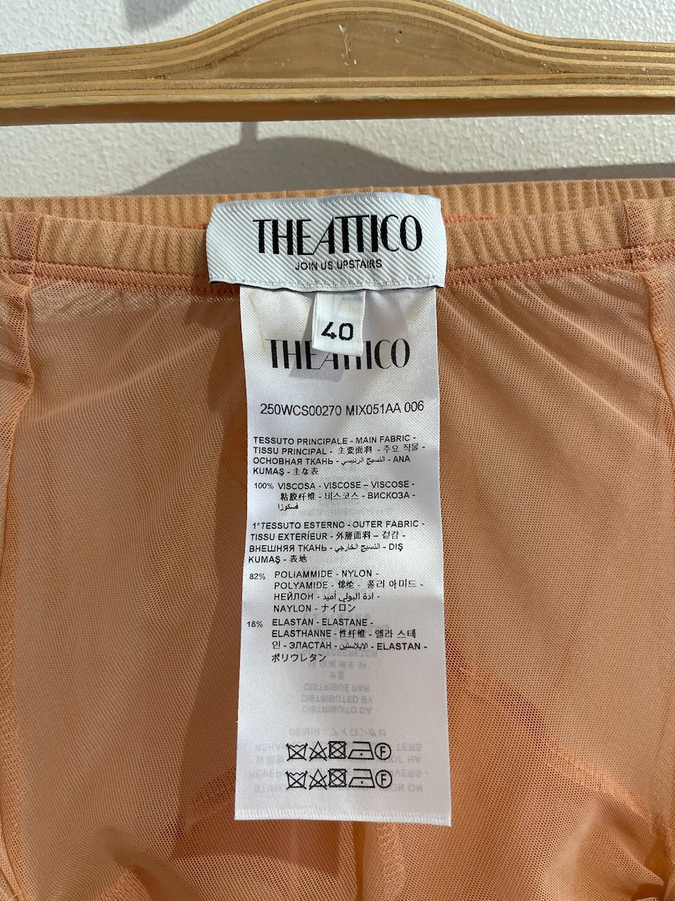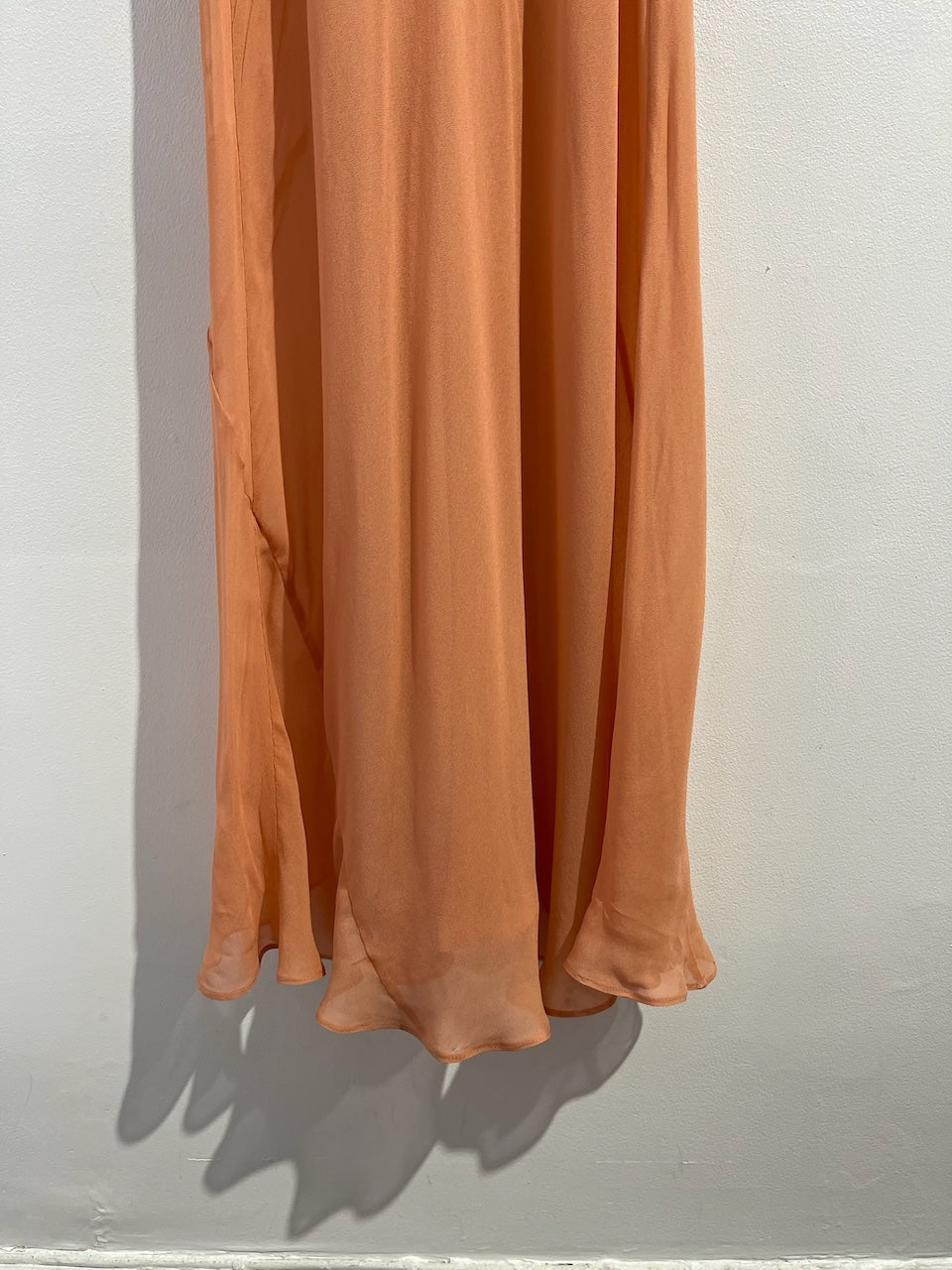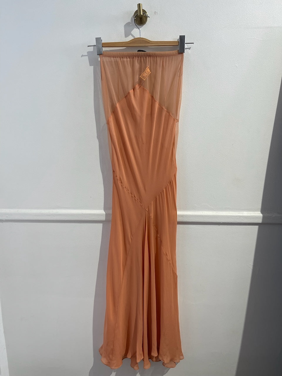 Jupe longue en polyamide orange pâle avec détails de transparence et effet noué à l'avant. Taille élastique.
