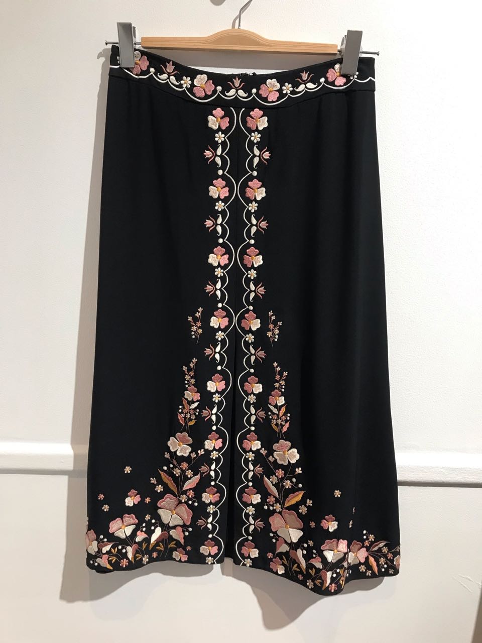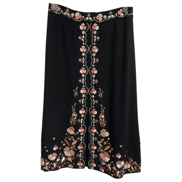Jupe mi-longue noire avec broderies.