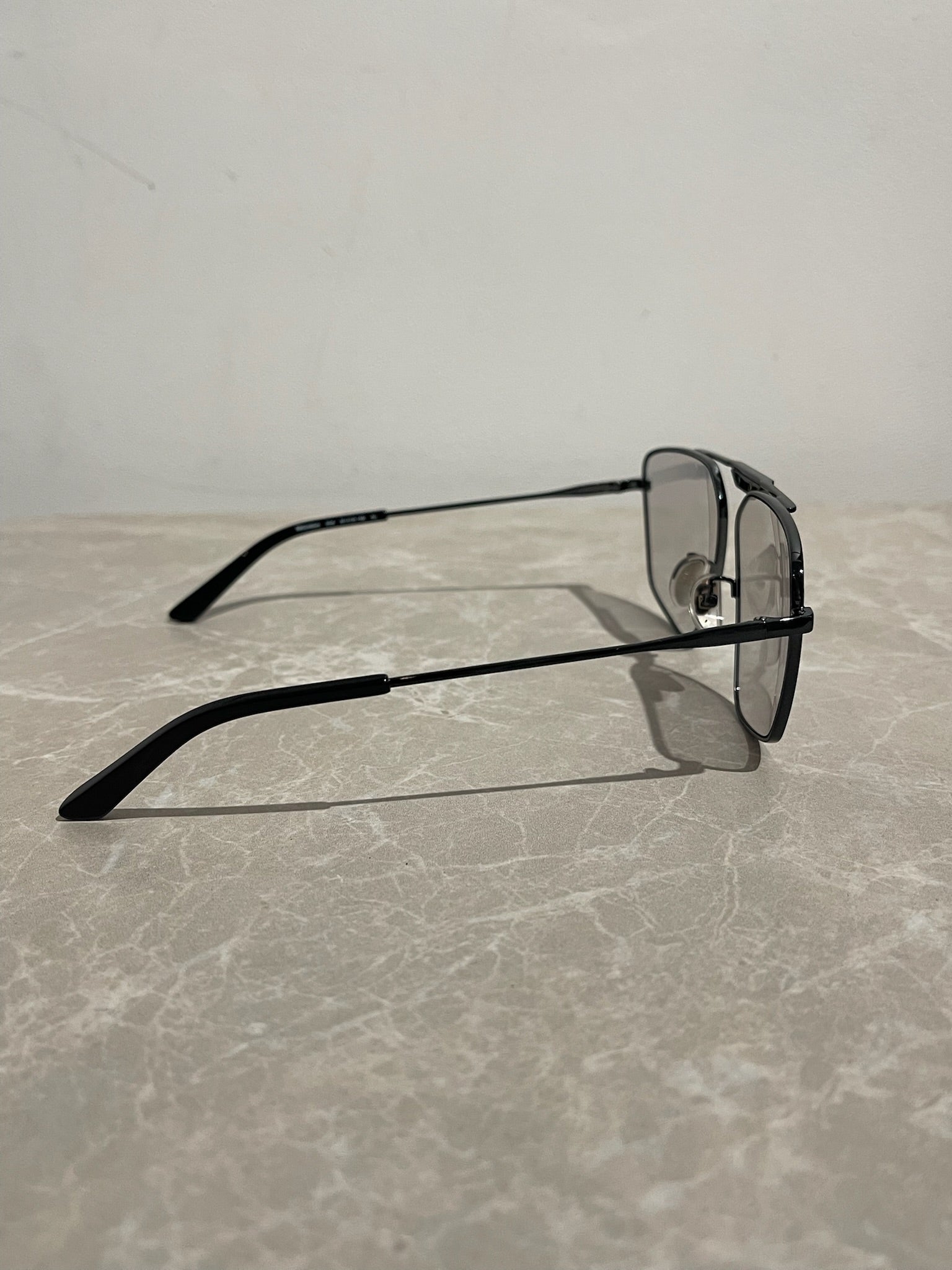 Lunette de soleil, forme aviator, avec monture fine, métal coloris argent et verres gris clair effet fumé.