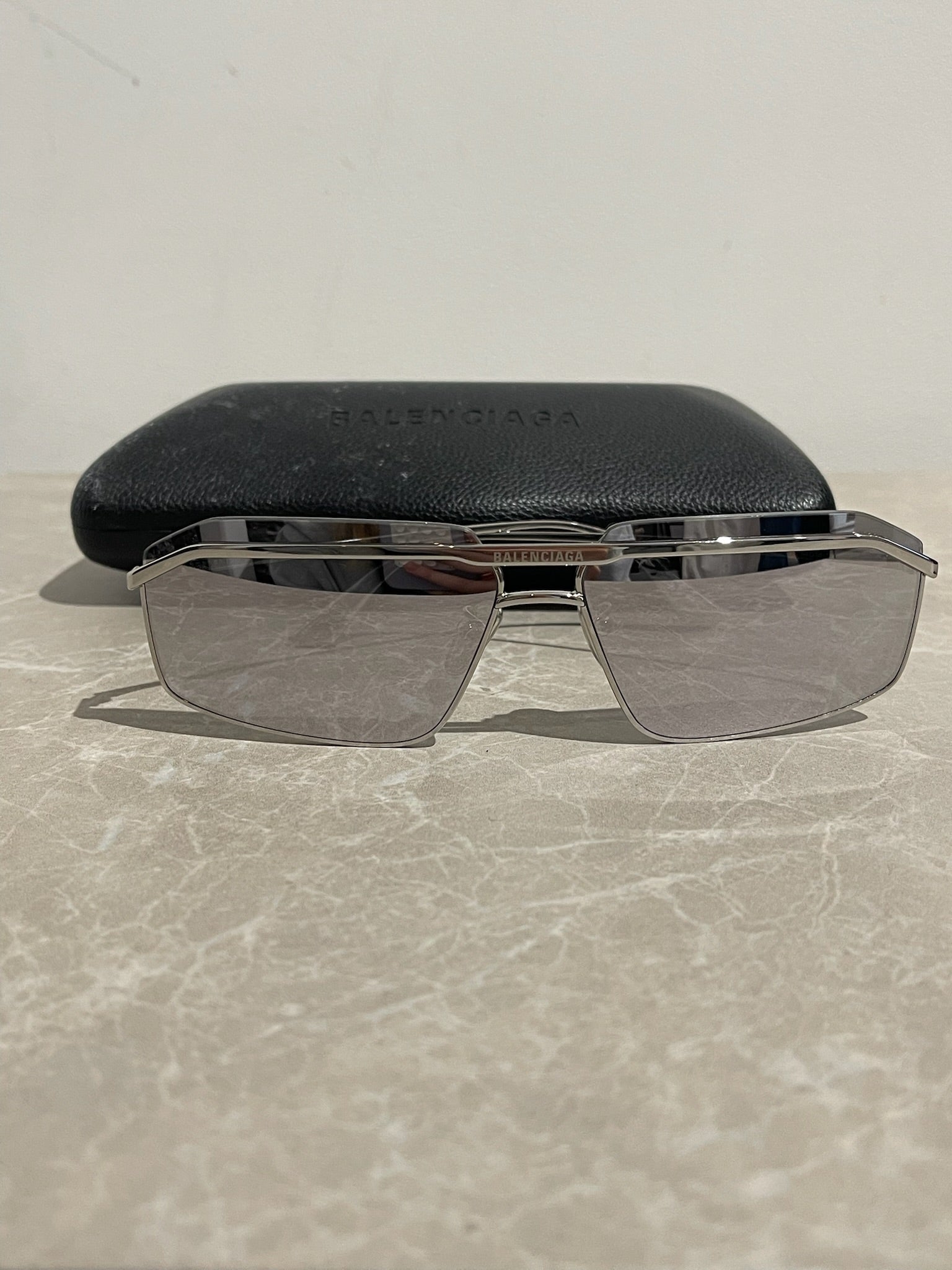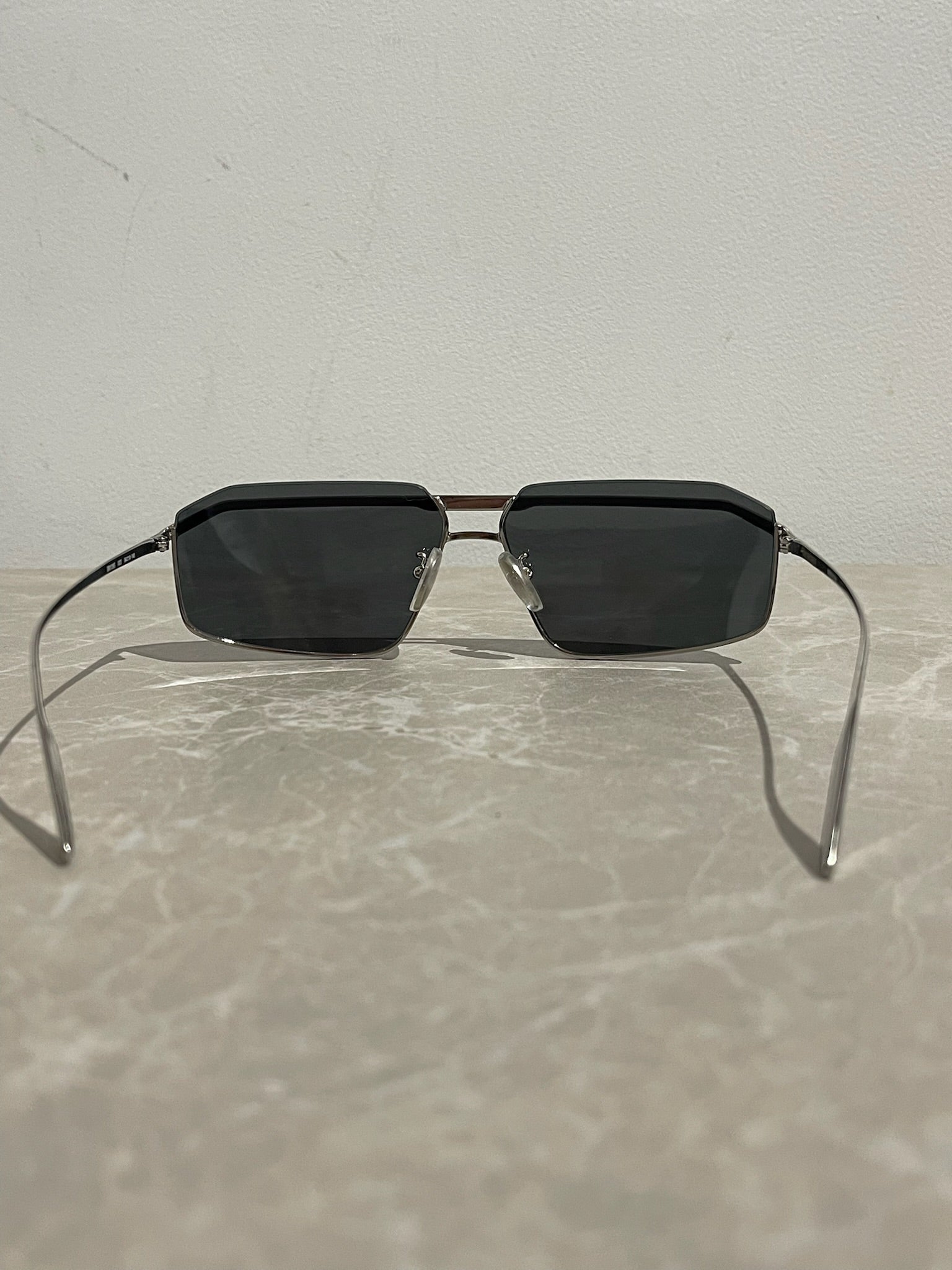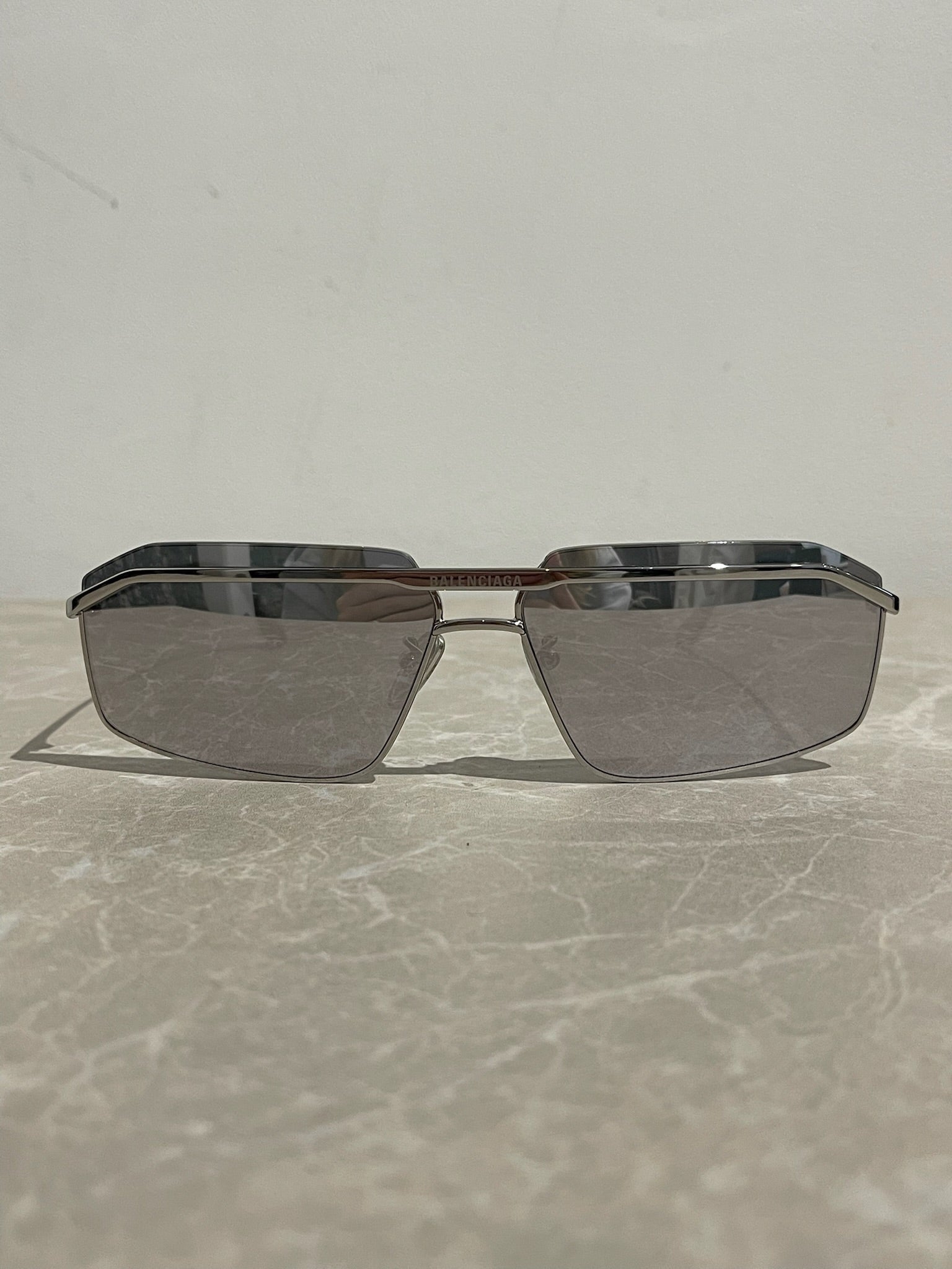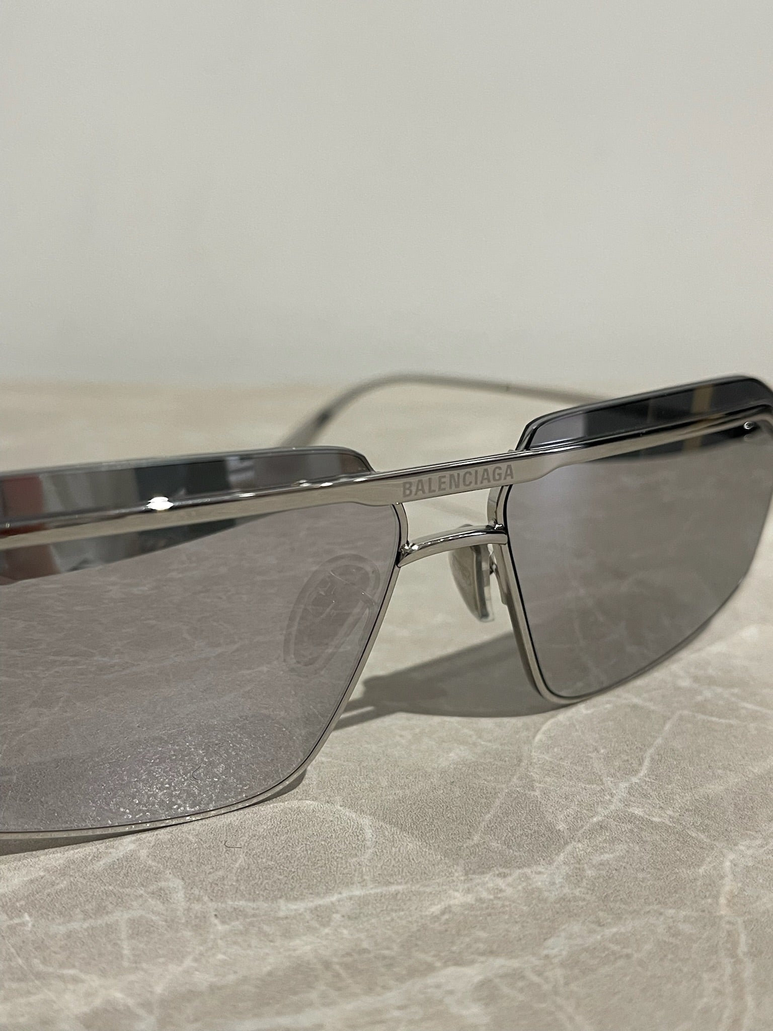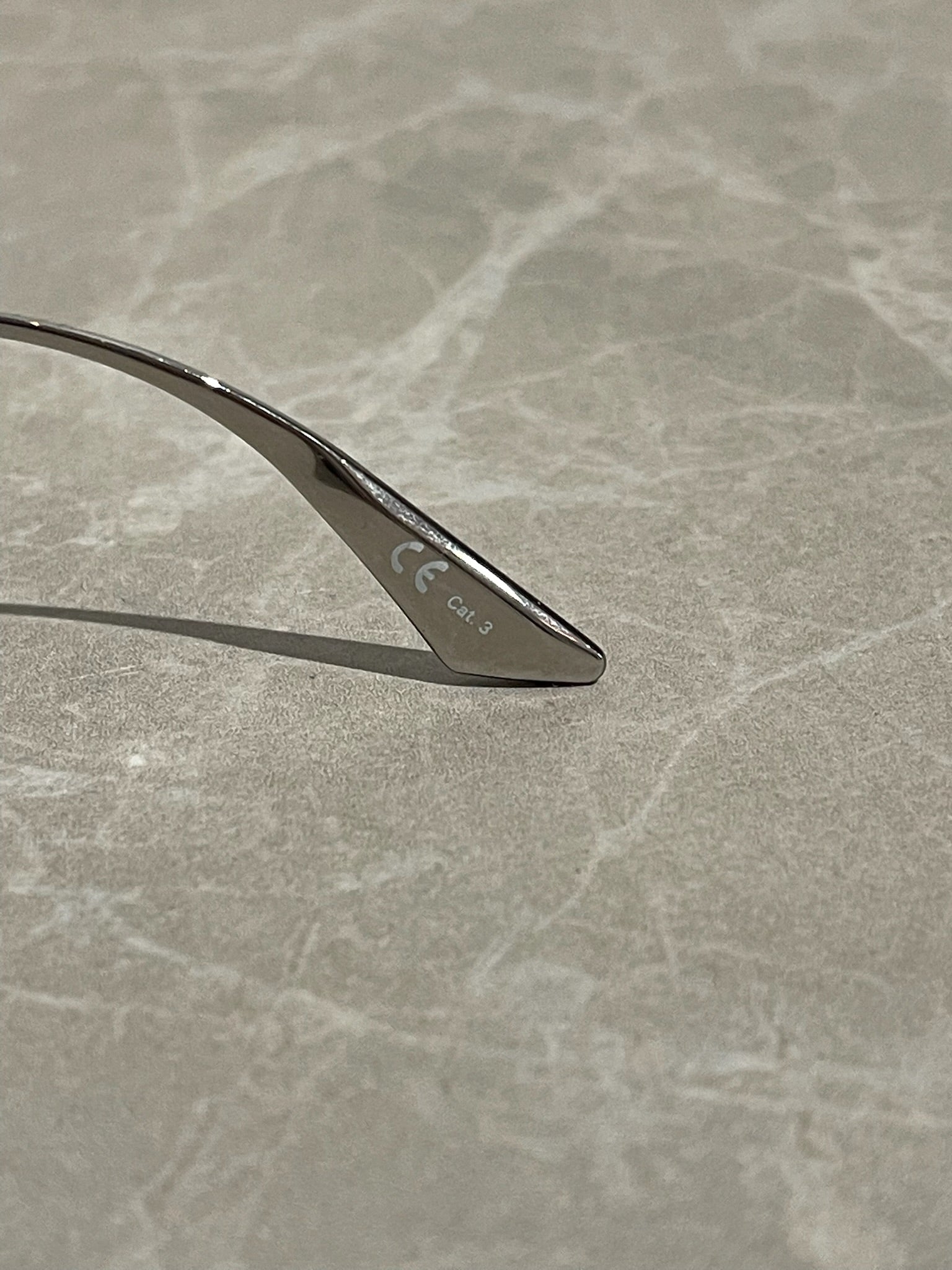 Lunette de soleil avec monture fine en metal argent, verre argent effet miroir.