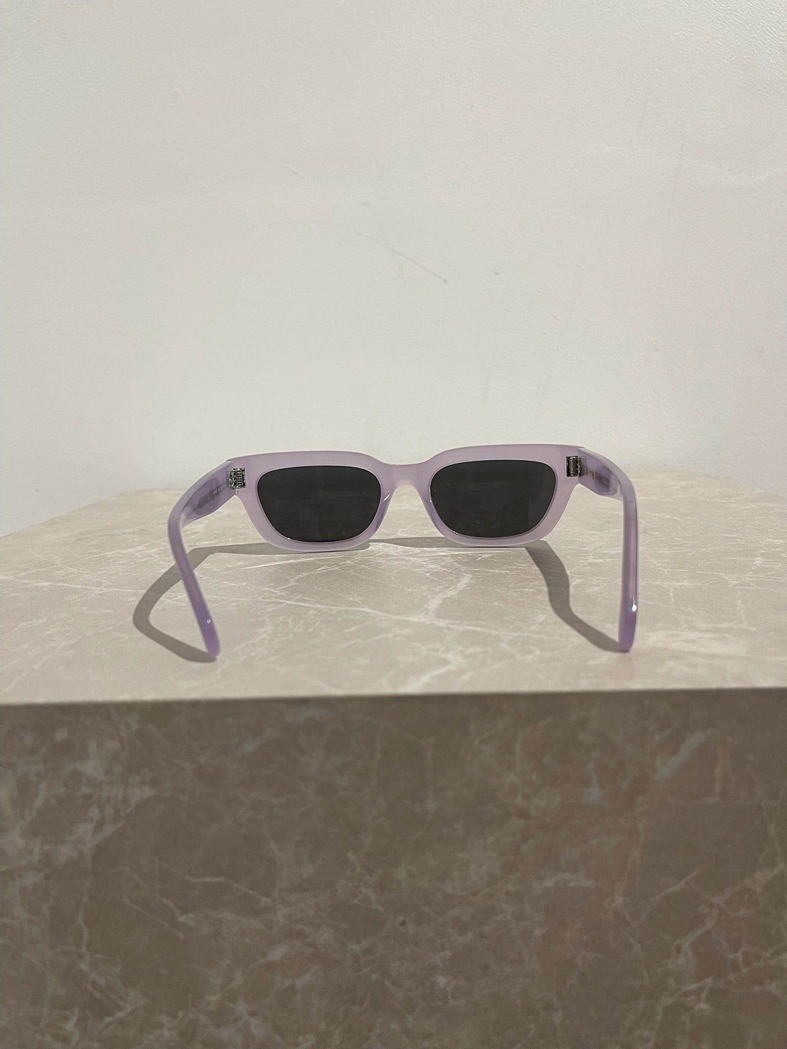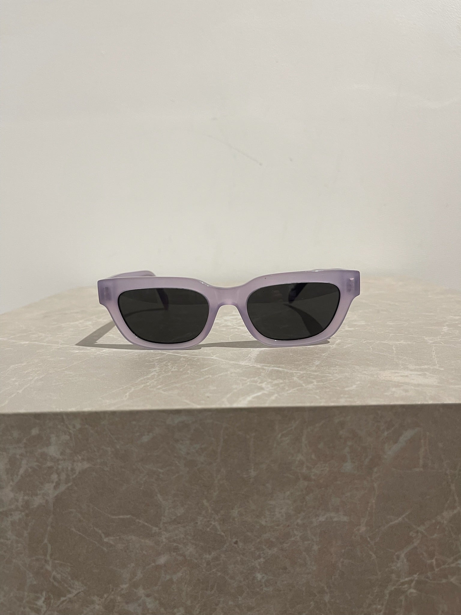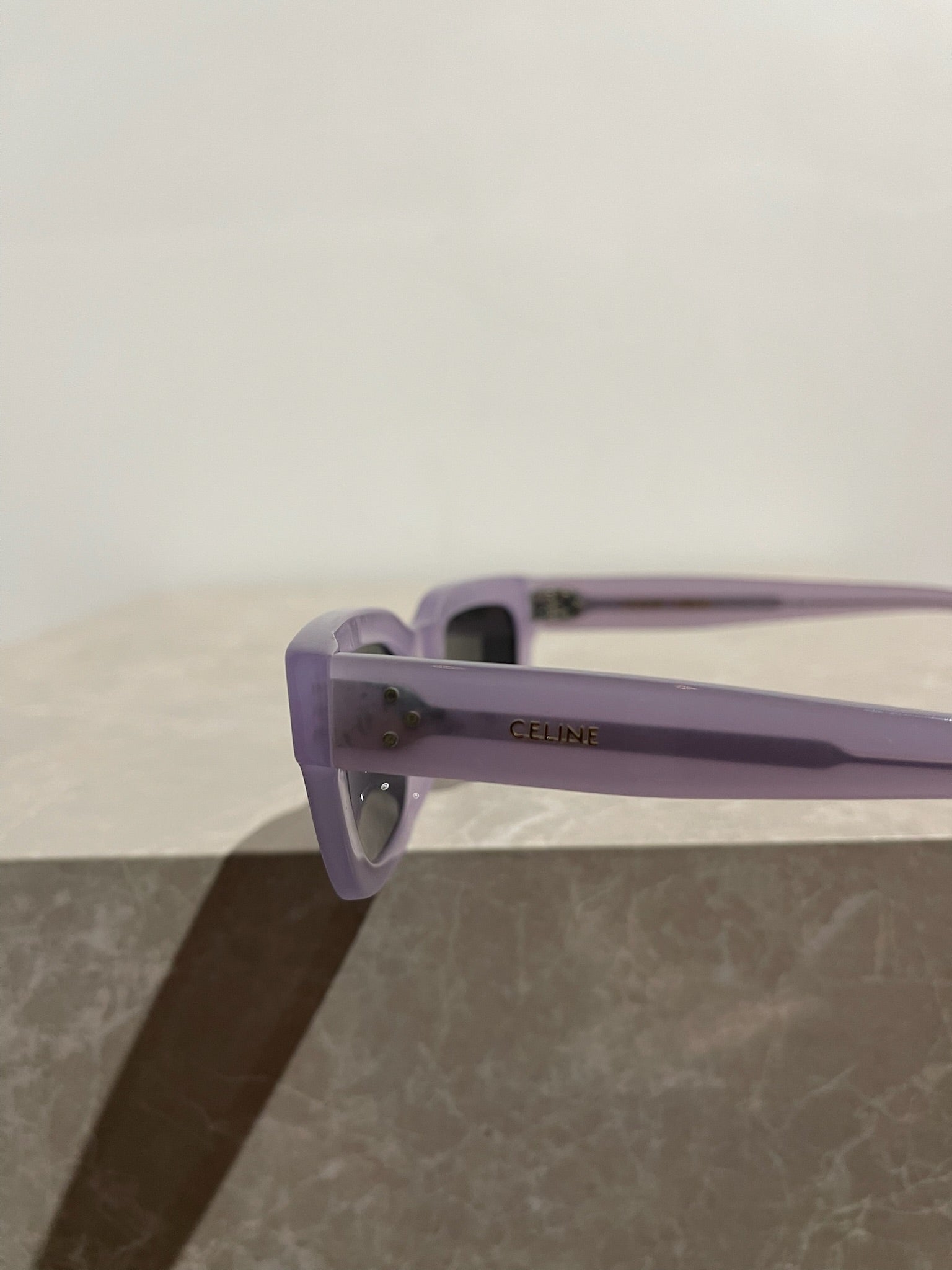 Lunettes de soleil en acétate violet transparente, monture forme cat-eyes et verres teintés noirs. Branches signées du logo CELINE doré.
