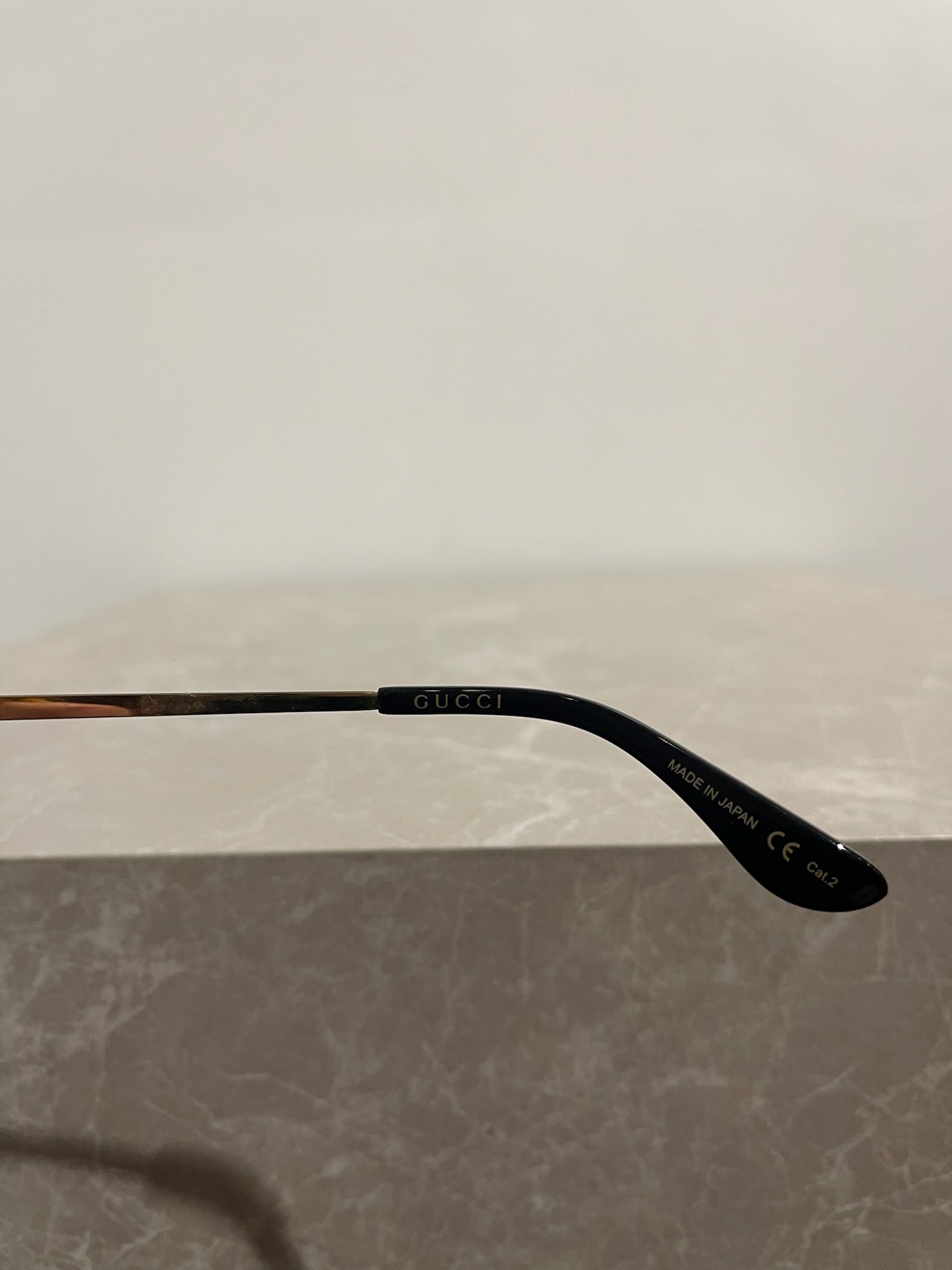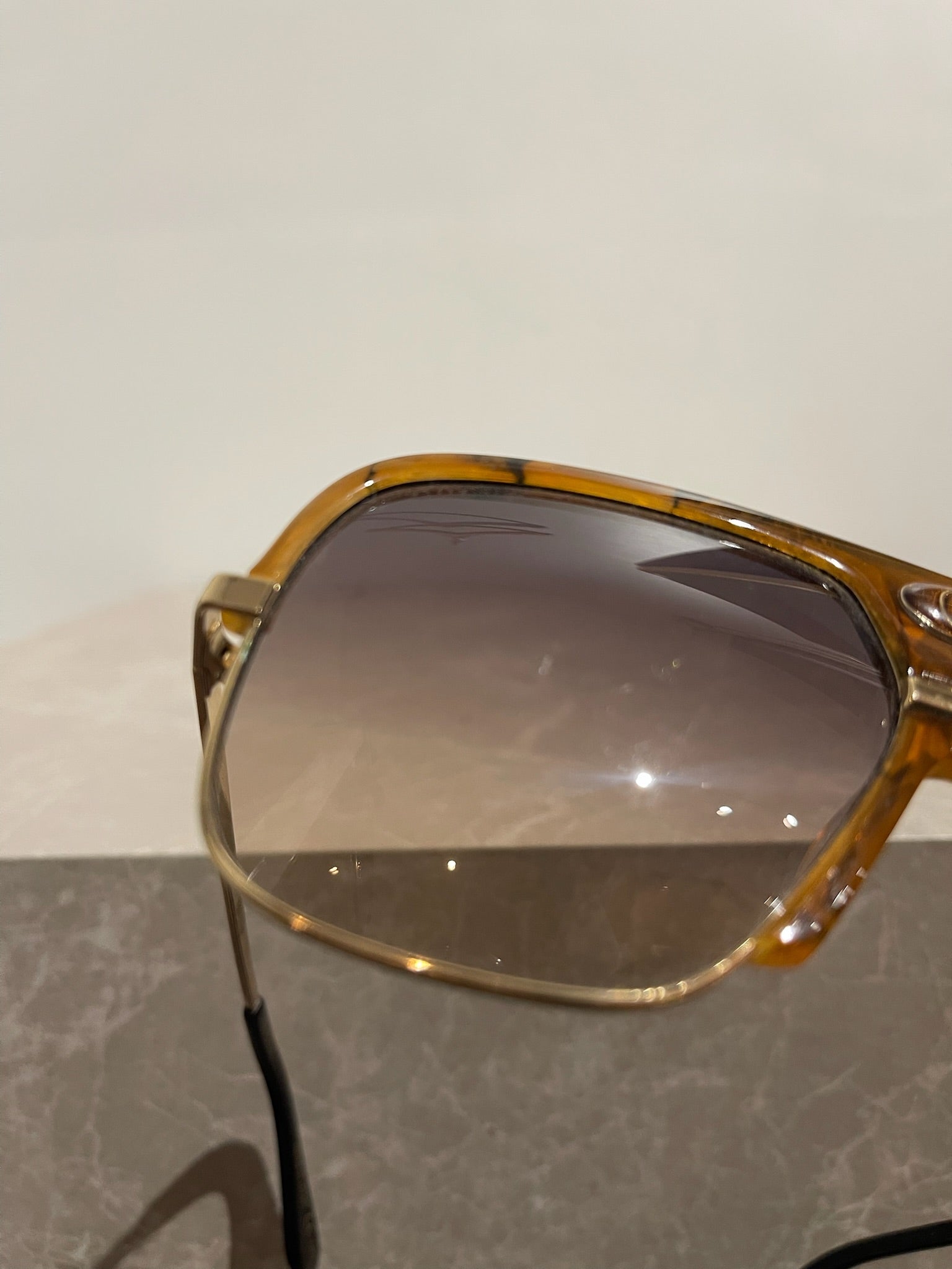 Lunettes de soleil style aviateur en acétate écaille marron et métal doré. Verres bruns dégradés. Logo gravé sur les branches. Embouts de tempes en acétate noir