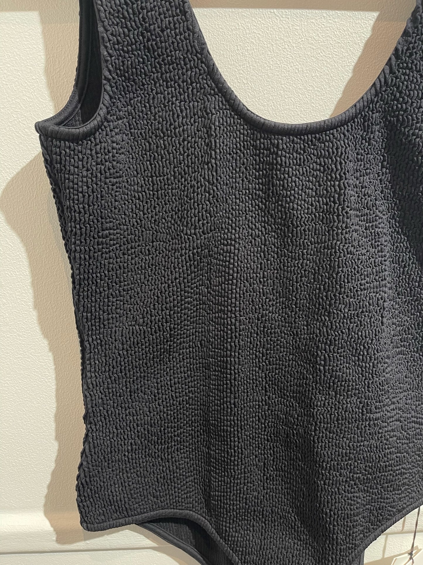 En polyamide côtelé stretch noir avec bretelles et dos échancré.
