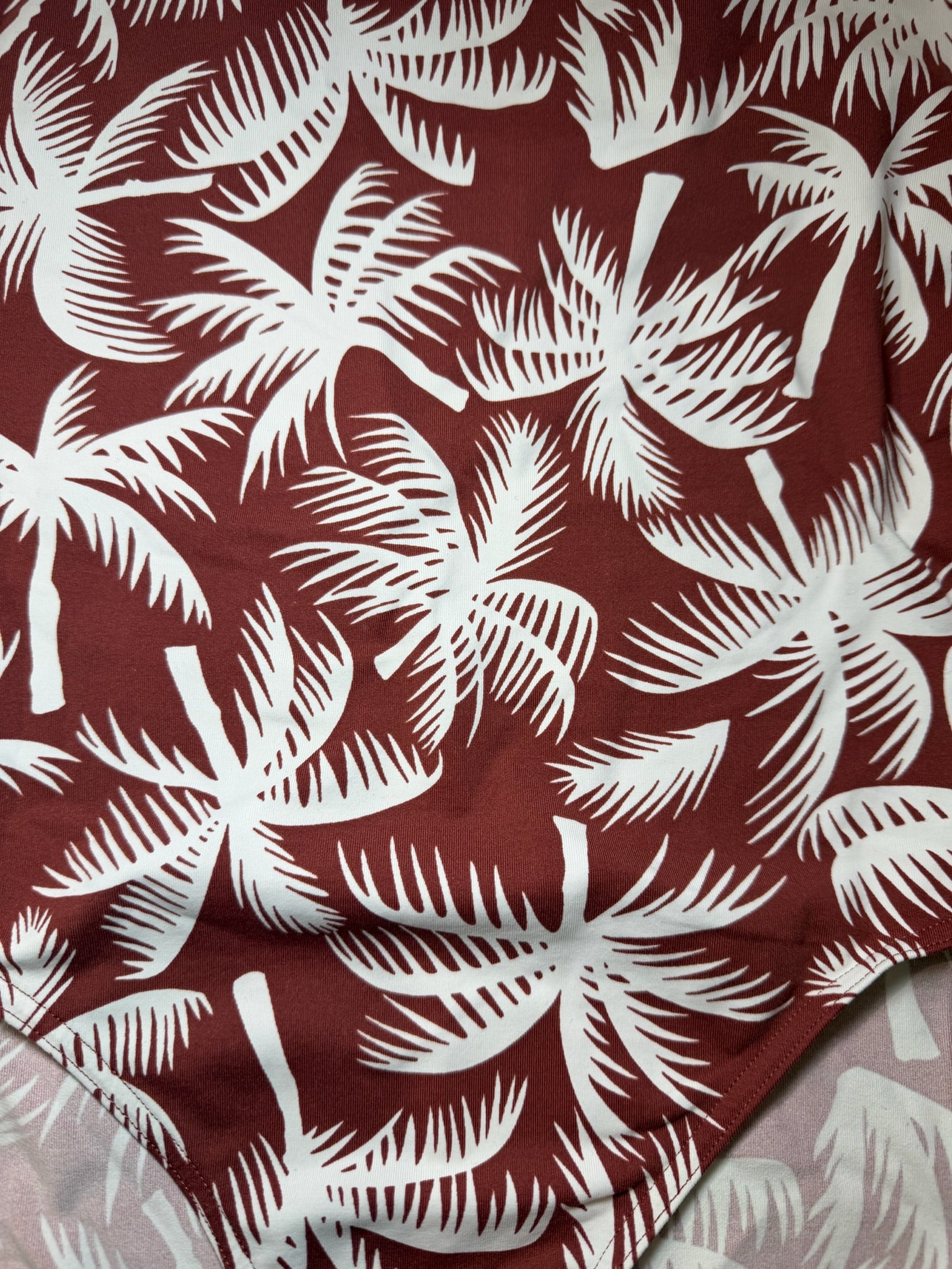 Maillot une pièce en polyamide marron avec imprimé palmier blanc. Col droit et bretelles fines.