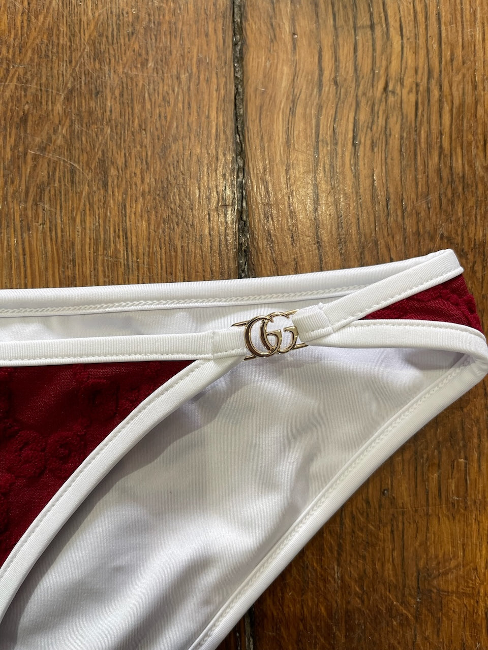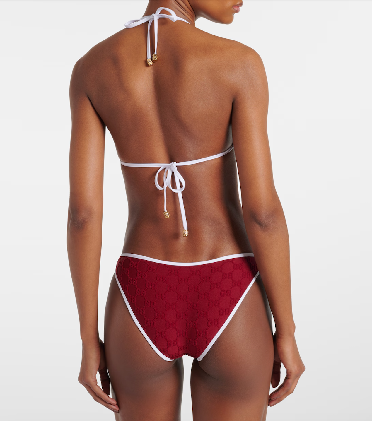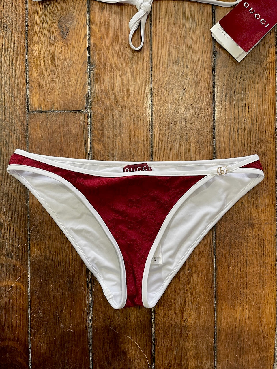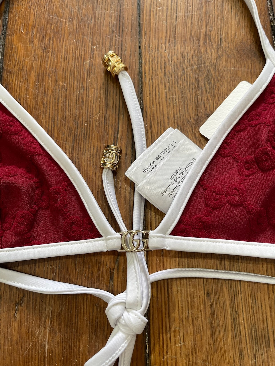 Maillot de bain en polyamide rouge à motif GG ton-sur-ton et bordures blanches. Haut triangle avec liens à nouer et bas bikini. Logo GG sur le haut et le bas.