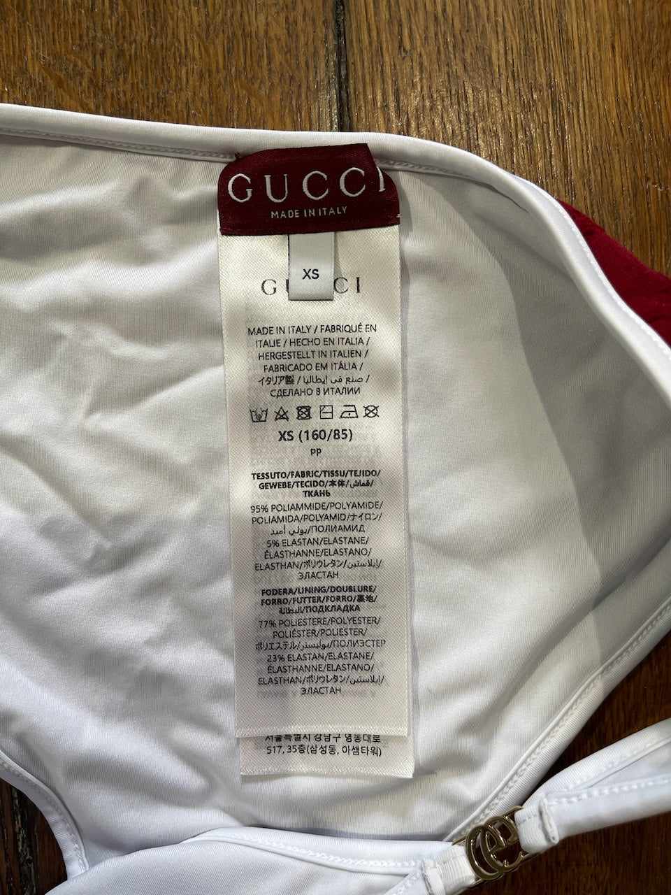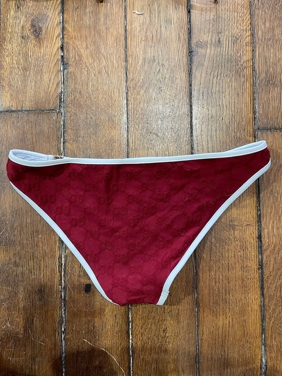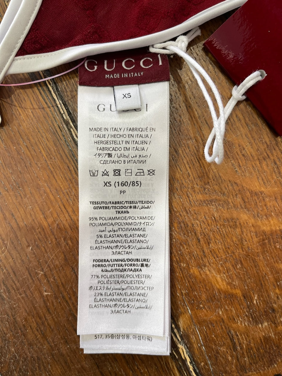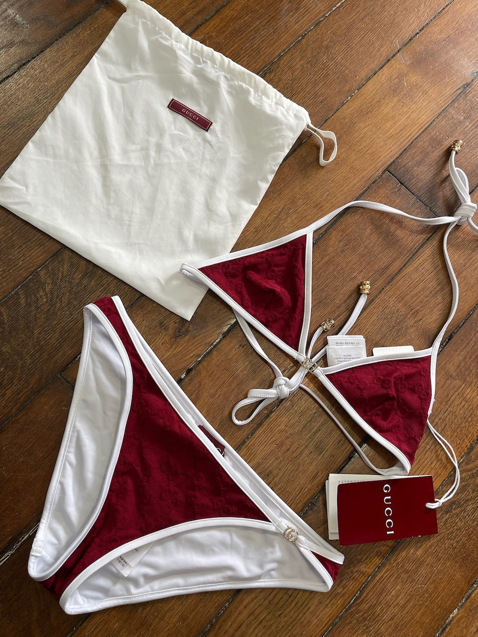 Maillot de bain en polyamide rouge à motif GG ton-sur-ton et bordures blanches. Haut triangle avec liens à nouer et bas bikini. Logo GG sur le haut et le bas.