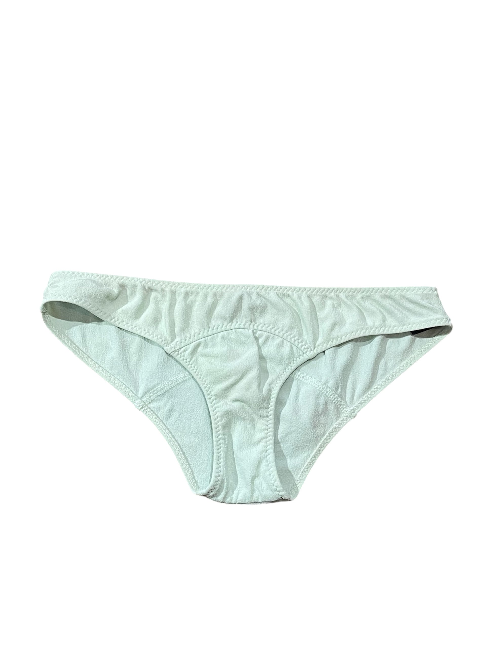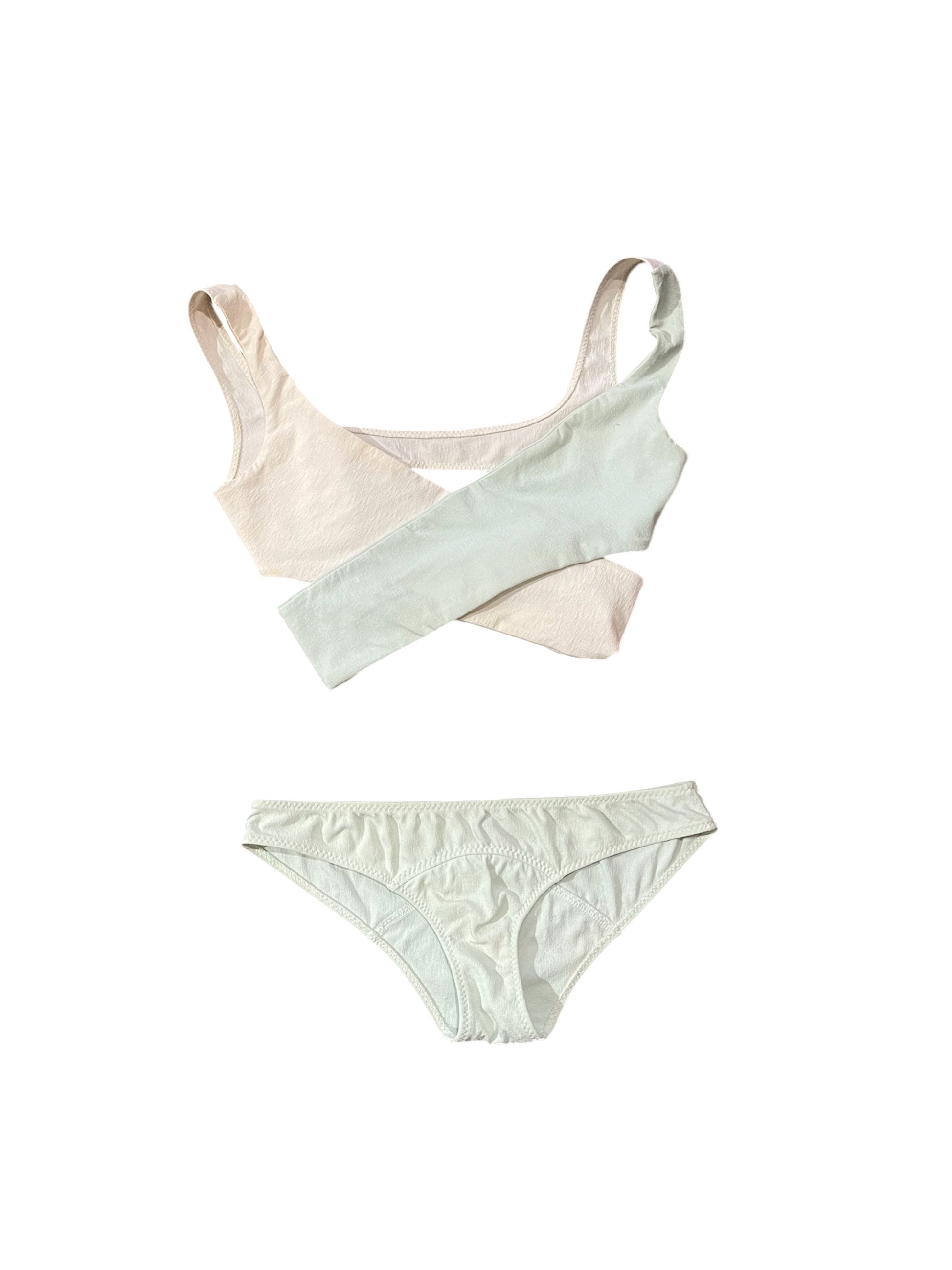 Maillot de bain en nylon et elasthane blanc et vert d'eau, haut croisé à nouer au dos et culotte bikini non échancrée.