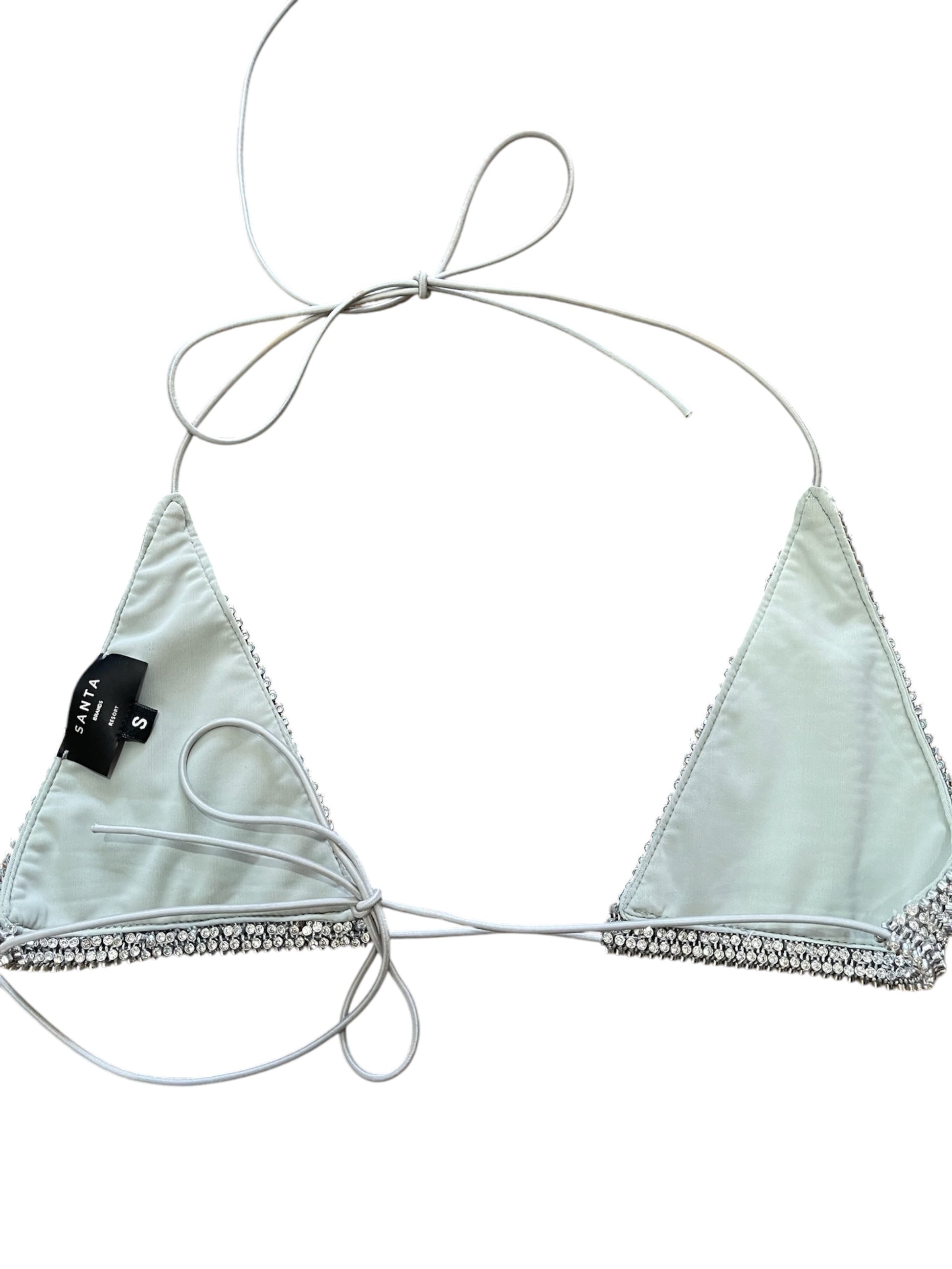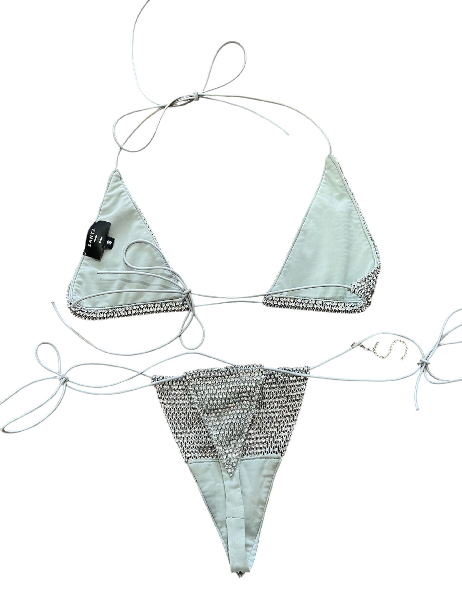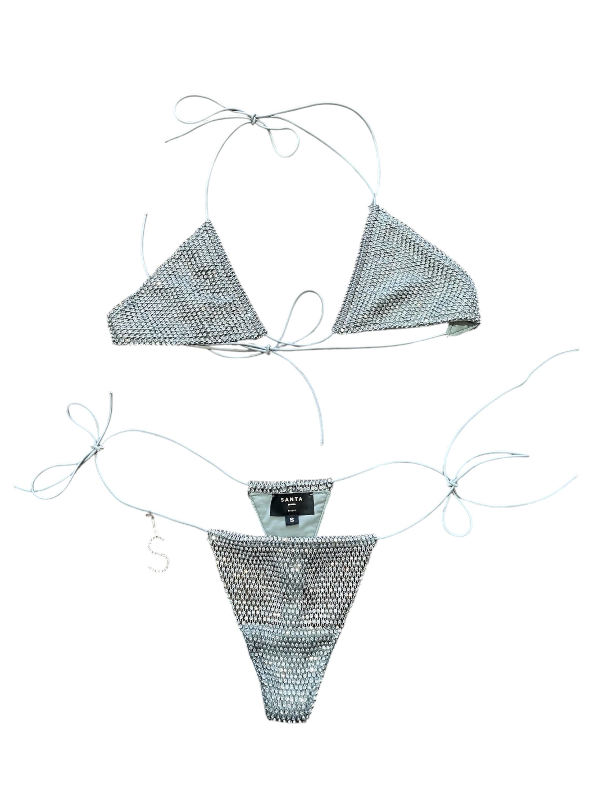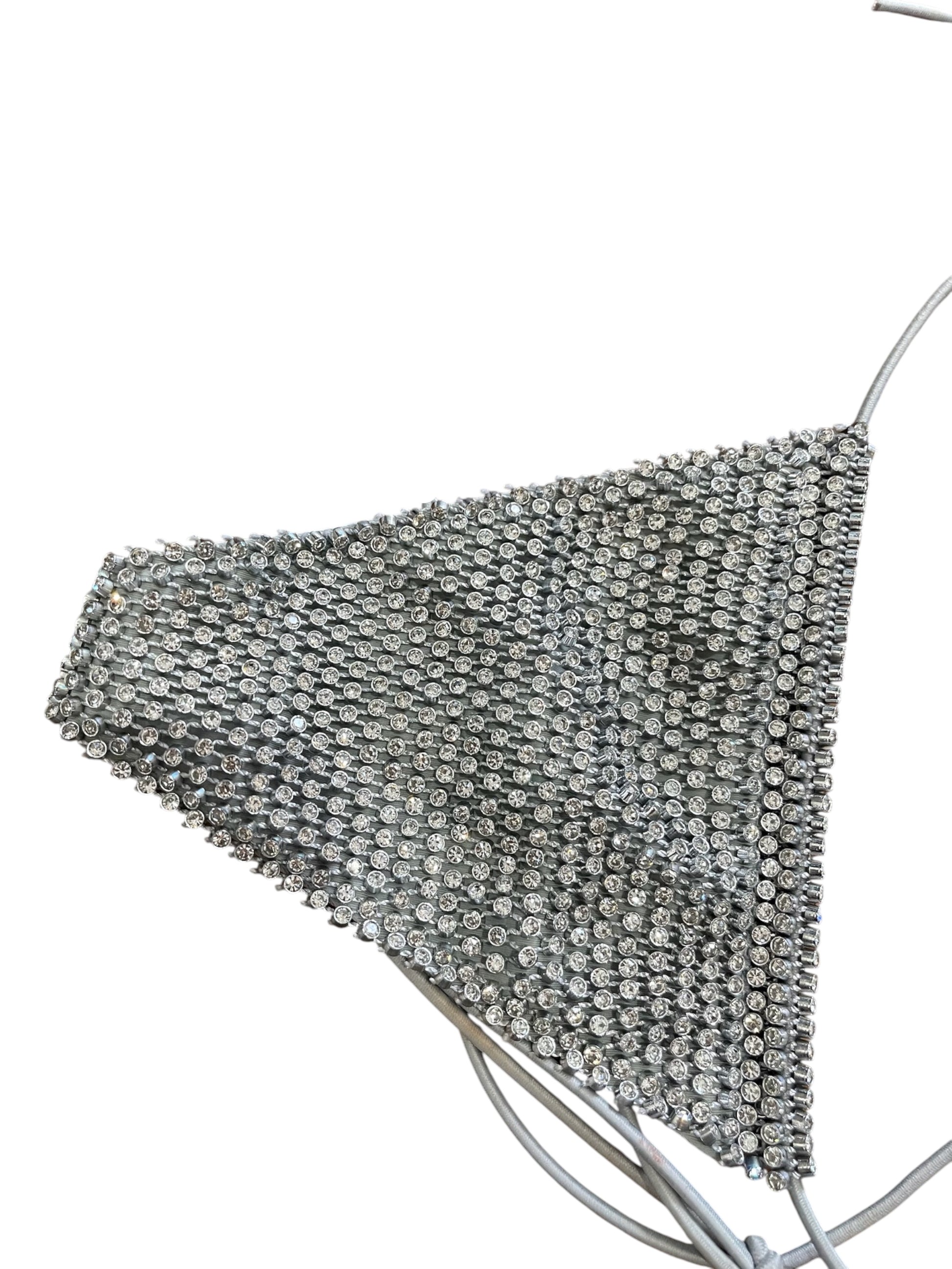 Modèle à bretelle en strass argenté. Fermeture avec des noeuds.