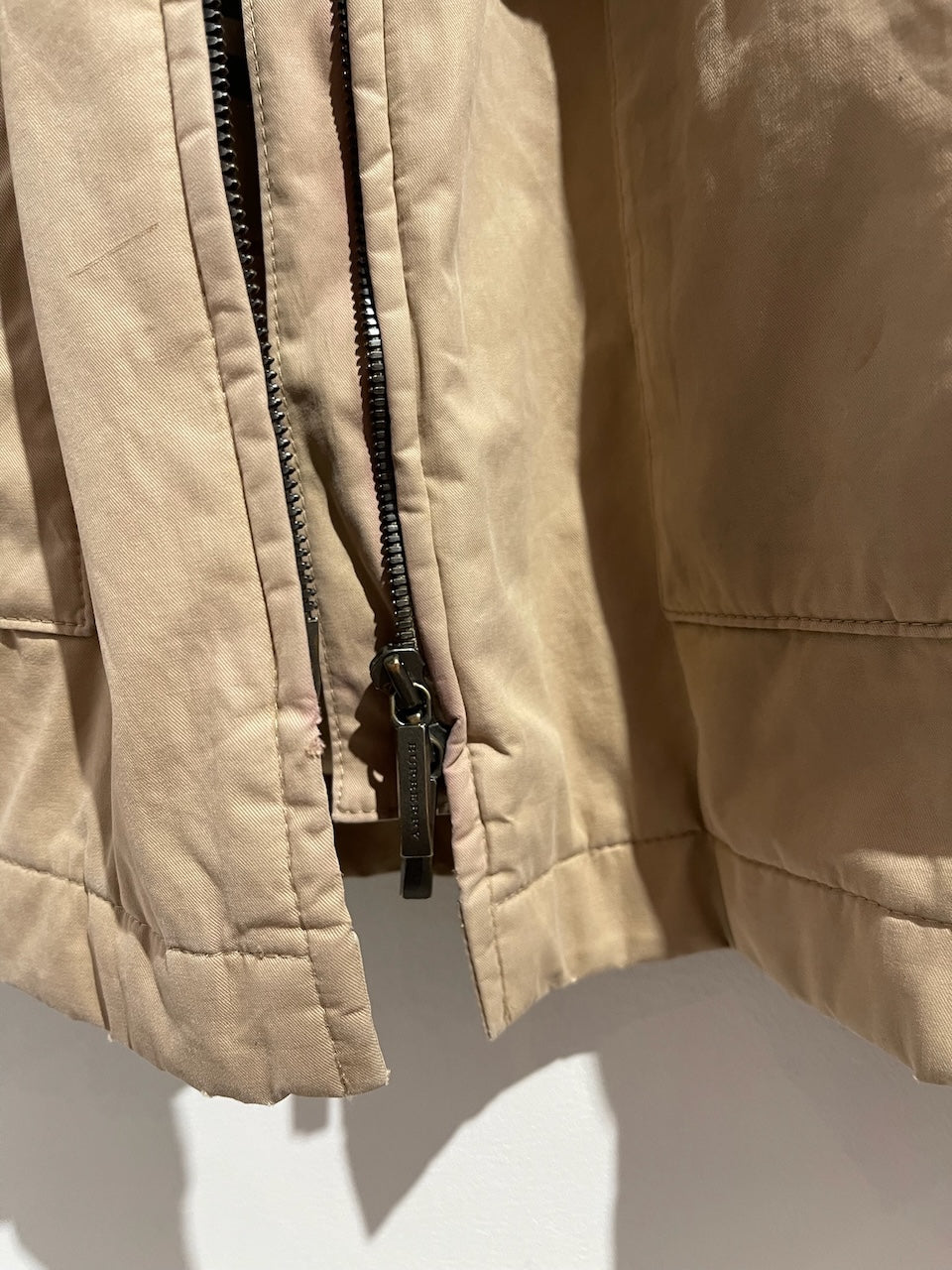 Manteau vintage en toile beige avec fermeture zippée double curseur, lien de serrage dissimulé à la taille et poches latérales. Signature Burberry au dos du col.