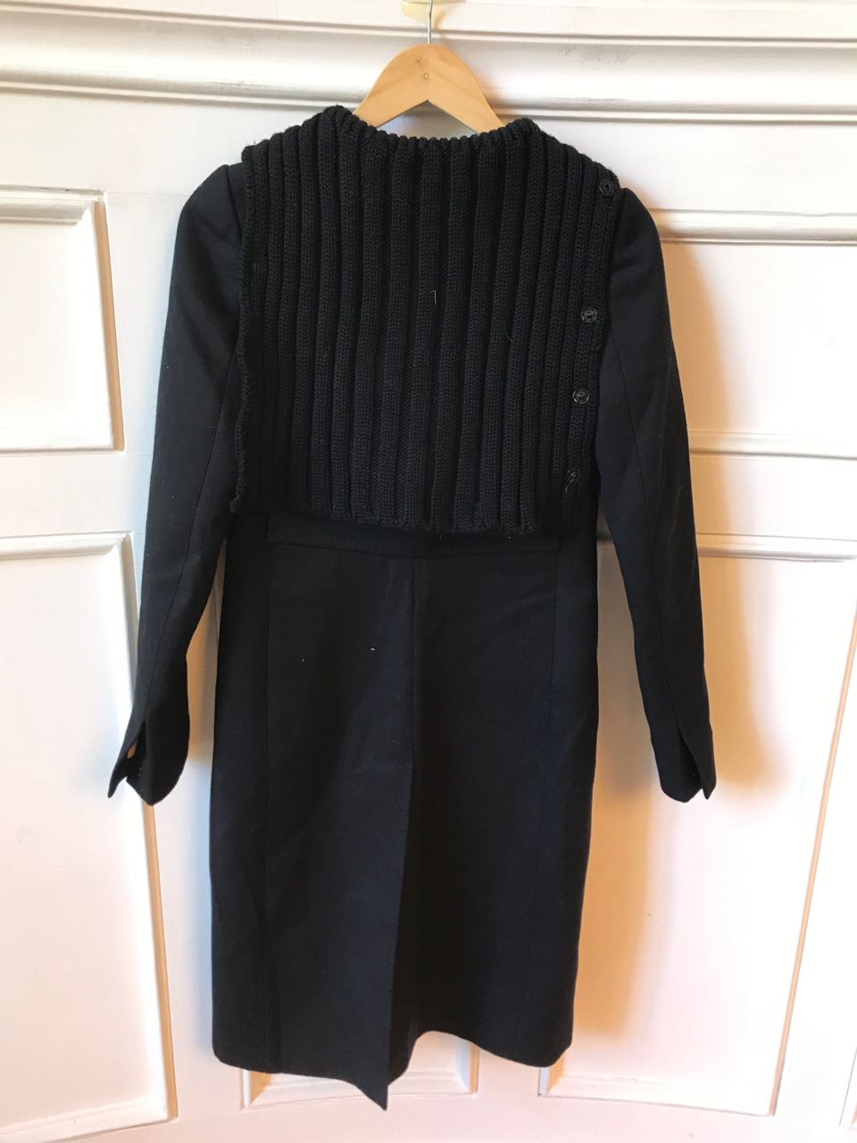 Manteau long en laine noire avec un col montant en maille. Fermeture par boutons.