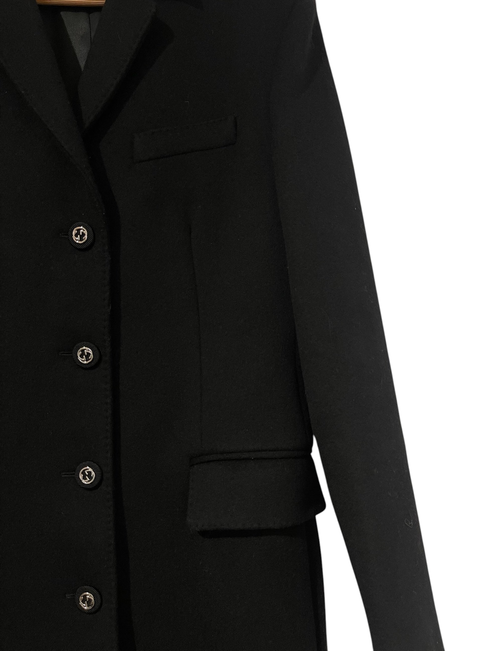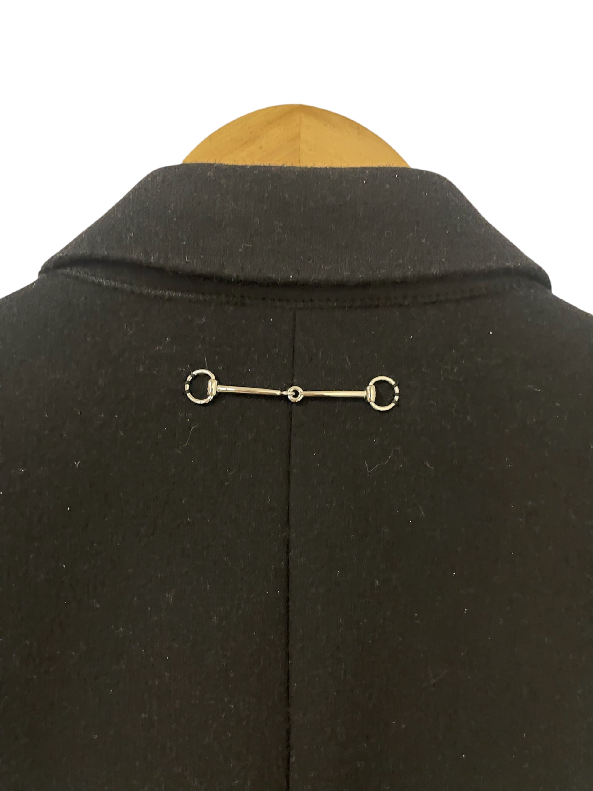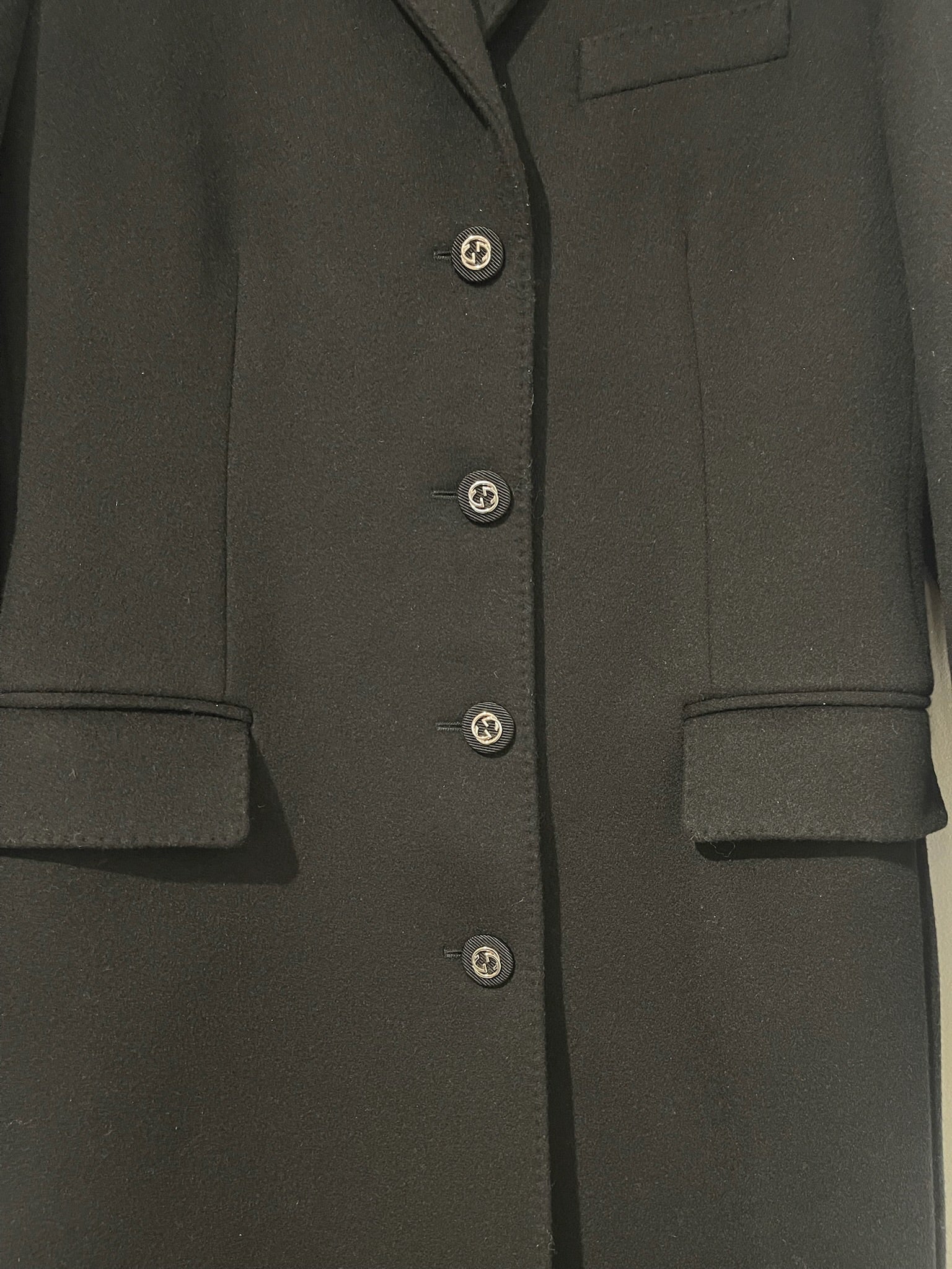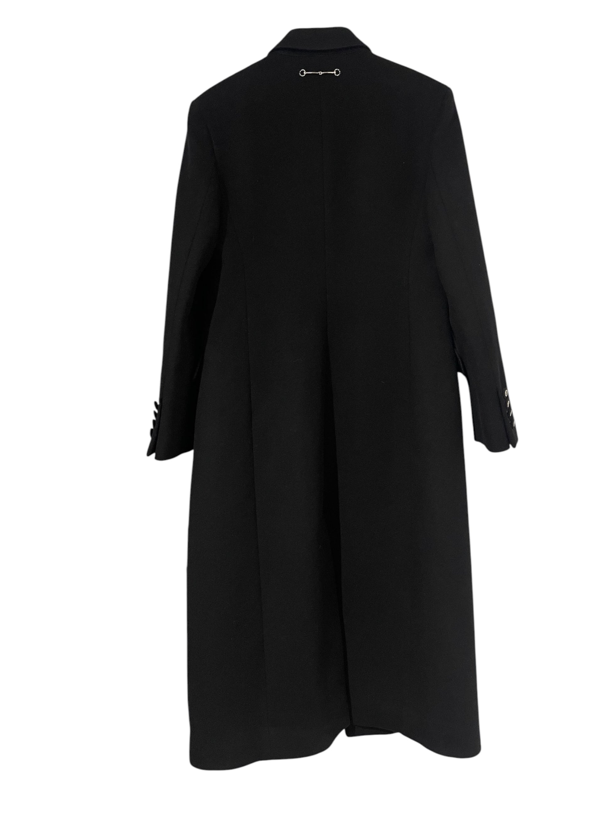 Manteau long en laine noire avec fermeture par boutons signés GG et poches latérales. Détails du mors Gucci à l'arrière. Poignets boutonnés. Coupe droite.