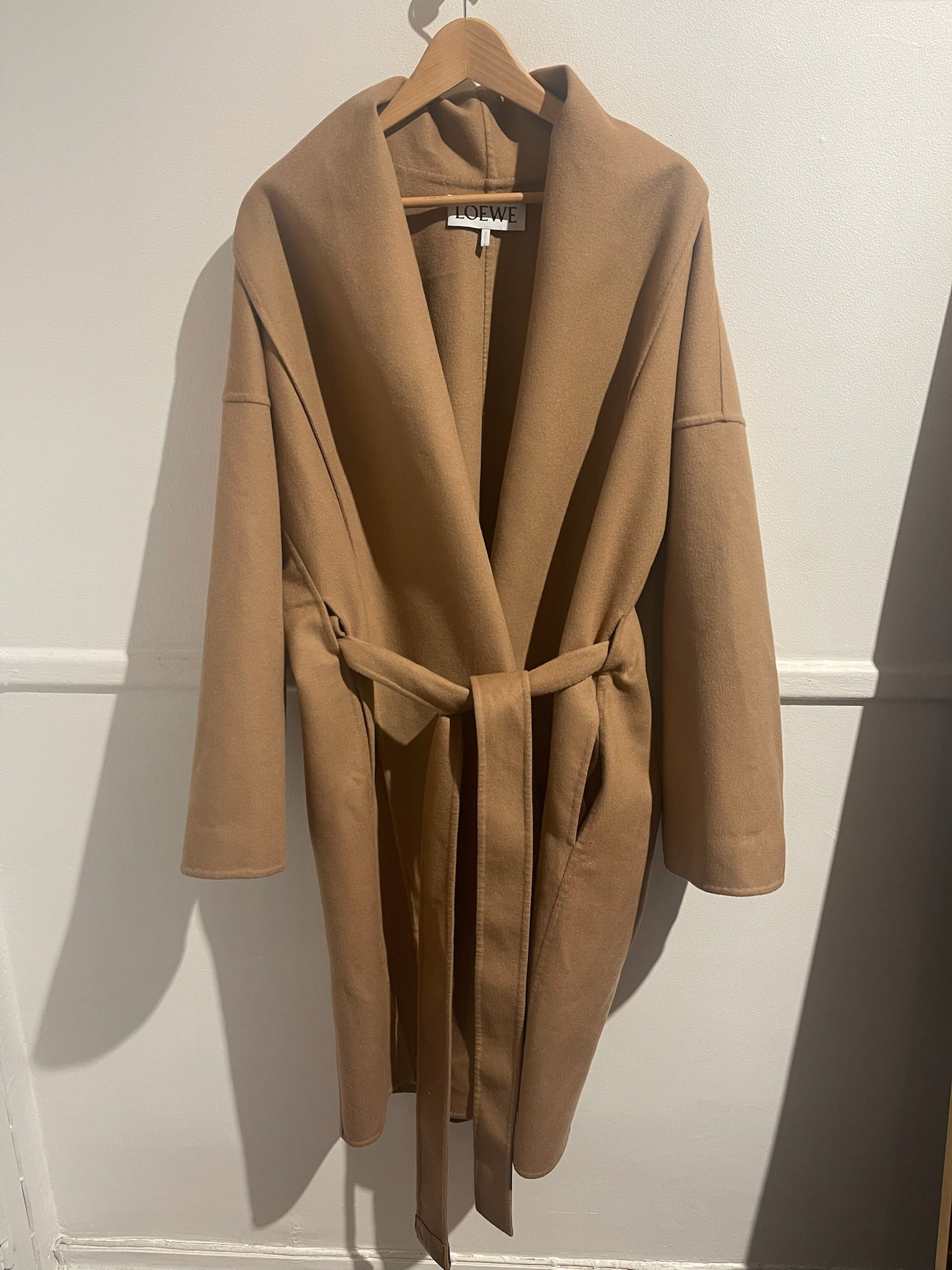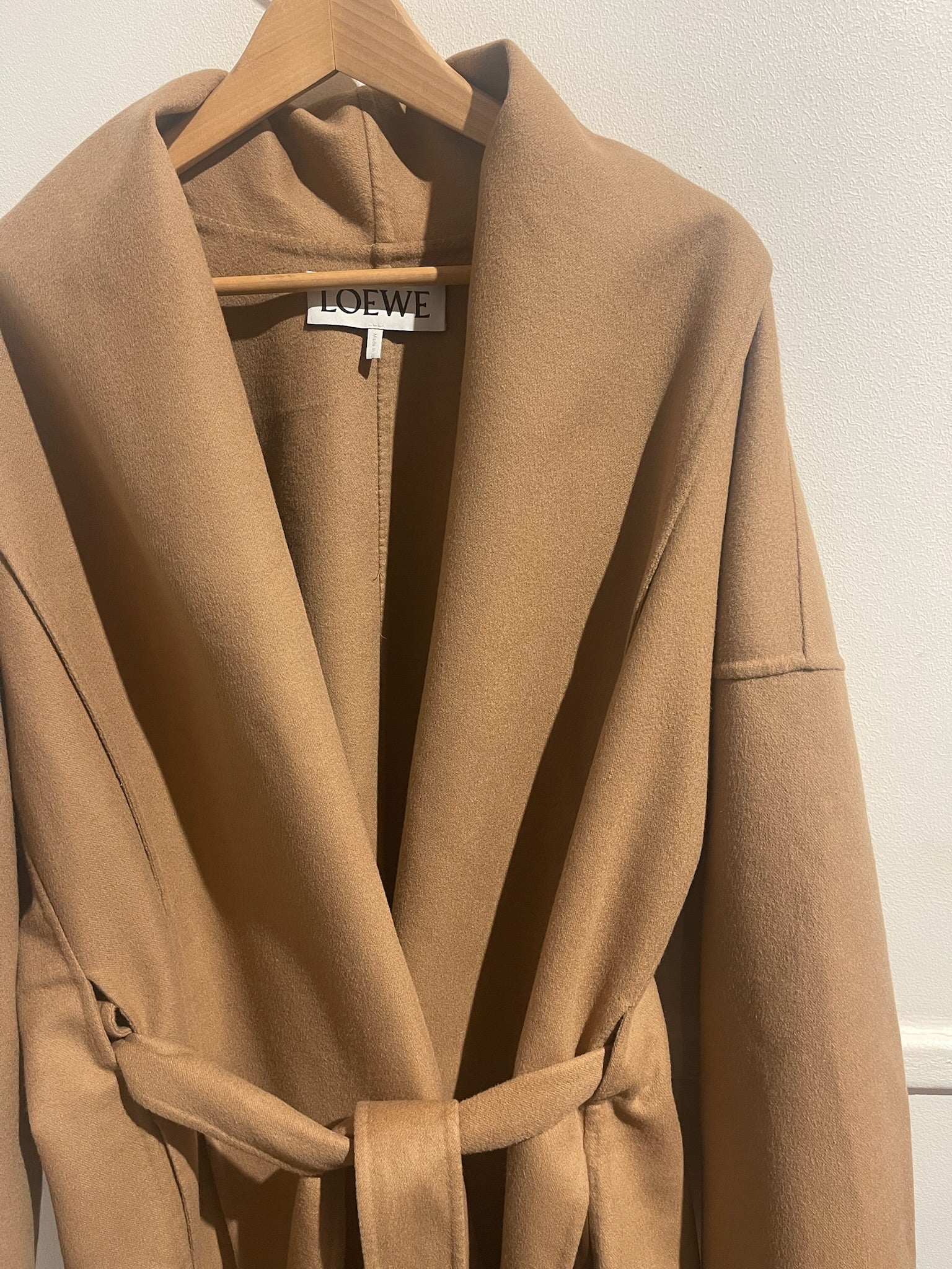 Manteau en laine et cachemire camel avec taille ceinturée et col large. Coupe oversize.