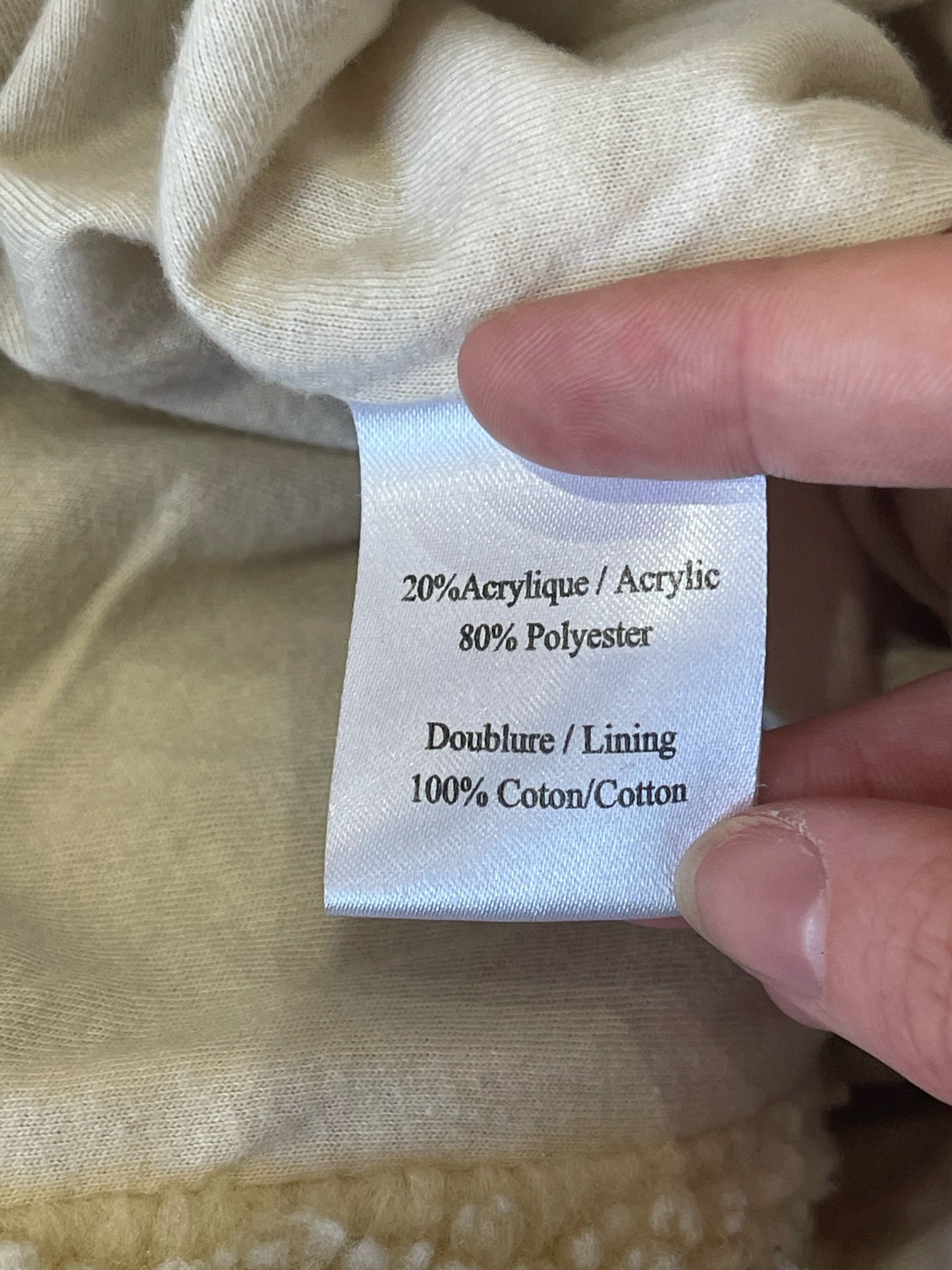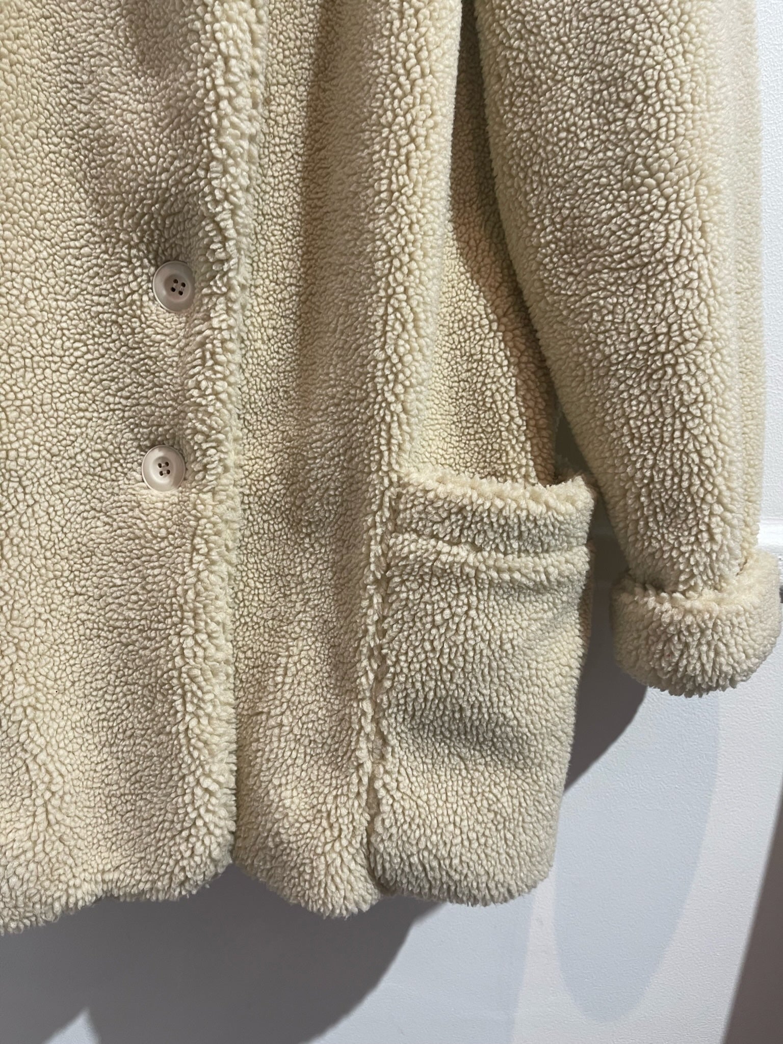 Manteau effet shearling beige avec fermeture boutonnée et poches latérales.