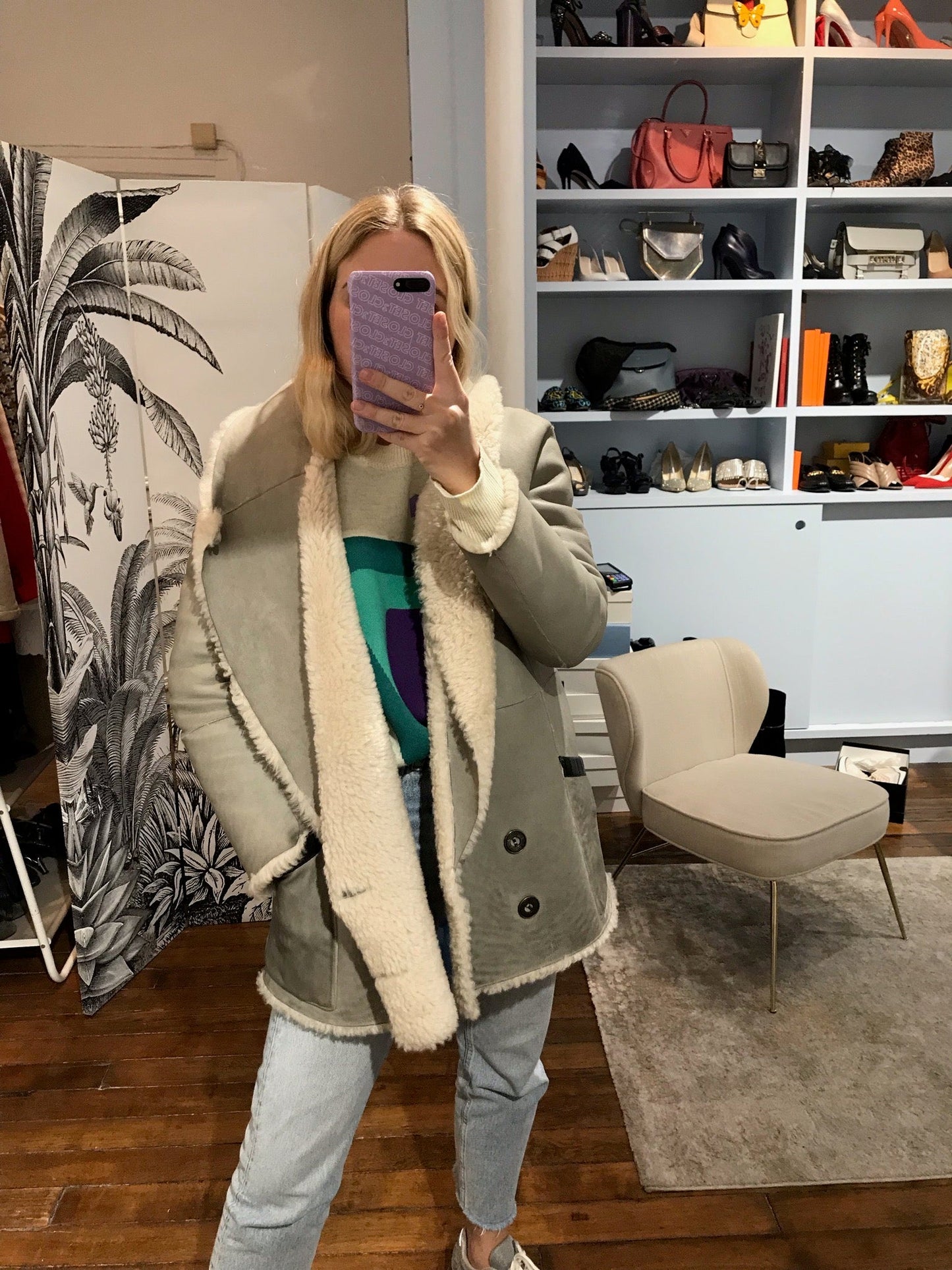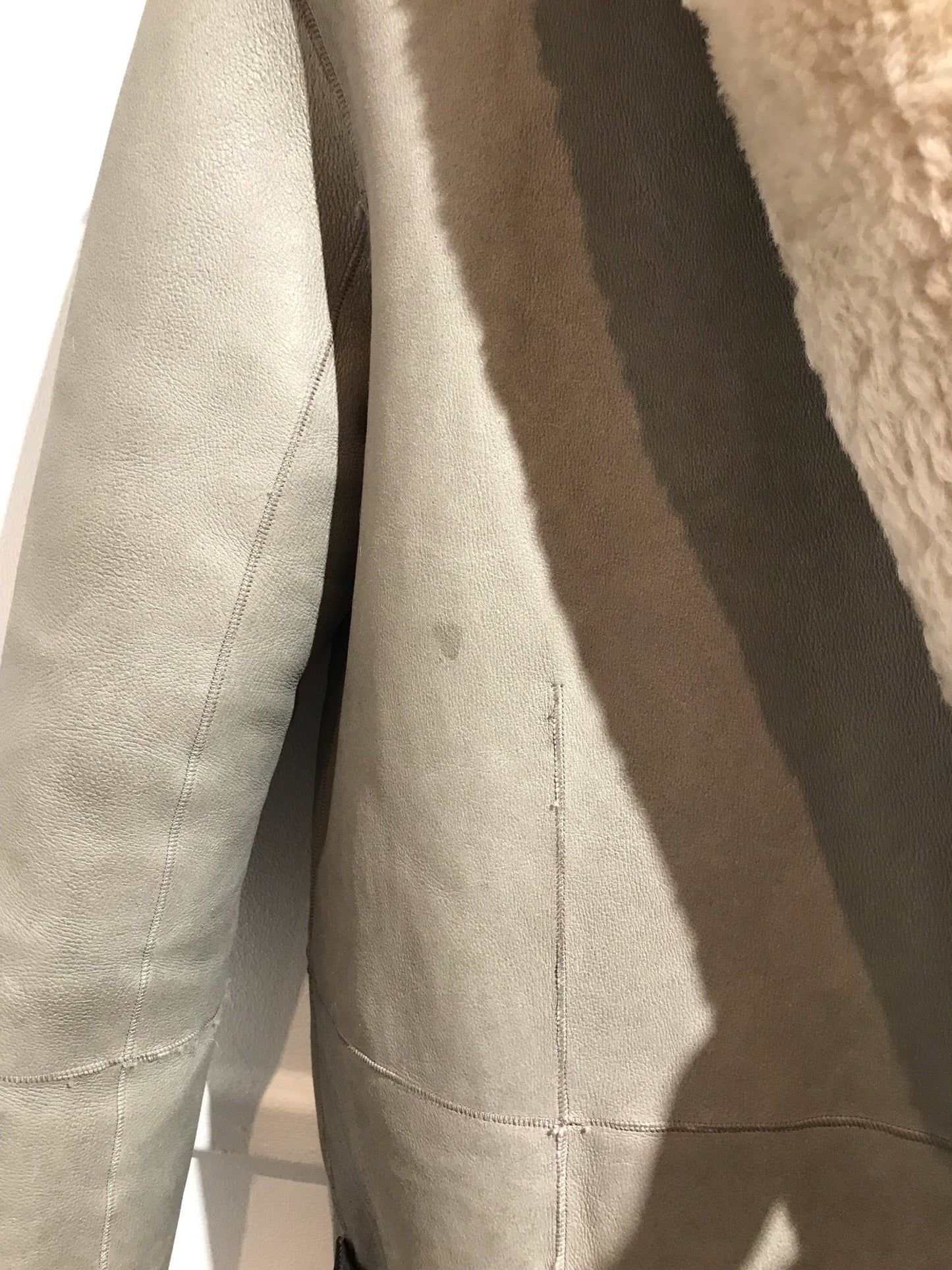 Manteau réversible en cuir d'agneau retourné beige et gris. Fermeture boutonnée.
