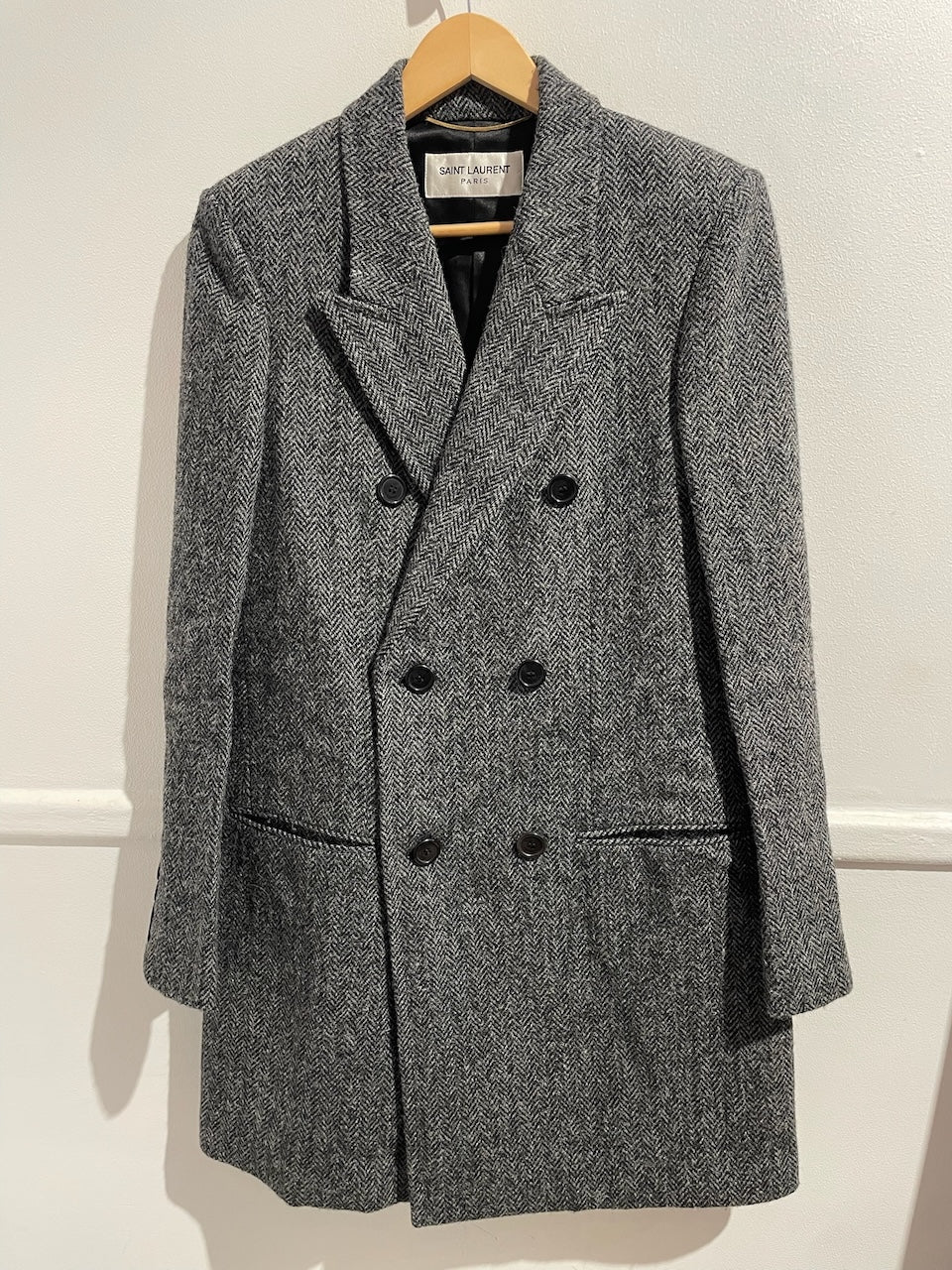 Manteau en laine gris à chevrons avec fermeture double boutonnage, poches latérales et poignets boutonnés.