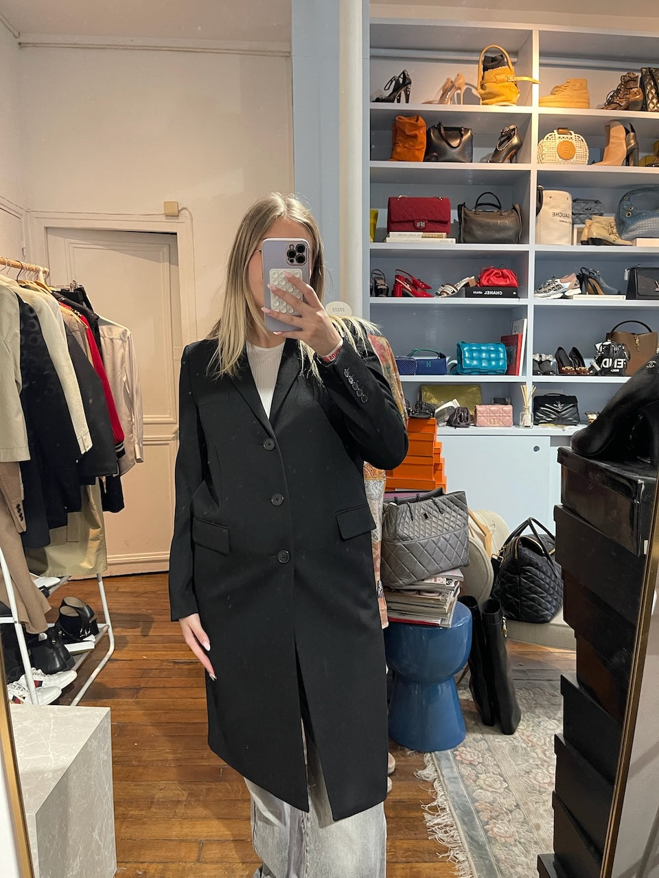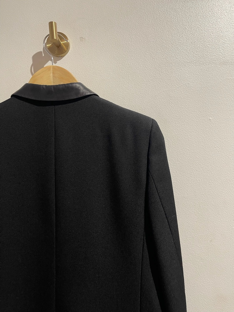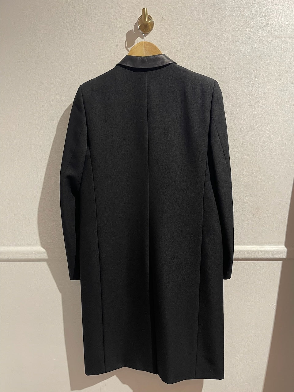 Manteau mi-long en laine noir avec empiècement en cuir au col, fermeture boutonnée et poches latérales. Poignets boutonnés. Fente arrière. Coupe droite.