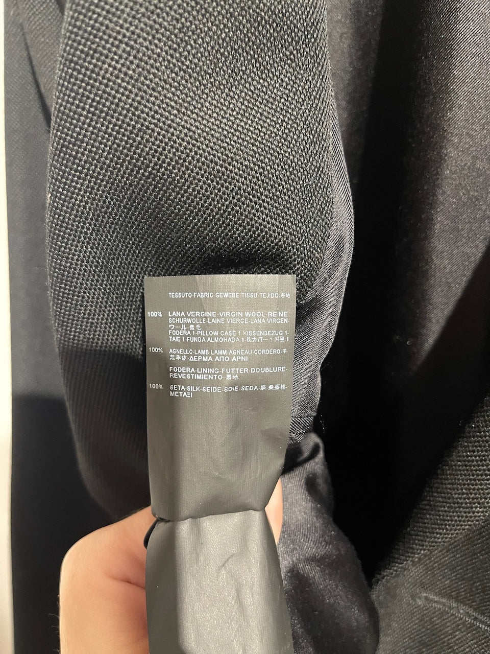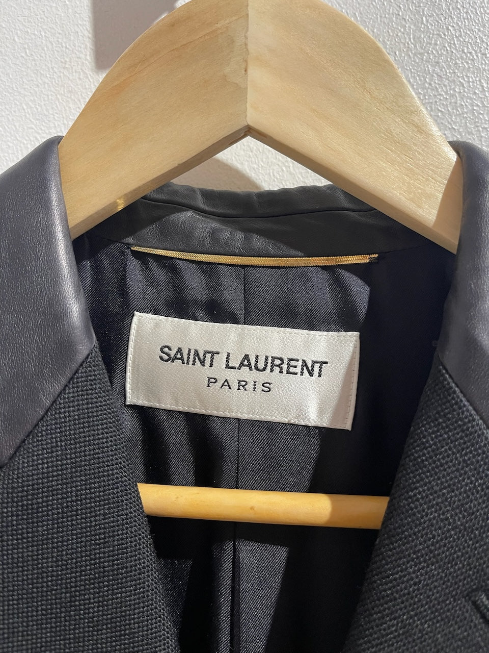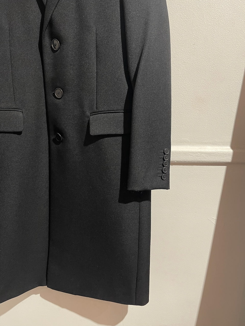 Manteau mi-long en laine noir avec empiècement en cuir au col, fermeture boutonnée et poches latérales. Poignets boutonnés. Fente arrière. Coupe droite.