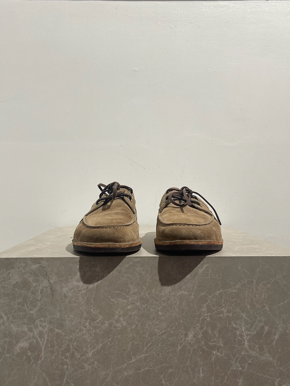 Mocassins style bateau en daim beige avec lacets en cuir marron.