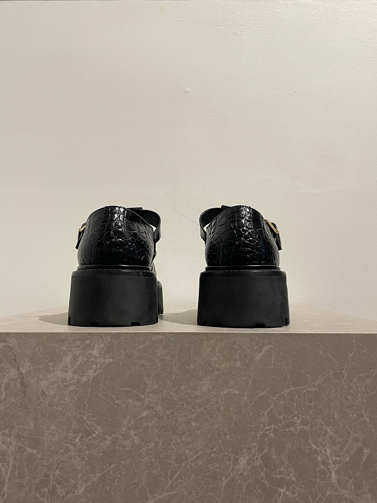 Babies en cuir noir embossé croco avec détail perforé du logo Triomphe à l'avant. Fermeture par boucle ajustable. Bijouterie dorée.