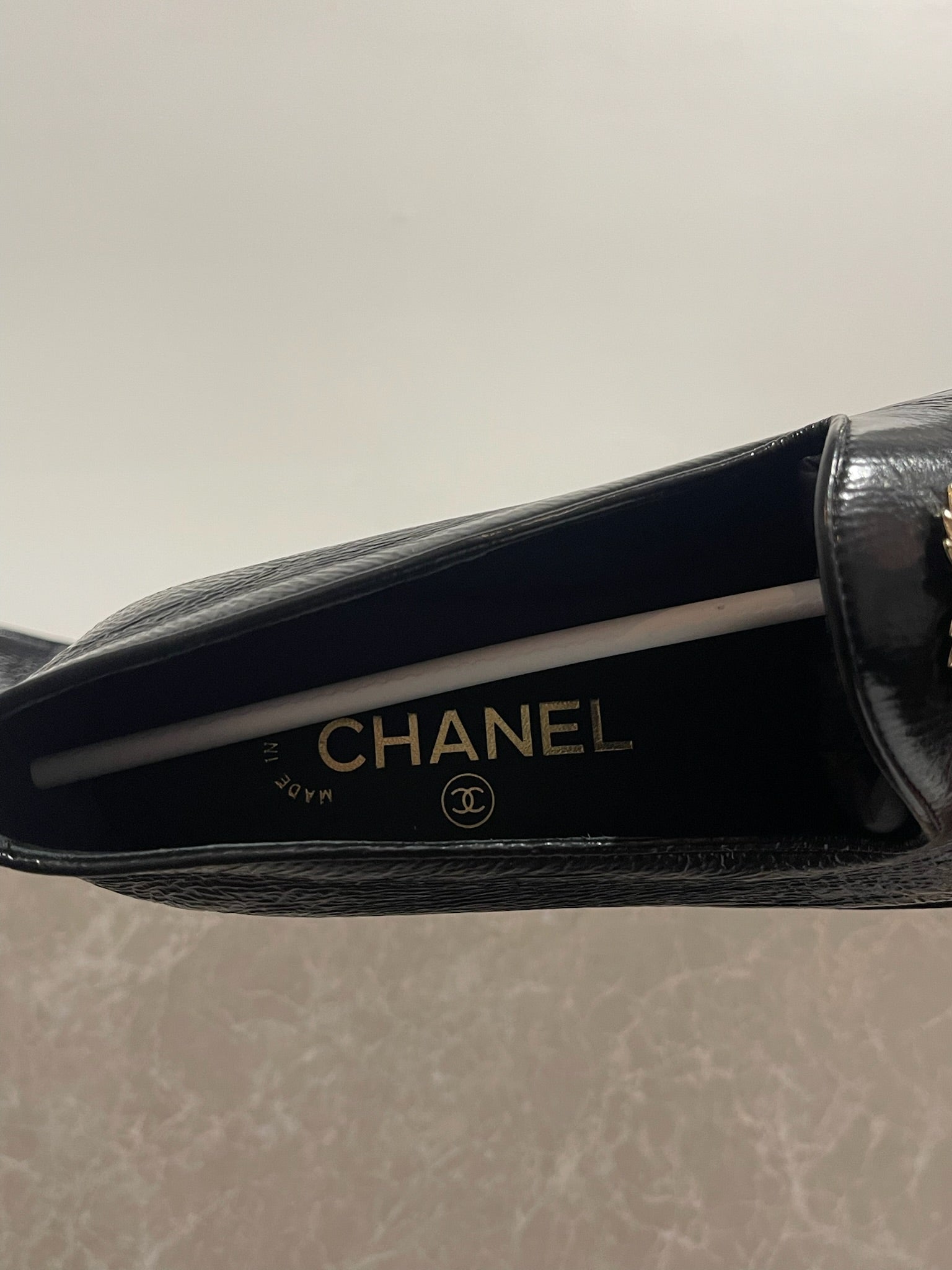 Mocassins en cuir brillant noir orné du logo CC en métal doré style feuillage, bout en gros grain noir. Détail en daim aux bords des semelles. Semelles fines