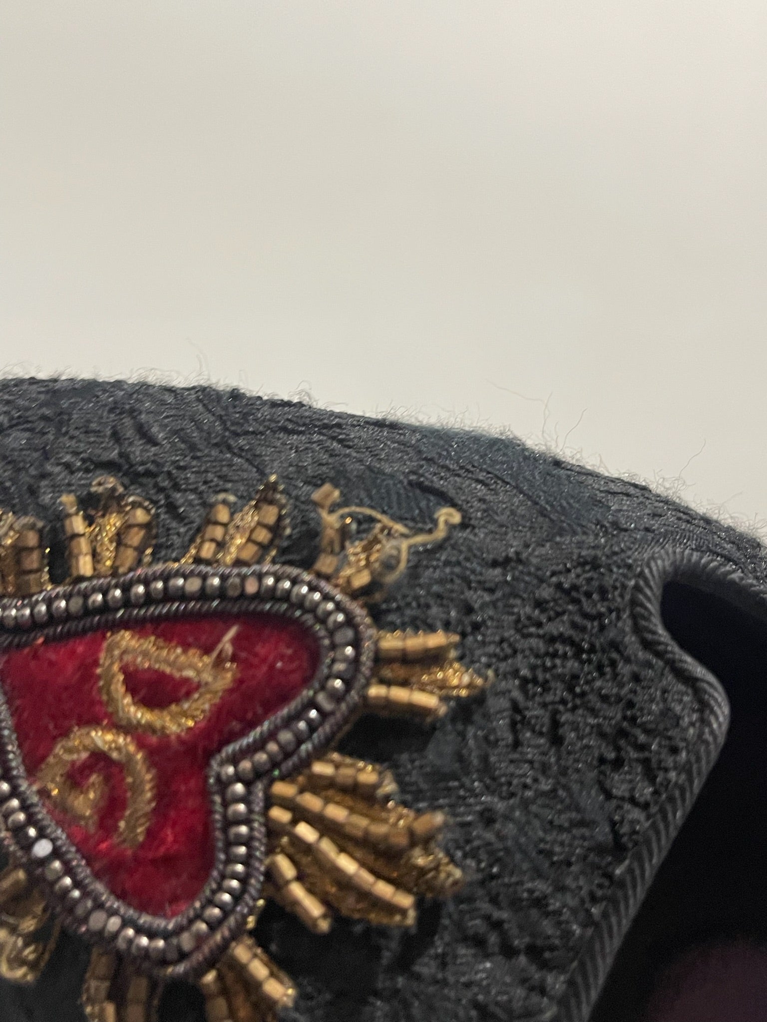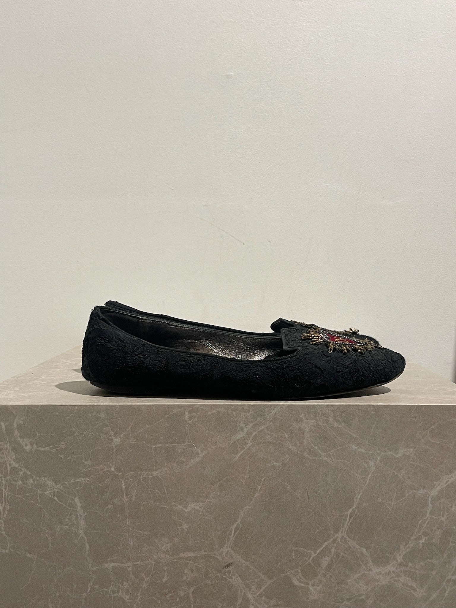 Mocassins en toile dentelle noir ornés d'un motif coeur rouge et de perles brodées à l'avant. Siganture DG. Intérieur en cuir.