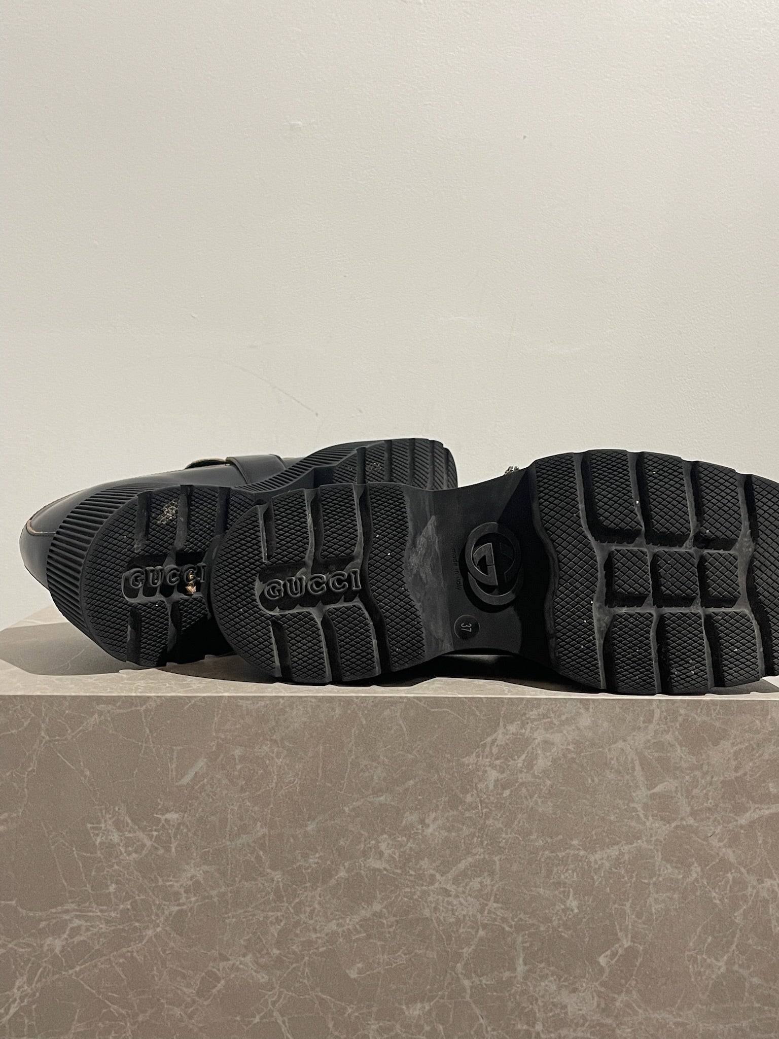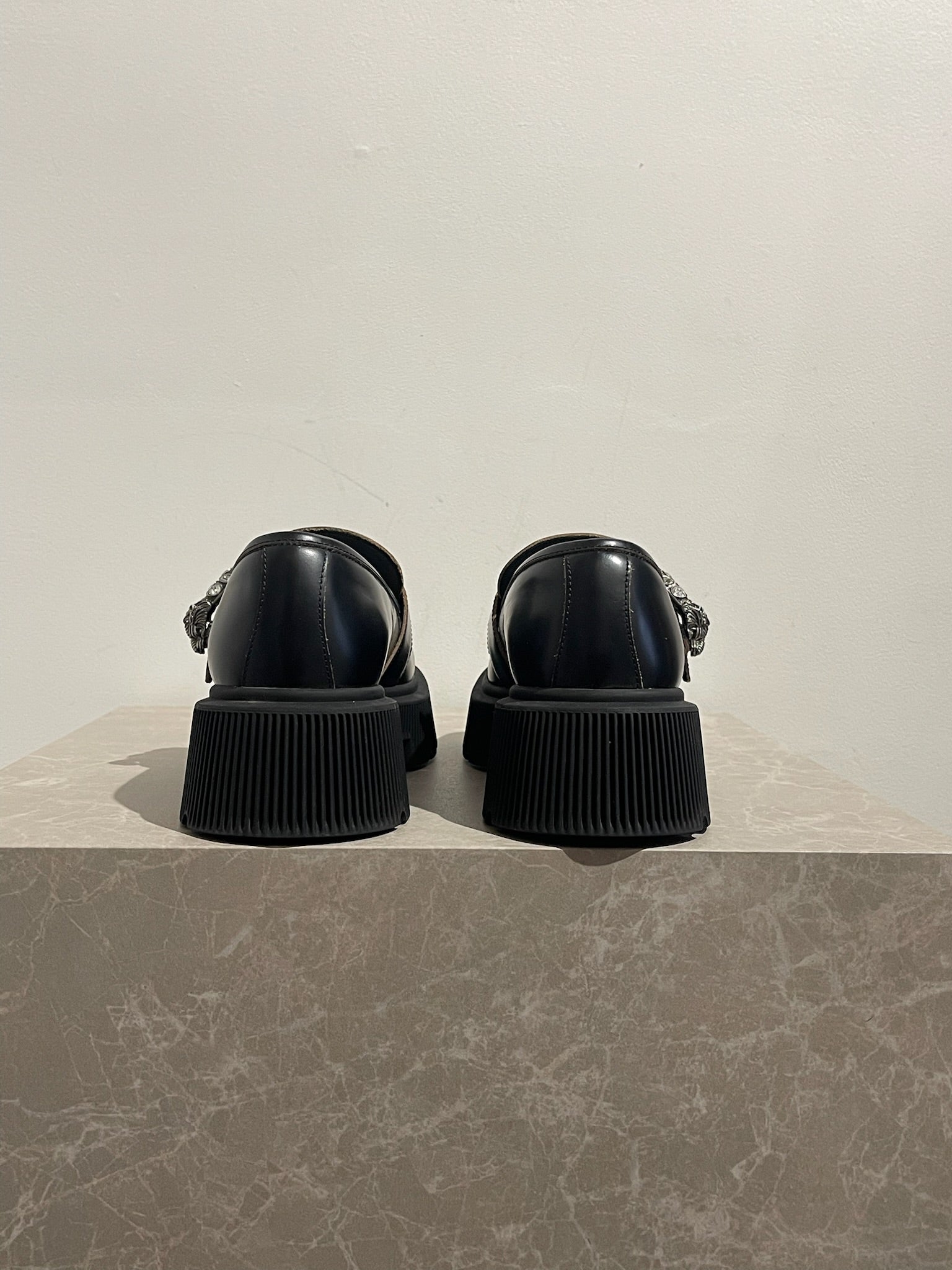 Mocassins en cuir noir, boucle Dionysus argentée à strass. Semelles épaisses.