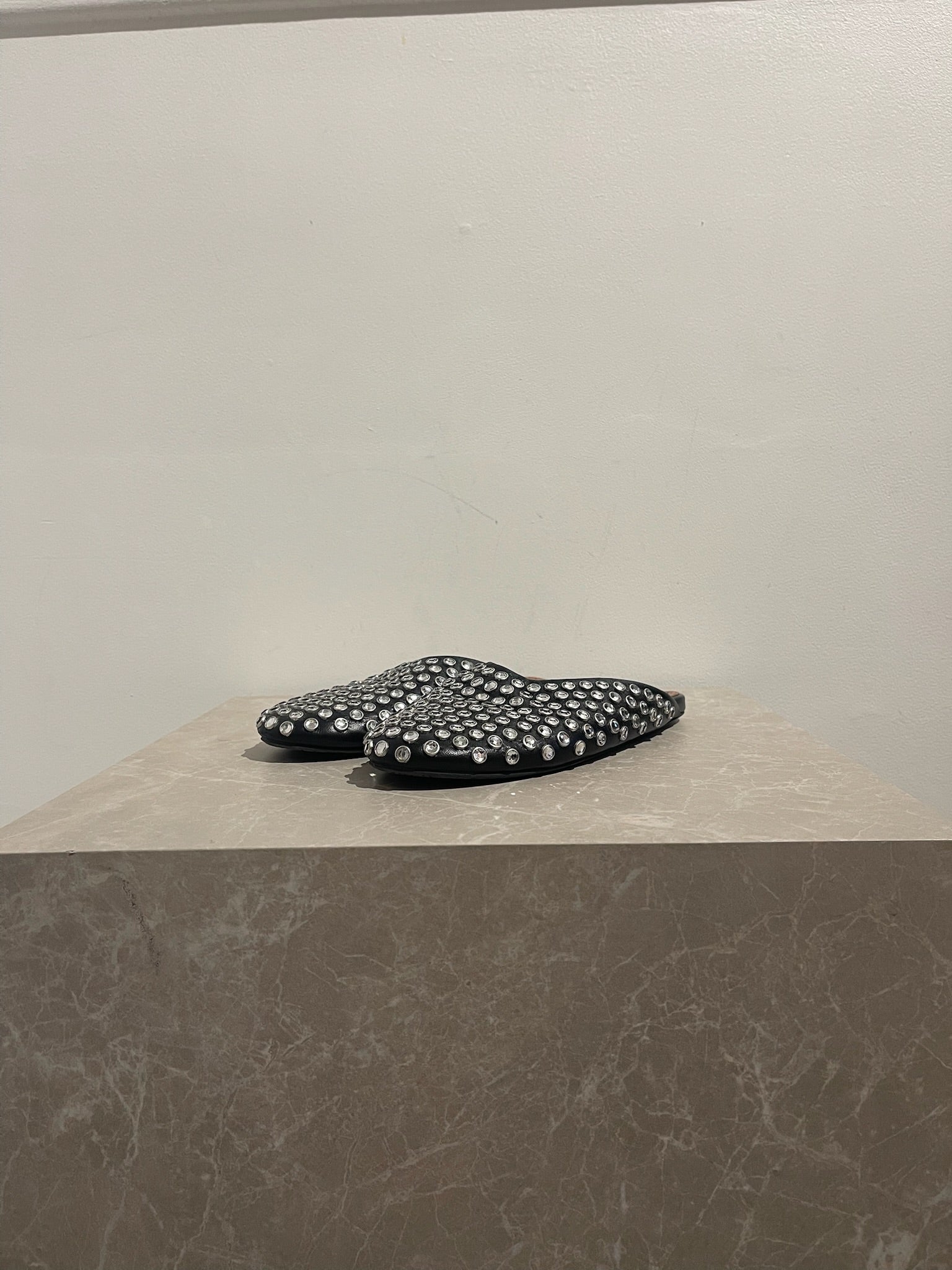 Mules plates en cuir ornées de studs strass.