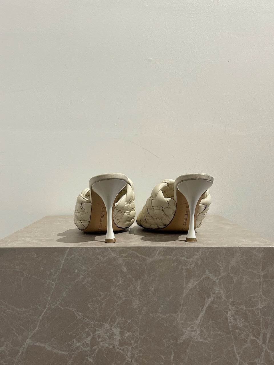 Mules à talons en cuir intrecciato écru. Bouts ouverts.