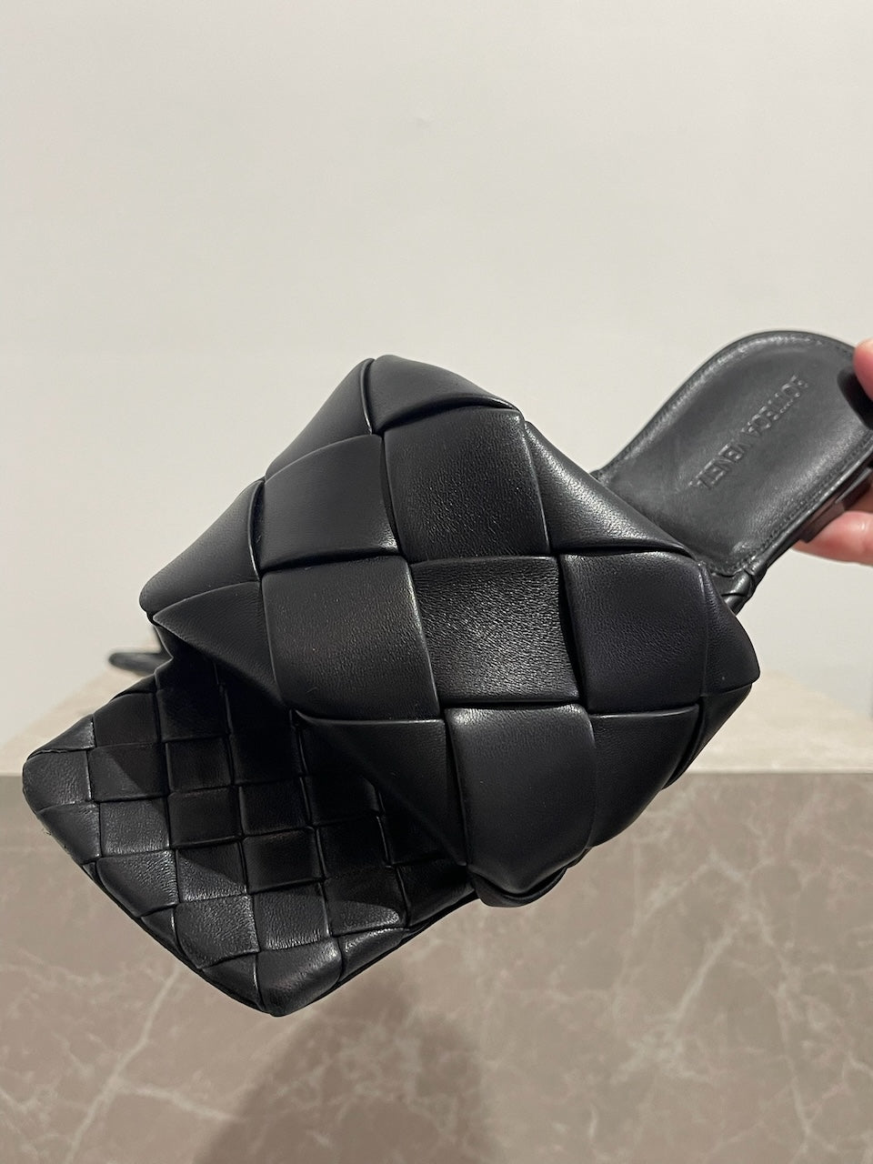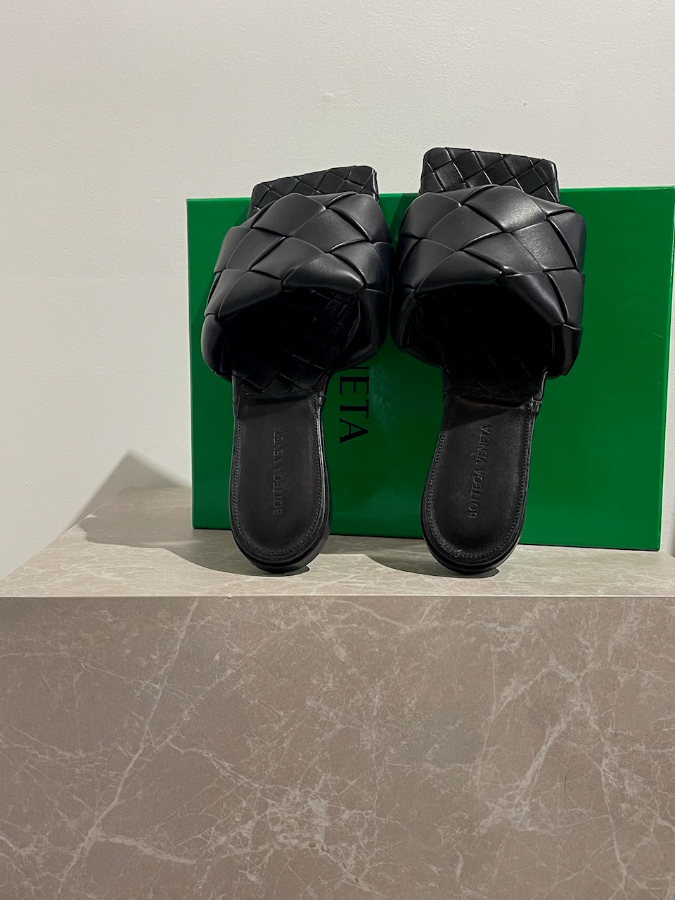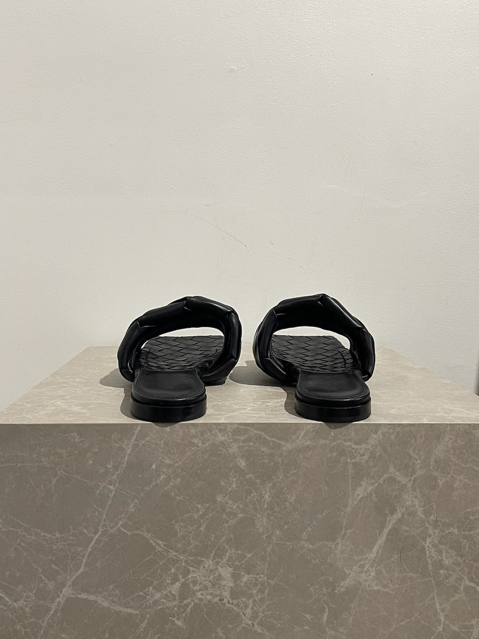 Mules plates en cuir tressé intrecciato noir avec bouts carrés ouverts.