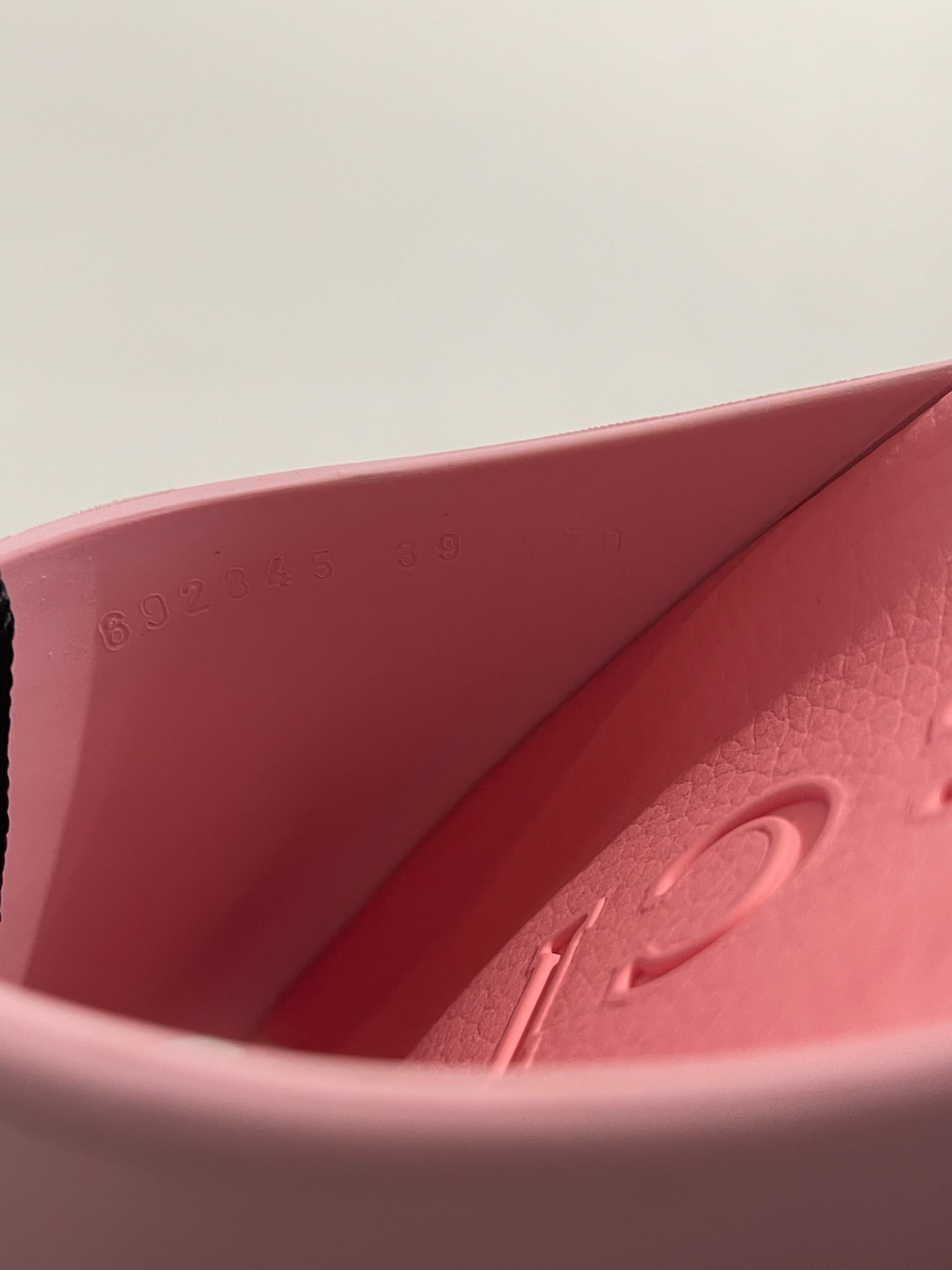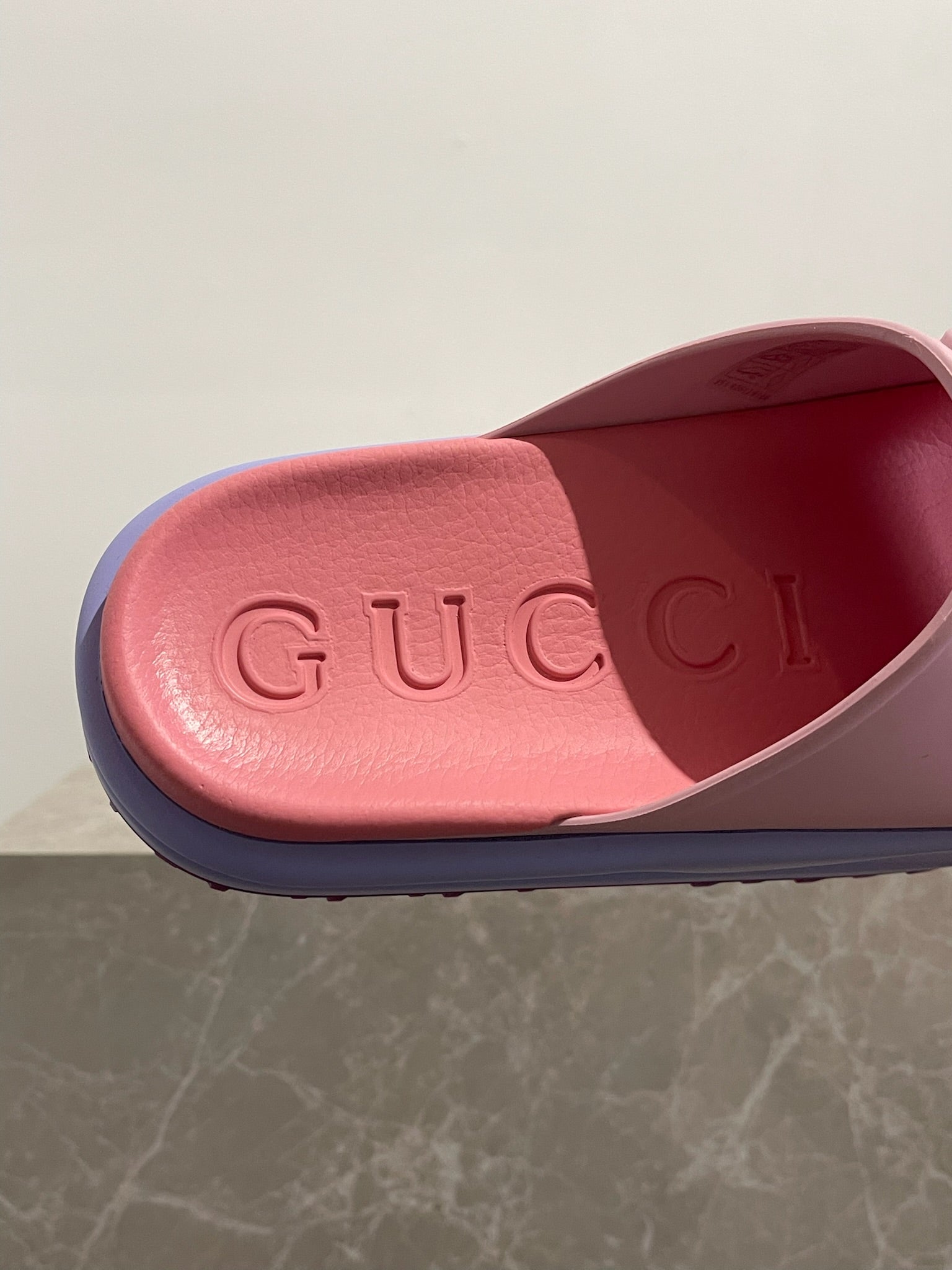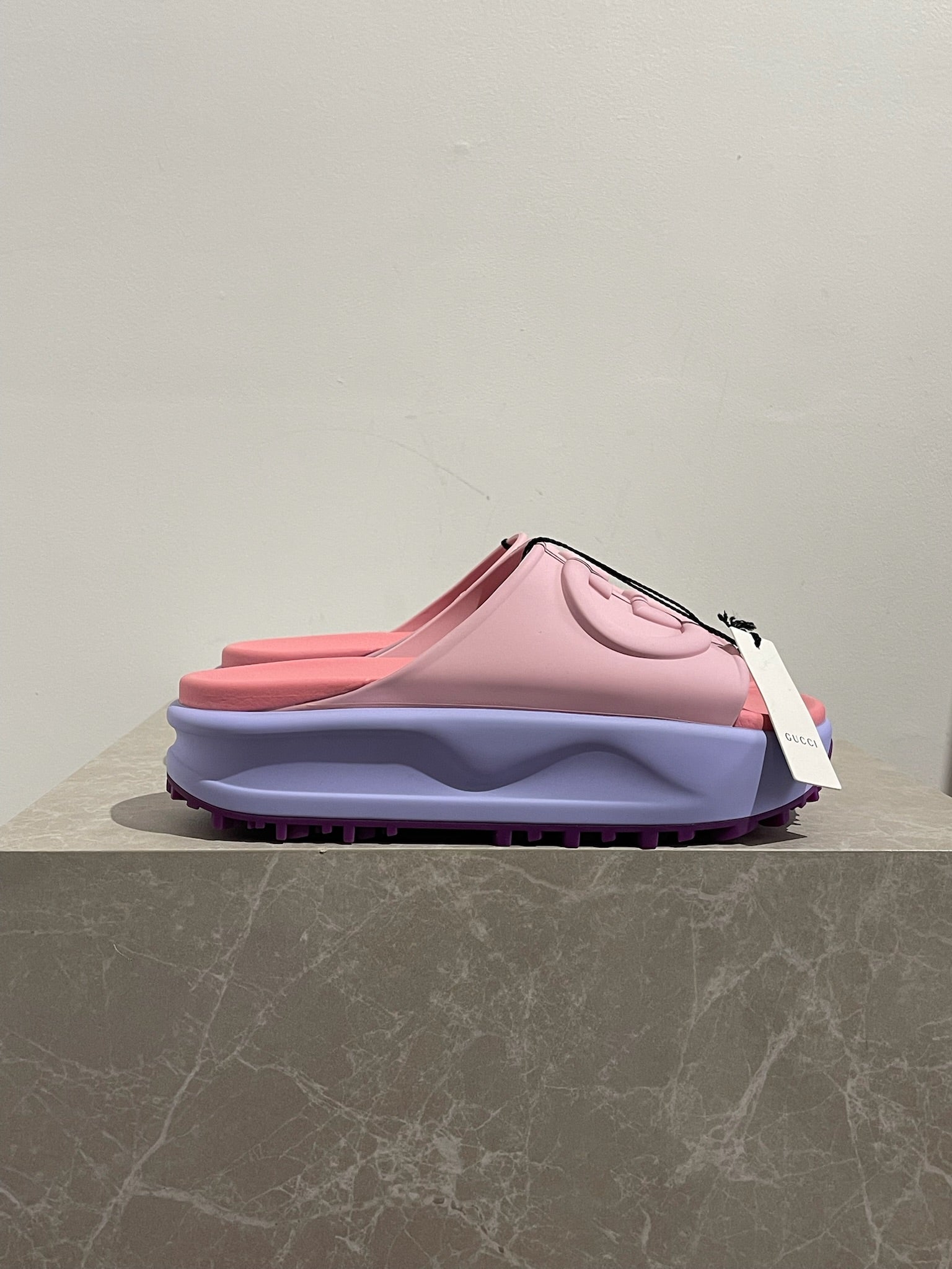 Mules compensées en caoutchouc rose et violet. Monogramme GG sur le dessus de la chaussure.