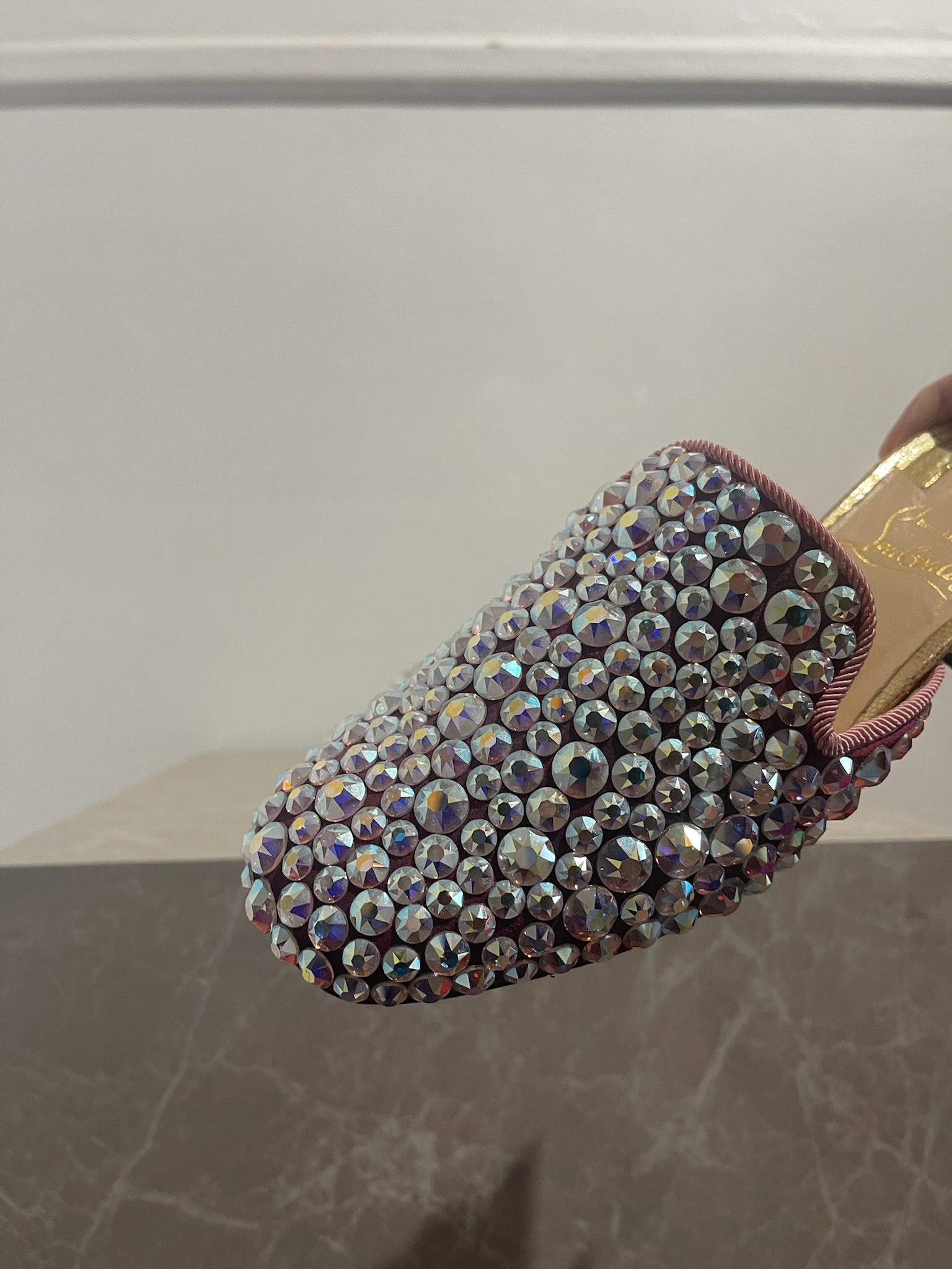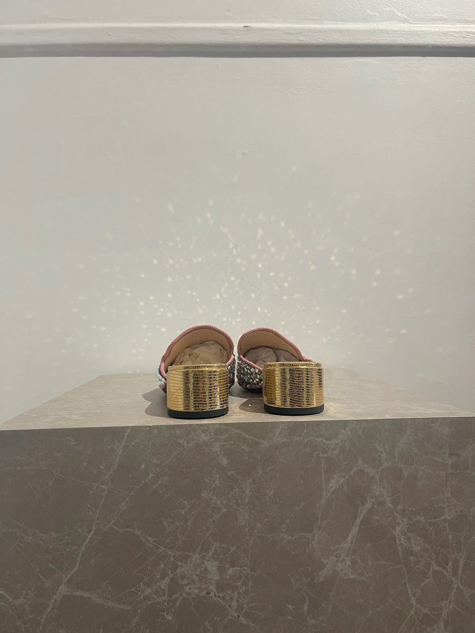 Mules en velours rose à strass argent aux reflets roses et talon en cuir doré.