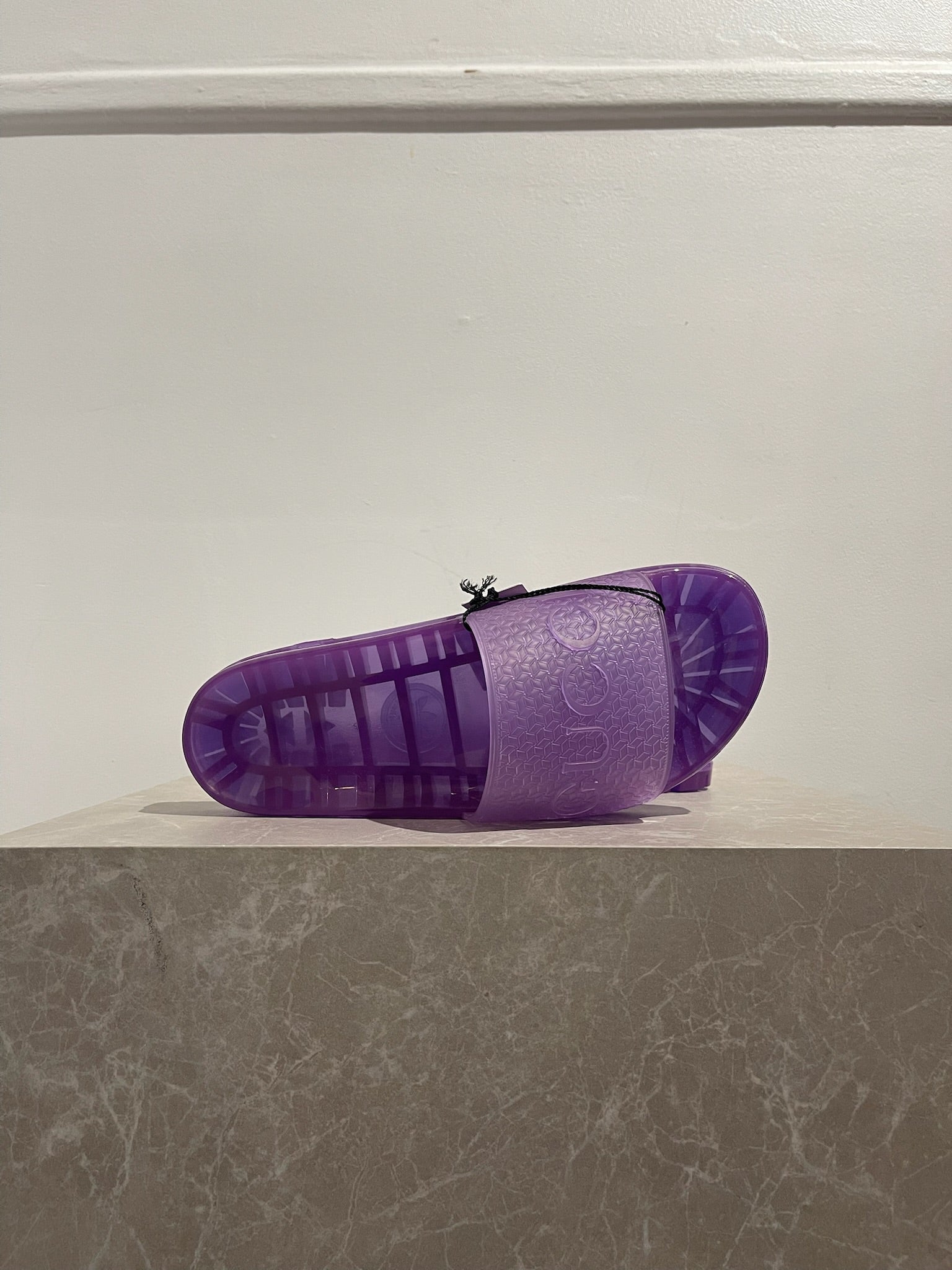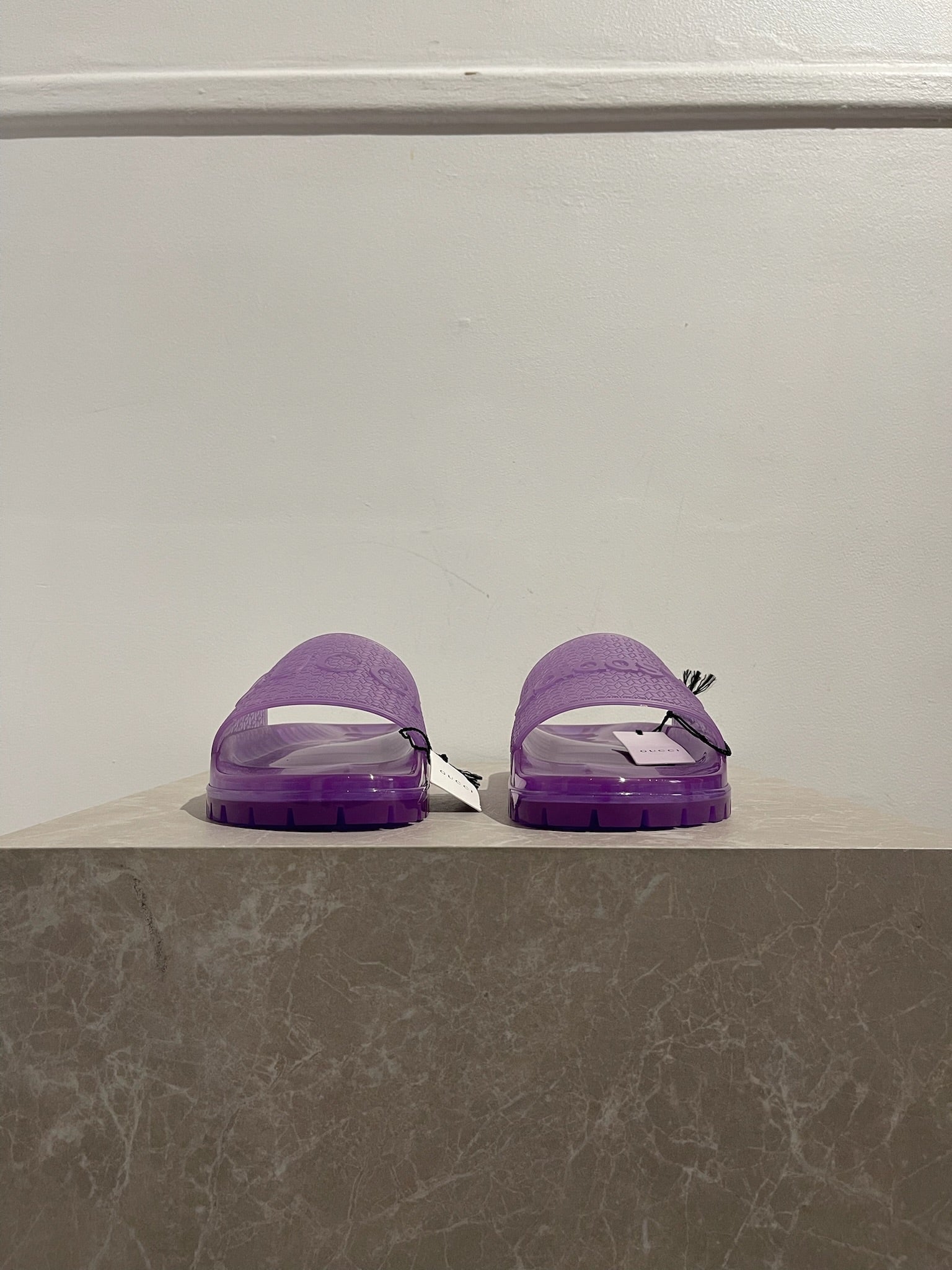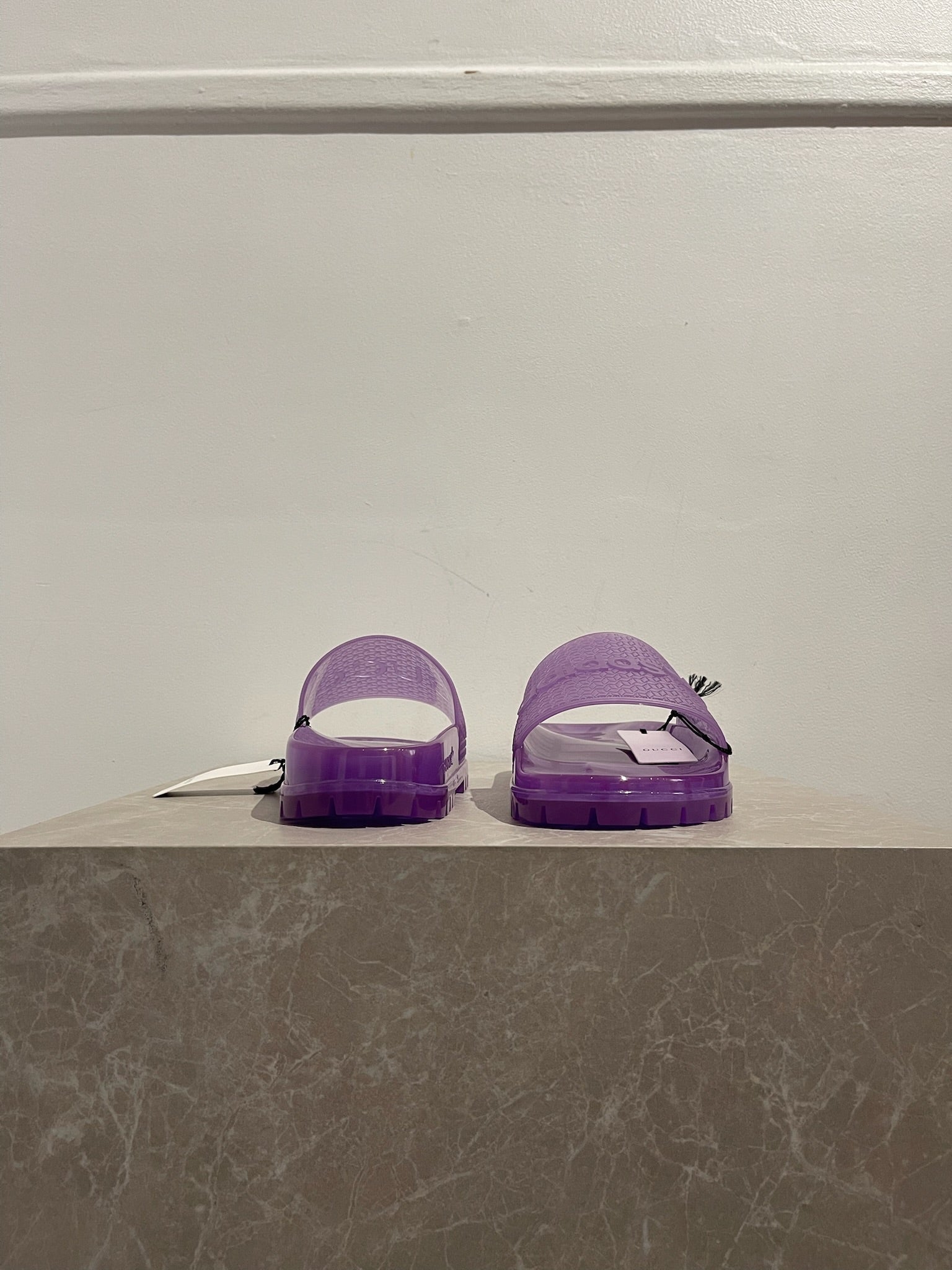Mules en caoutchouc violet transparent. Signature Gucci à l'avant et sur les semelles. Semelle crantées.