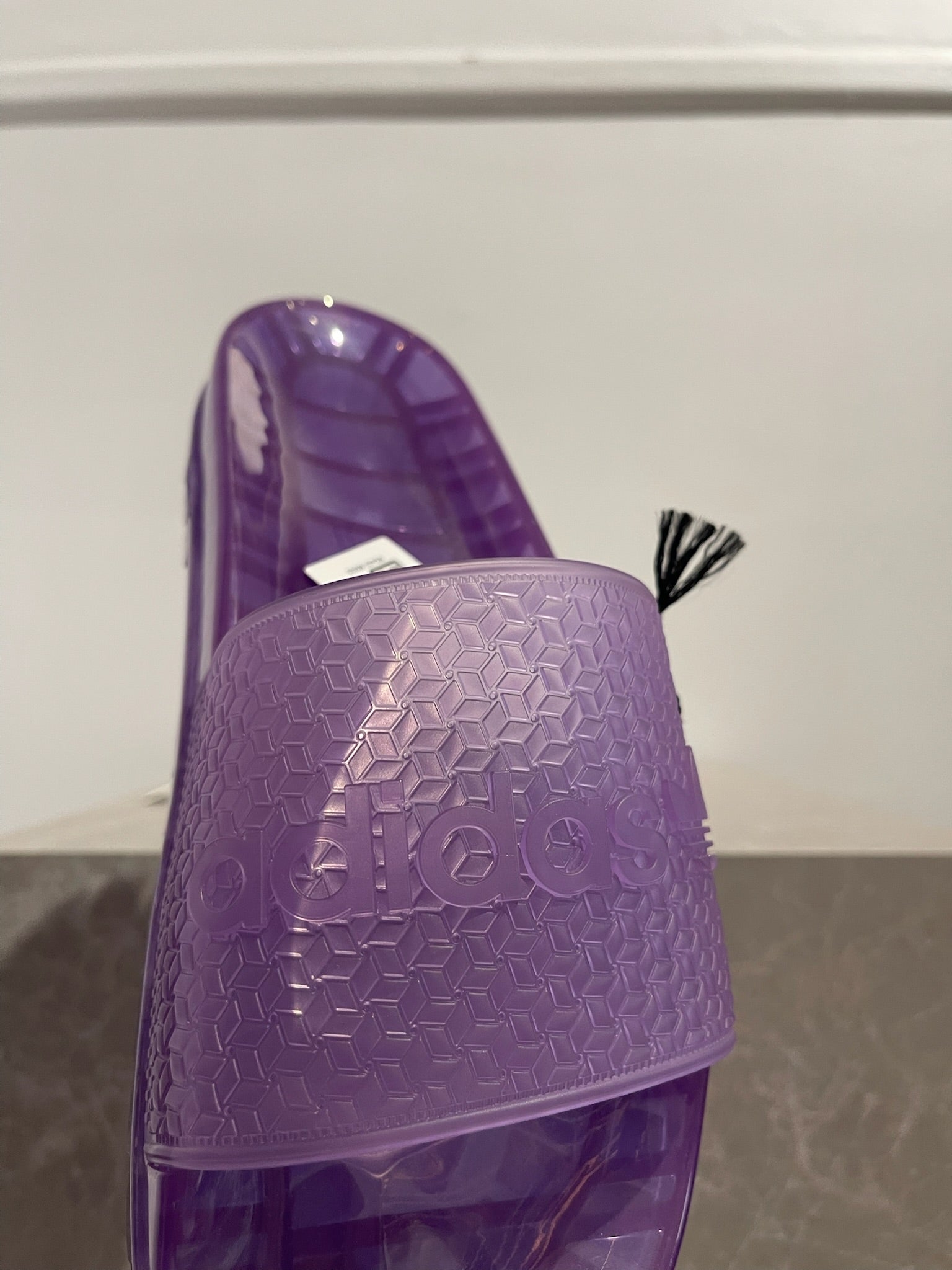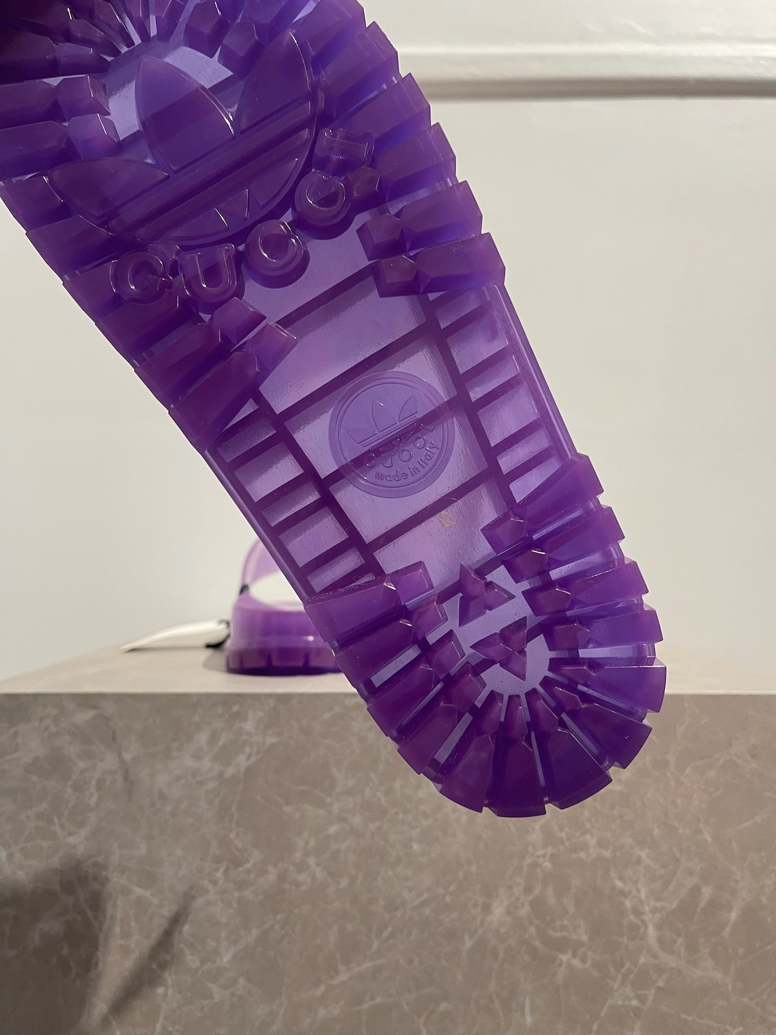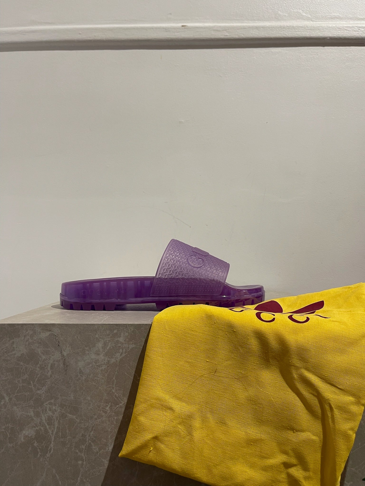 Mules en caoutchouc violet transparent. Signature Gucci à l'avant et sur les semelles. Semelle crantées.