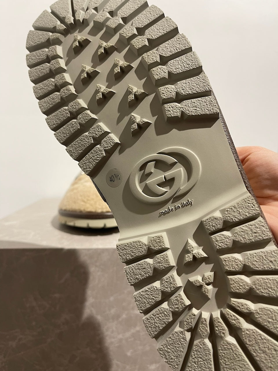 Mules en laine bouclée beige signée The North Face Gucci à l'avant. Semelles en caoutchouc beige. Détails de mors.