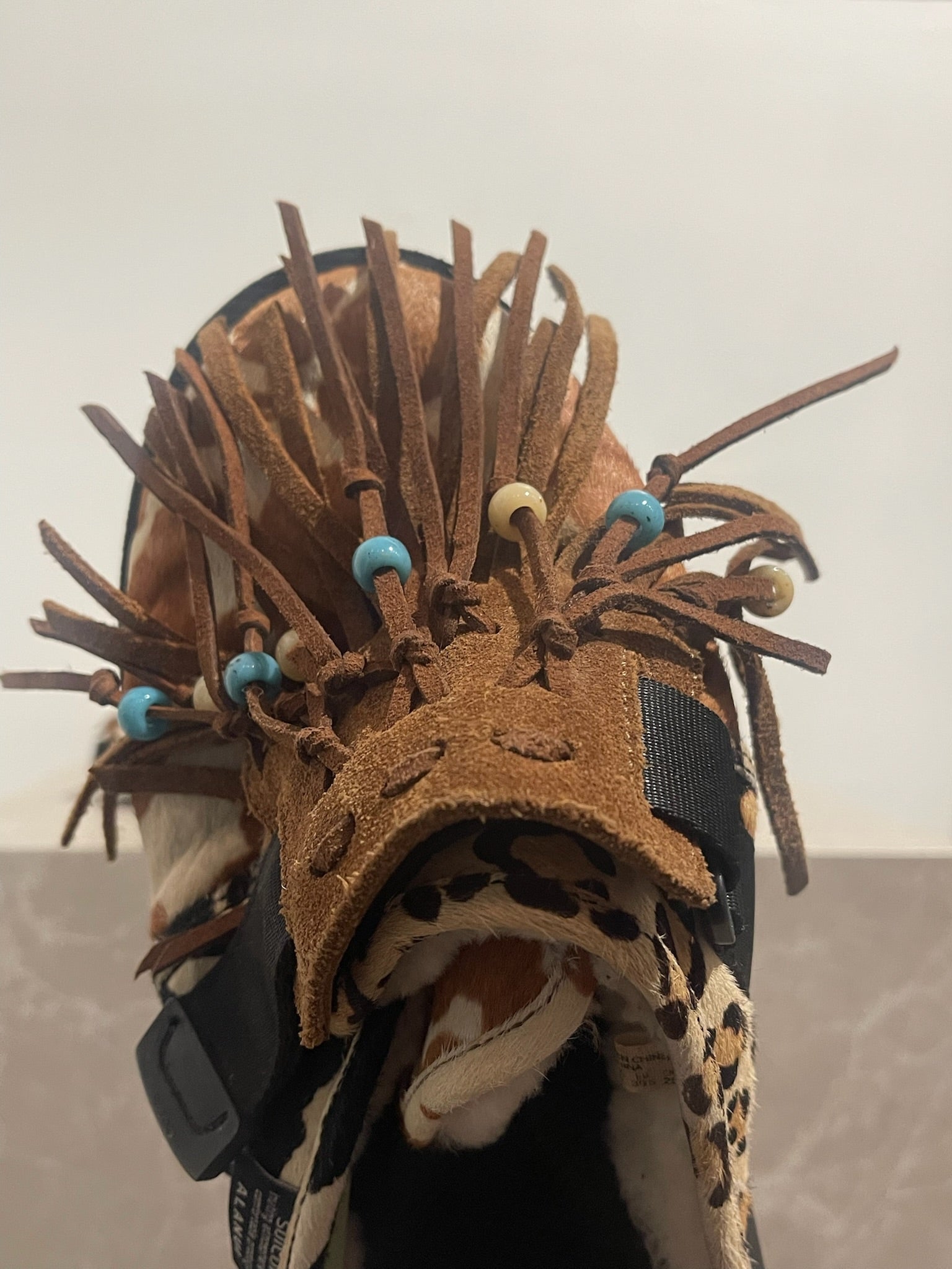 Mules en daim et poulain à motif animalier : vache et zèbre. Franges ornées de perles bleu sur le dessus. Intérieur fourrée, semelles en caoutchouc.