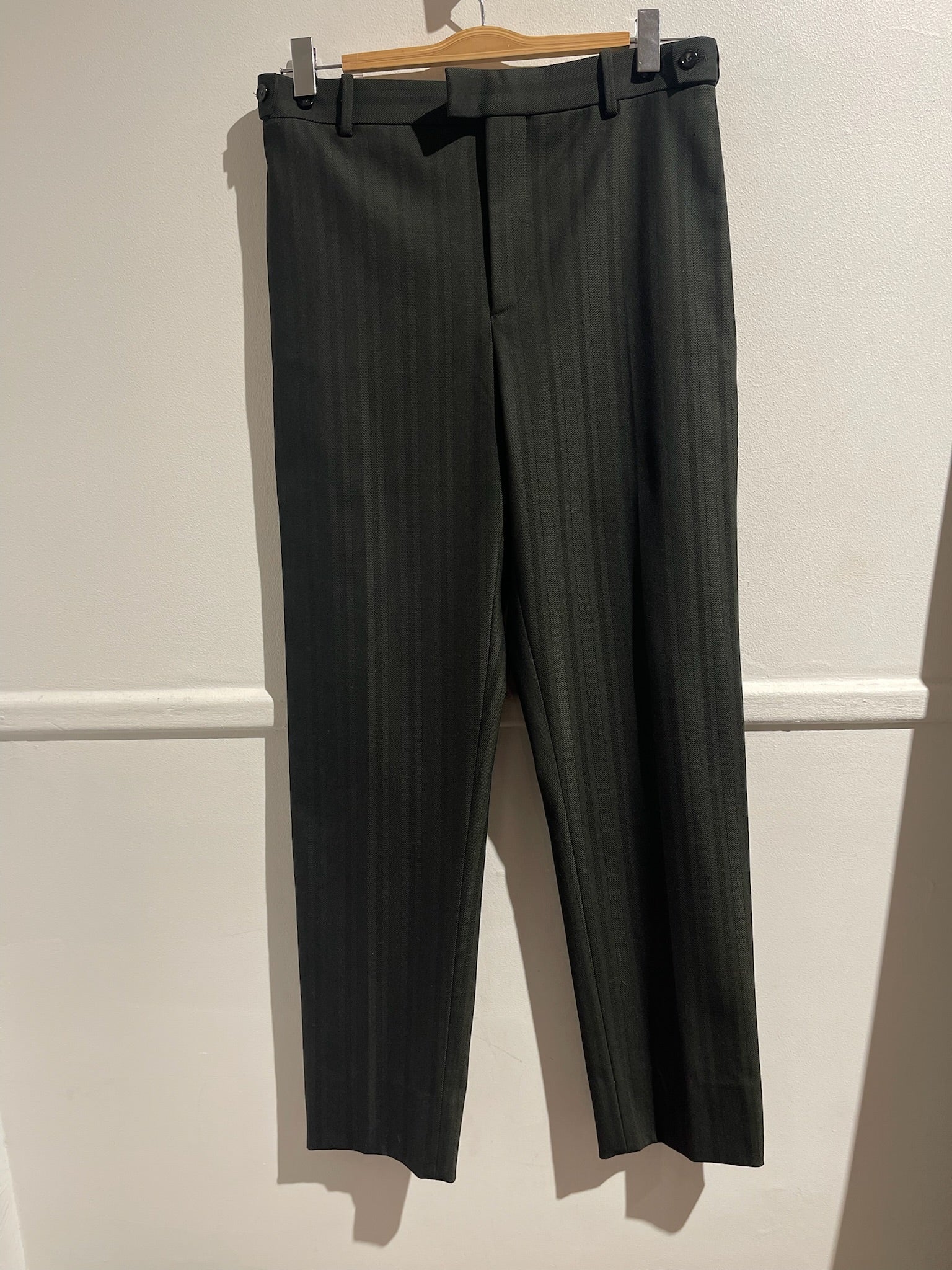 Pantalon en laine et polyamide à rayures kaki. Détails boutons sur les cotés de la taille. Poches latérales et poche plaquée à l'arrière orné du logo V de Bottega Veneta. Coupe droite.