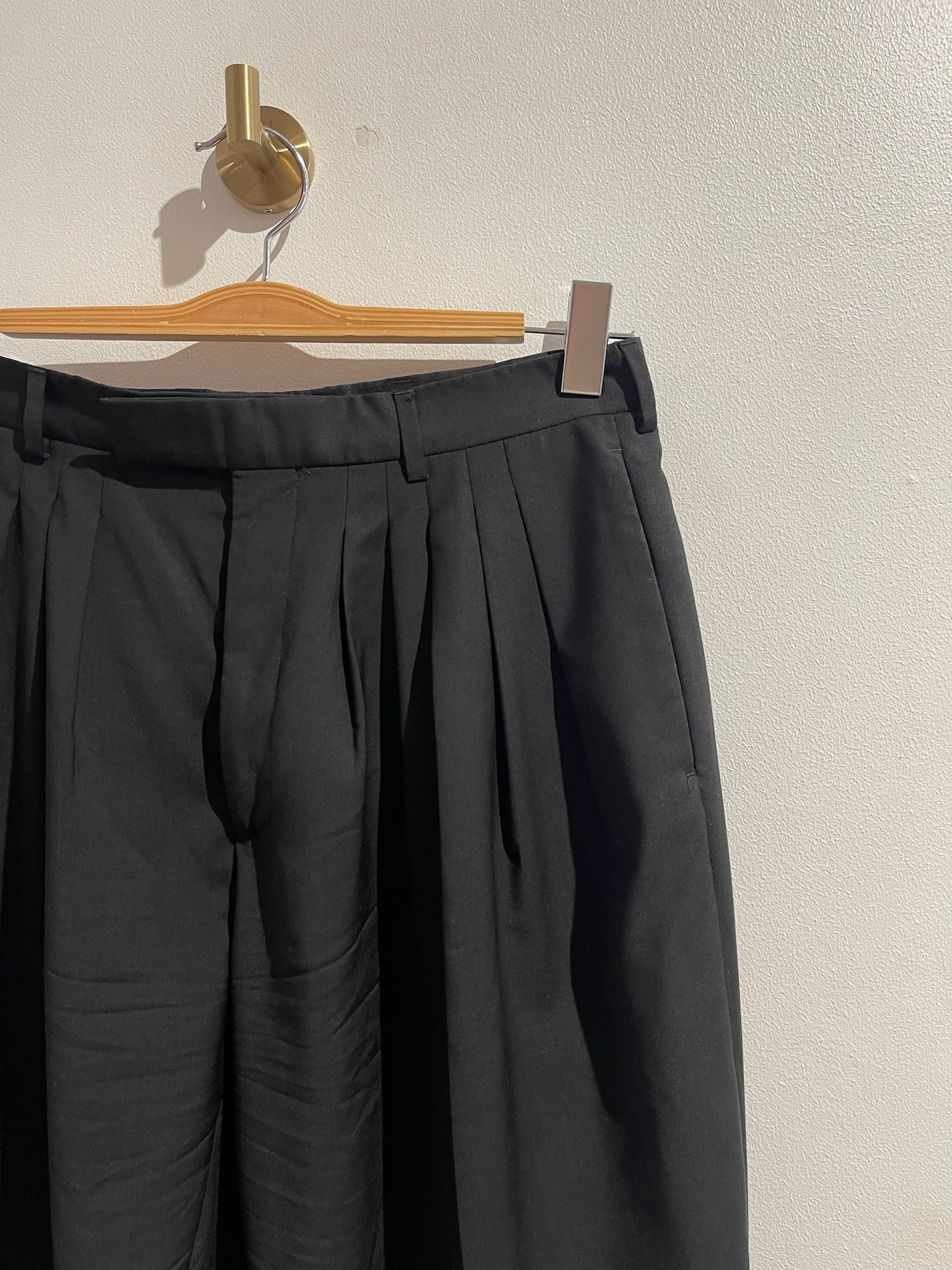 Pantalon en laine noire avec fermeture par zip, crochet et bouton à la taille, poches latérales et poches arrière. Détails de plis au niveau de la taille. Ourlets bruts. Coupe fuselée.