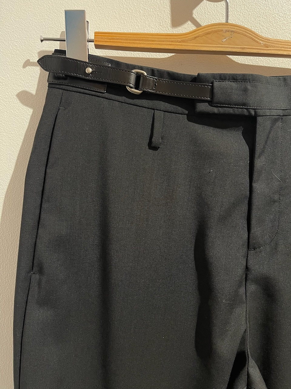 Pantalon en laine noir avec fermeture zippée, bouton et agrafe. Boucle en cuir et métal argent sur le côté. Poches latérales et poches arrière. Coupe droite.