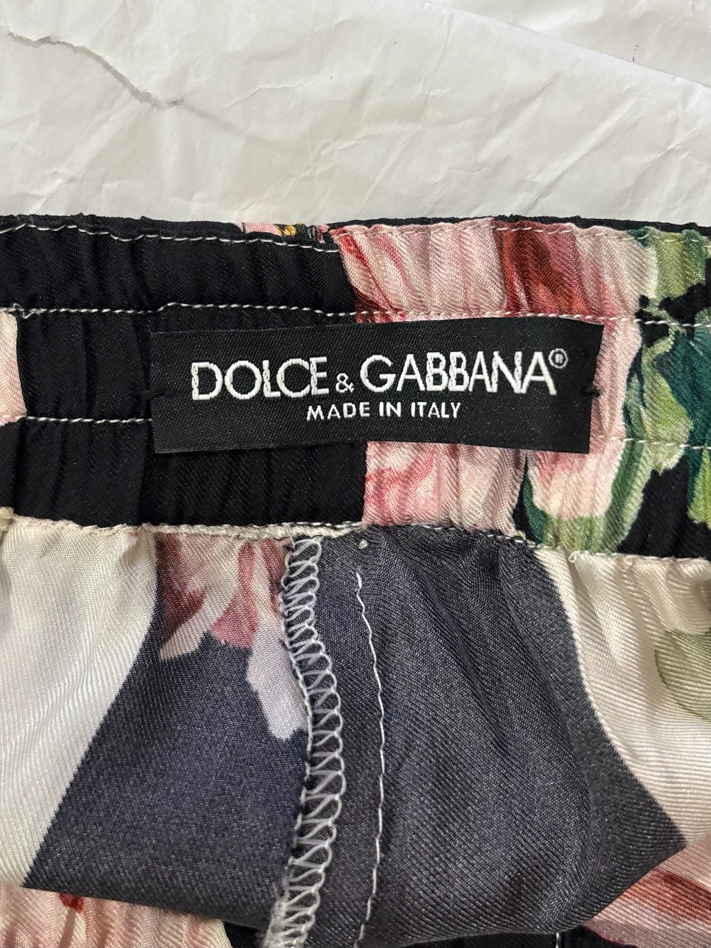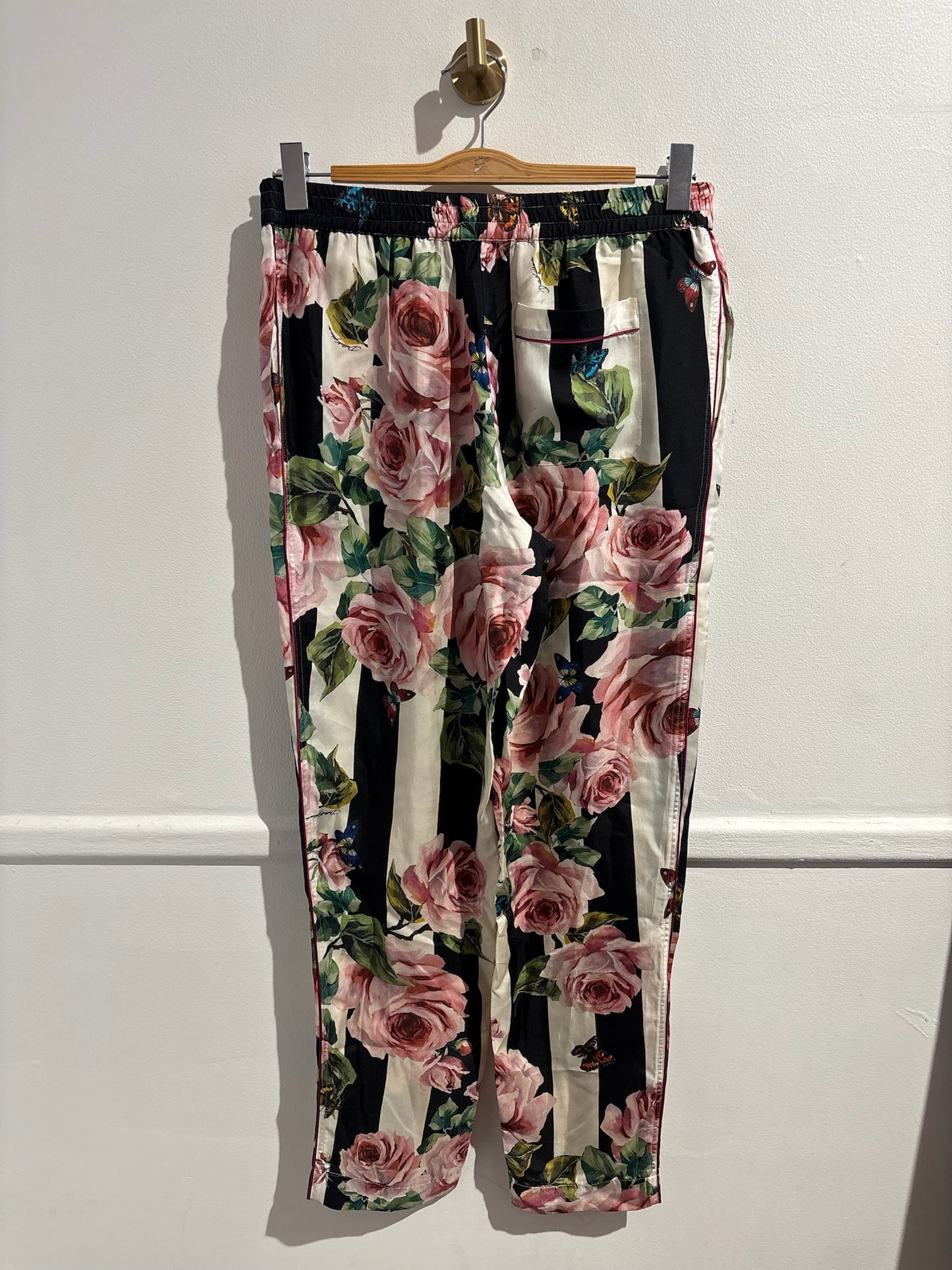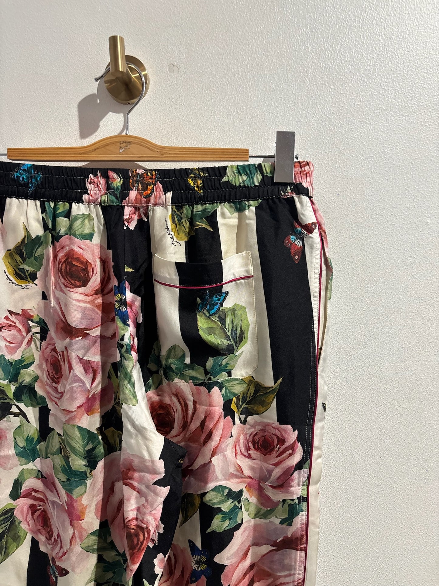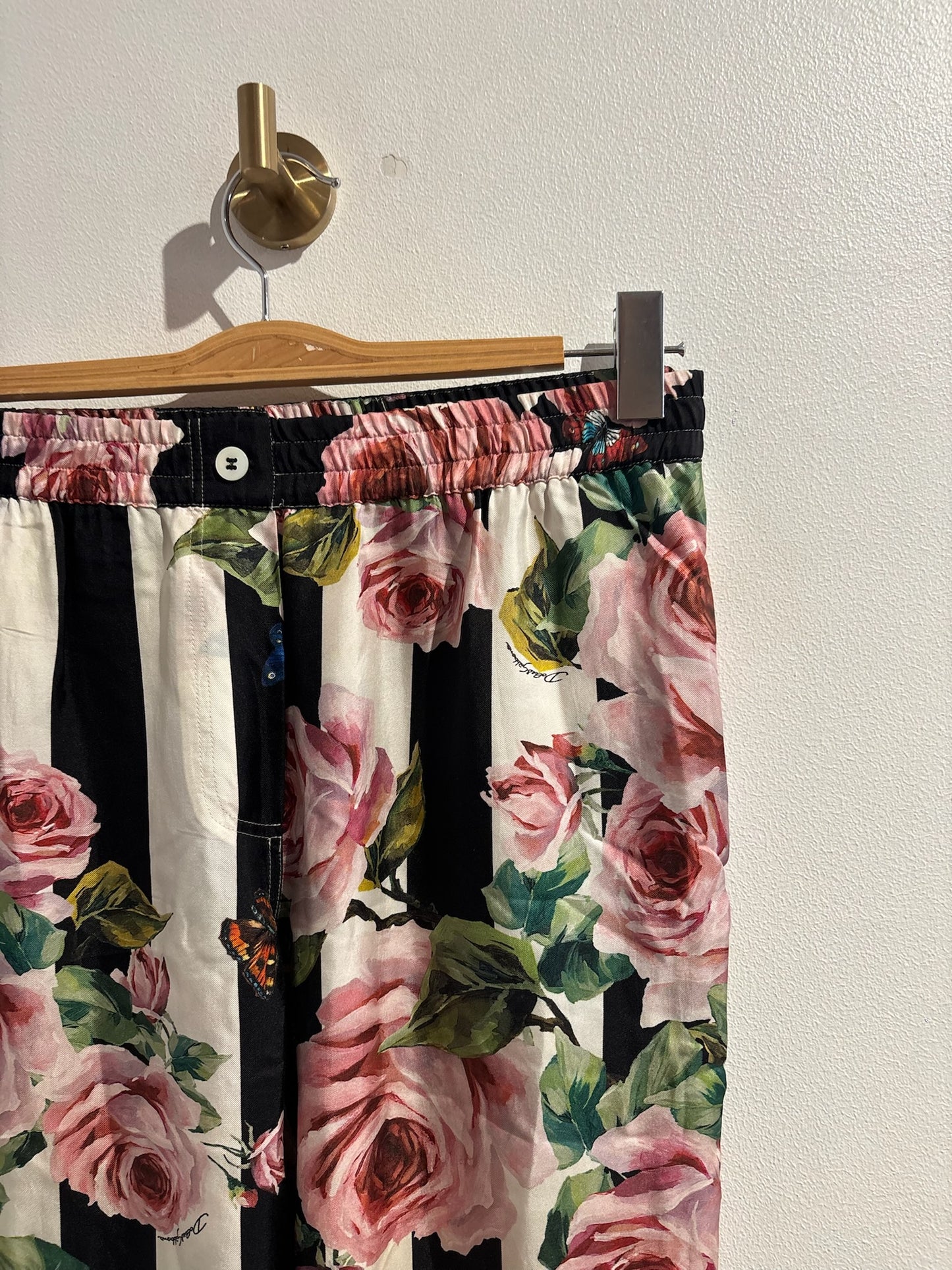 Pantalon en tissu fluide noir et blanc à rayures et à motifs à fleurs roses et papillons. Taille élastique, poches latérales et poche arrière.