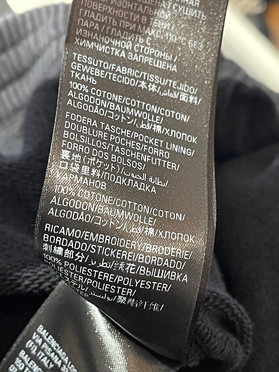 Pantalon de jogging en coton noir délavé avec taille élastique à lien de serrage et poches latérales. Logo Balenciaga brodé sur le côté. Coupe large. Modèle unisexe.