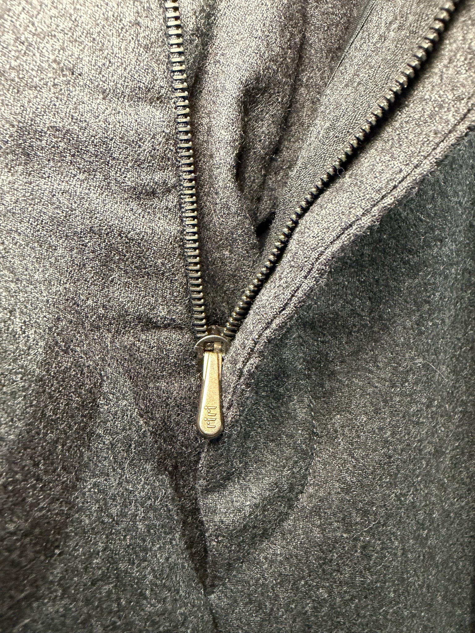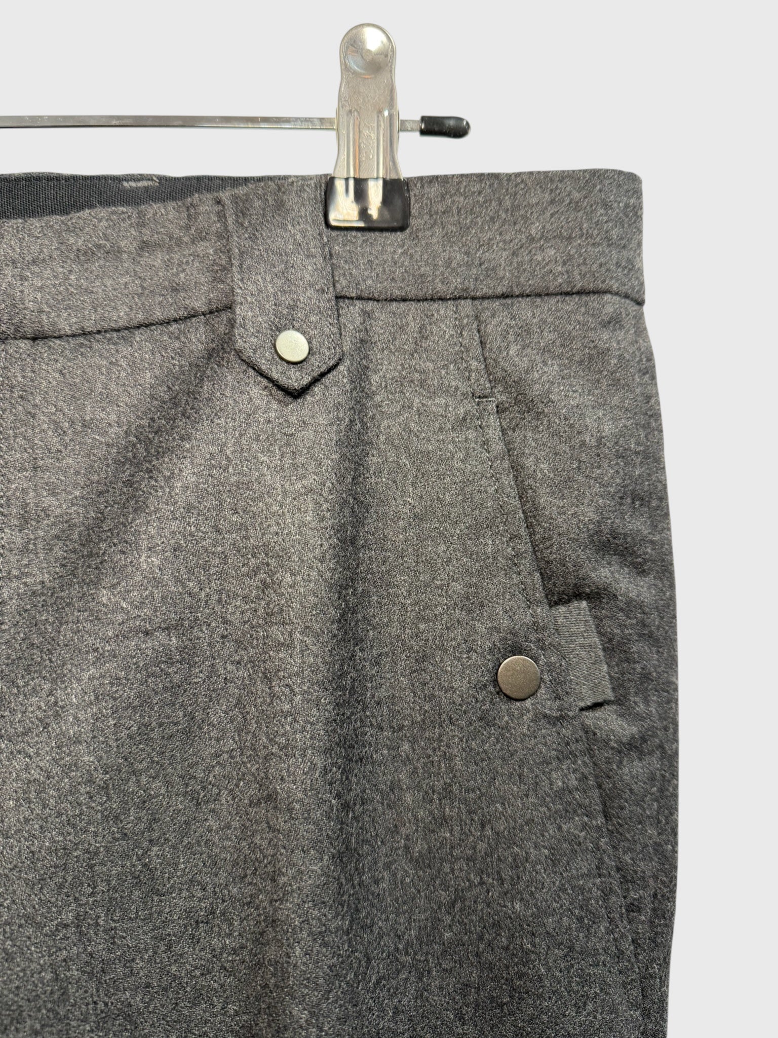 Pantalon en laine et cachemire gris. Fermeture par zip, bouton et crochet. Poches latérales à l'avant et poche plate a l'arrière.