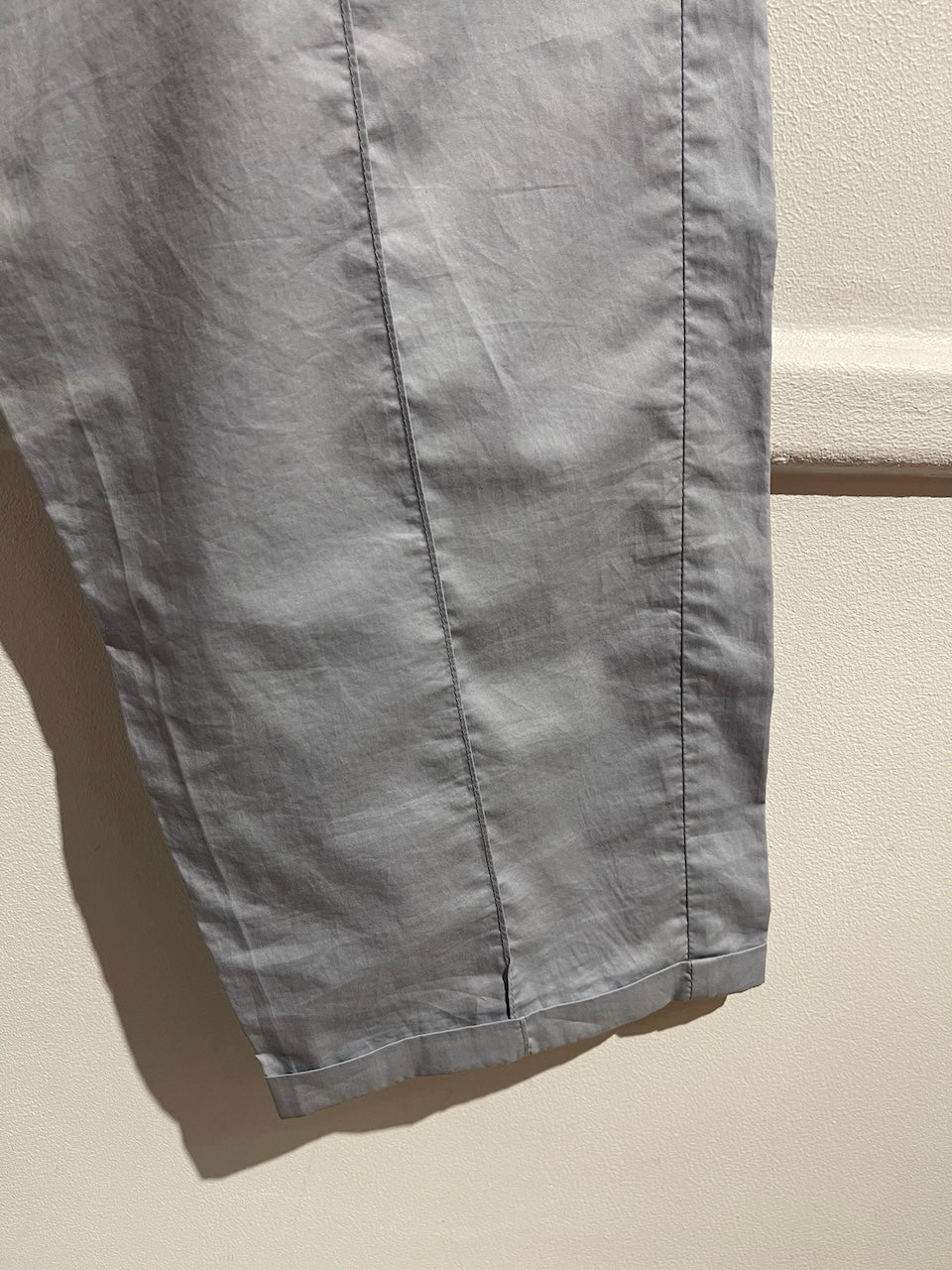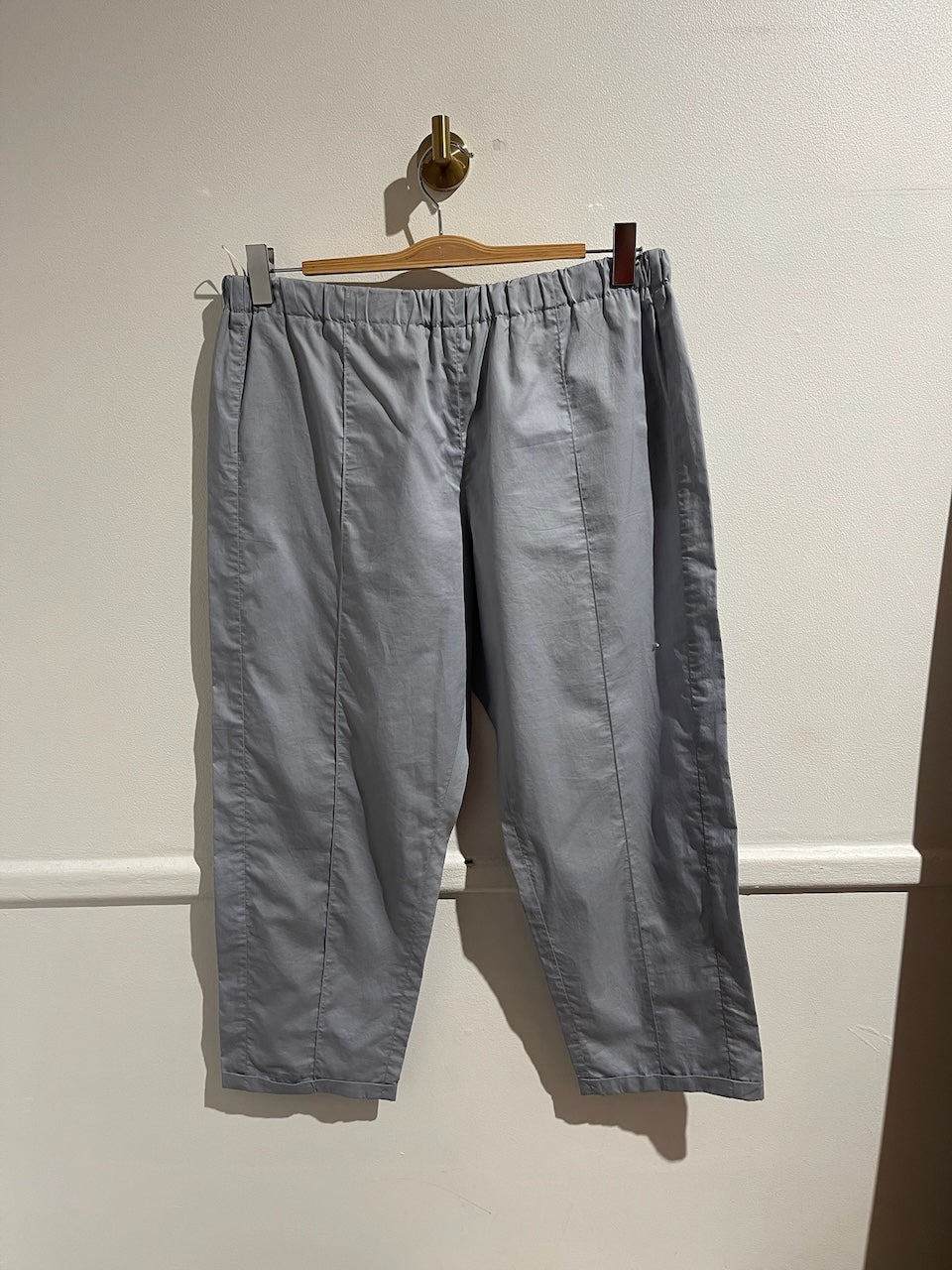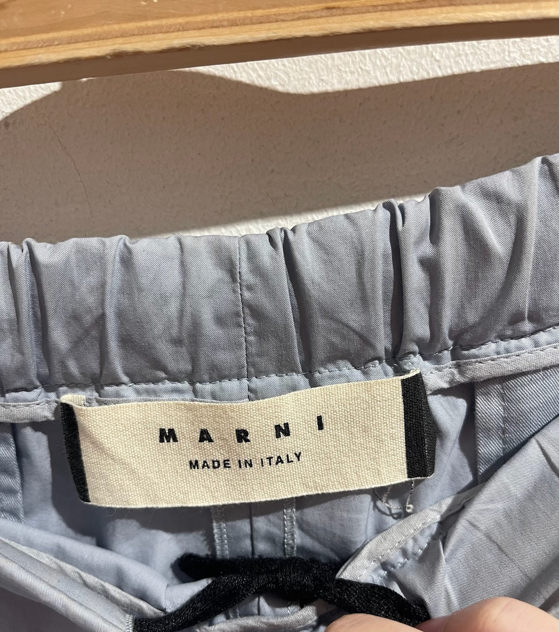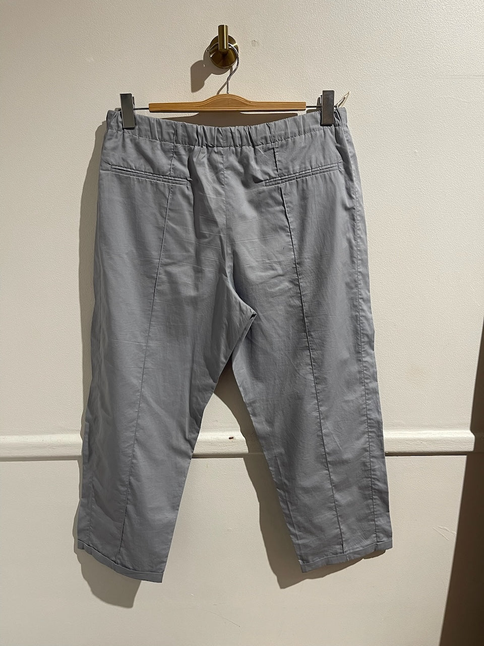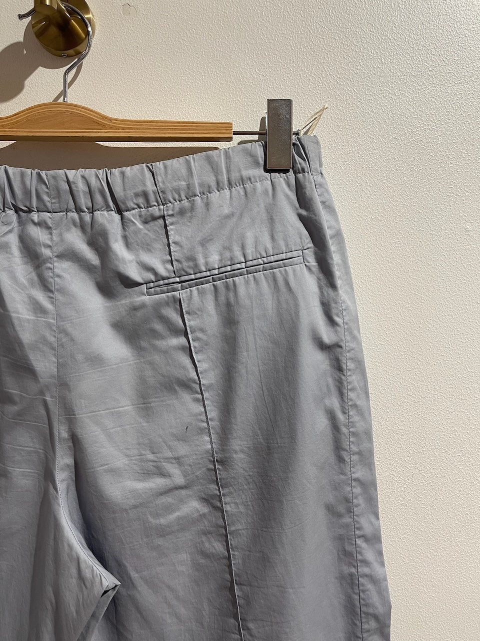 Pantalon en tissu bleu à lien de serrage dissimulé à la taille. Coupe courte.