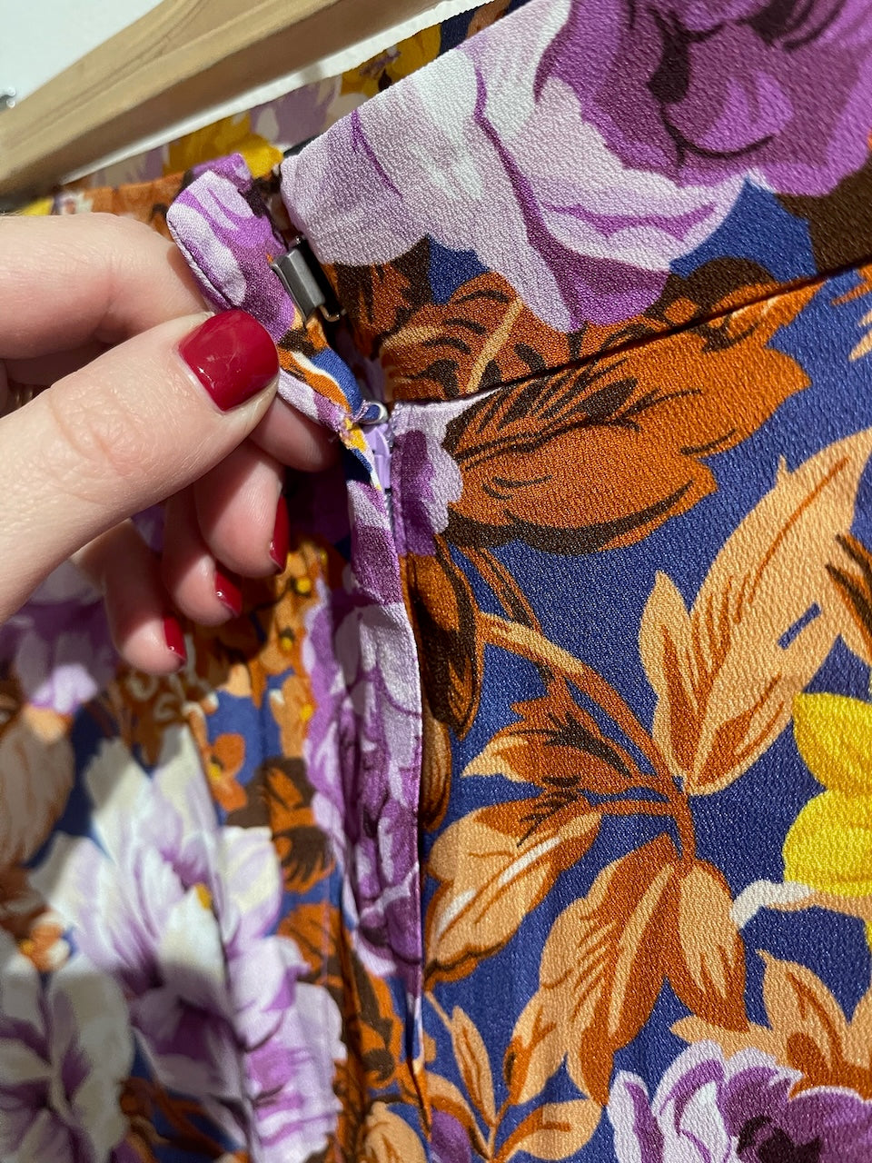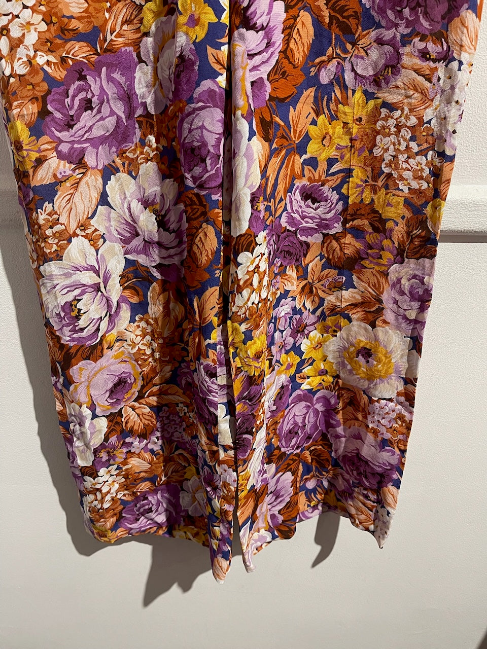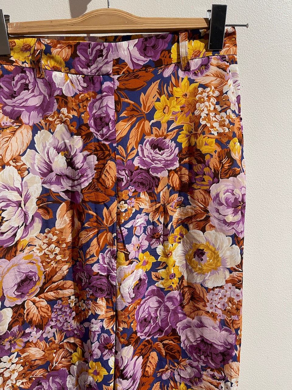 Pantalon en viscose imprimé fleurs multicolores avec fermeture zippée et crochet à la taille, poches latérales et poches arrière. Coupe droite.