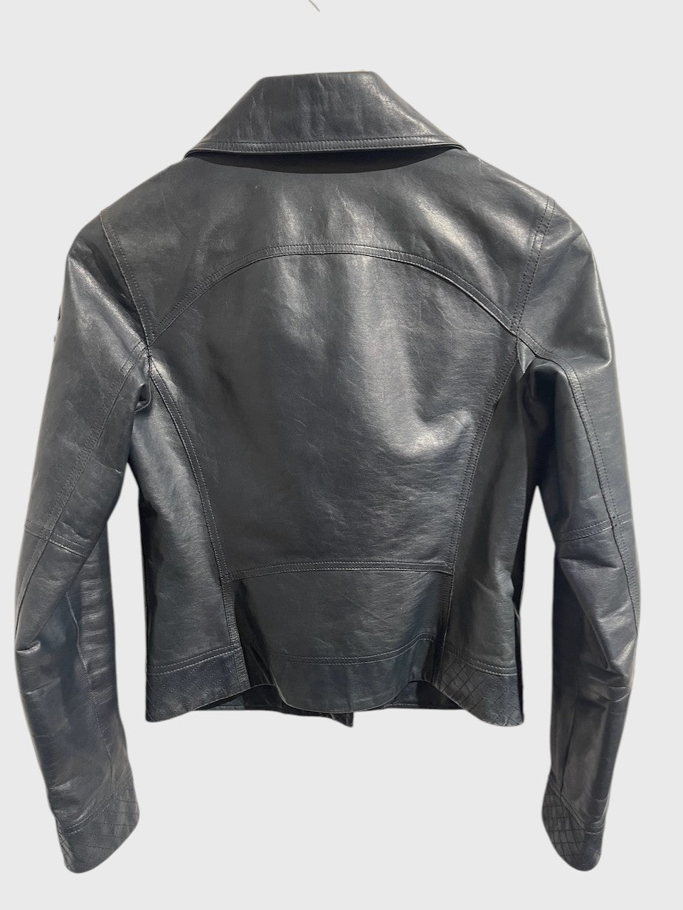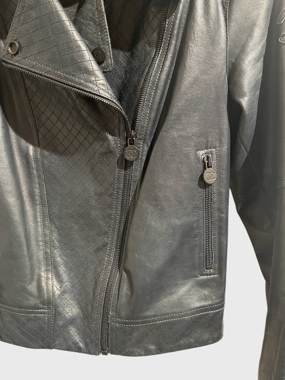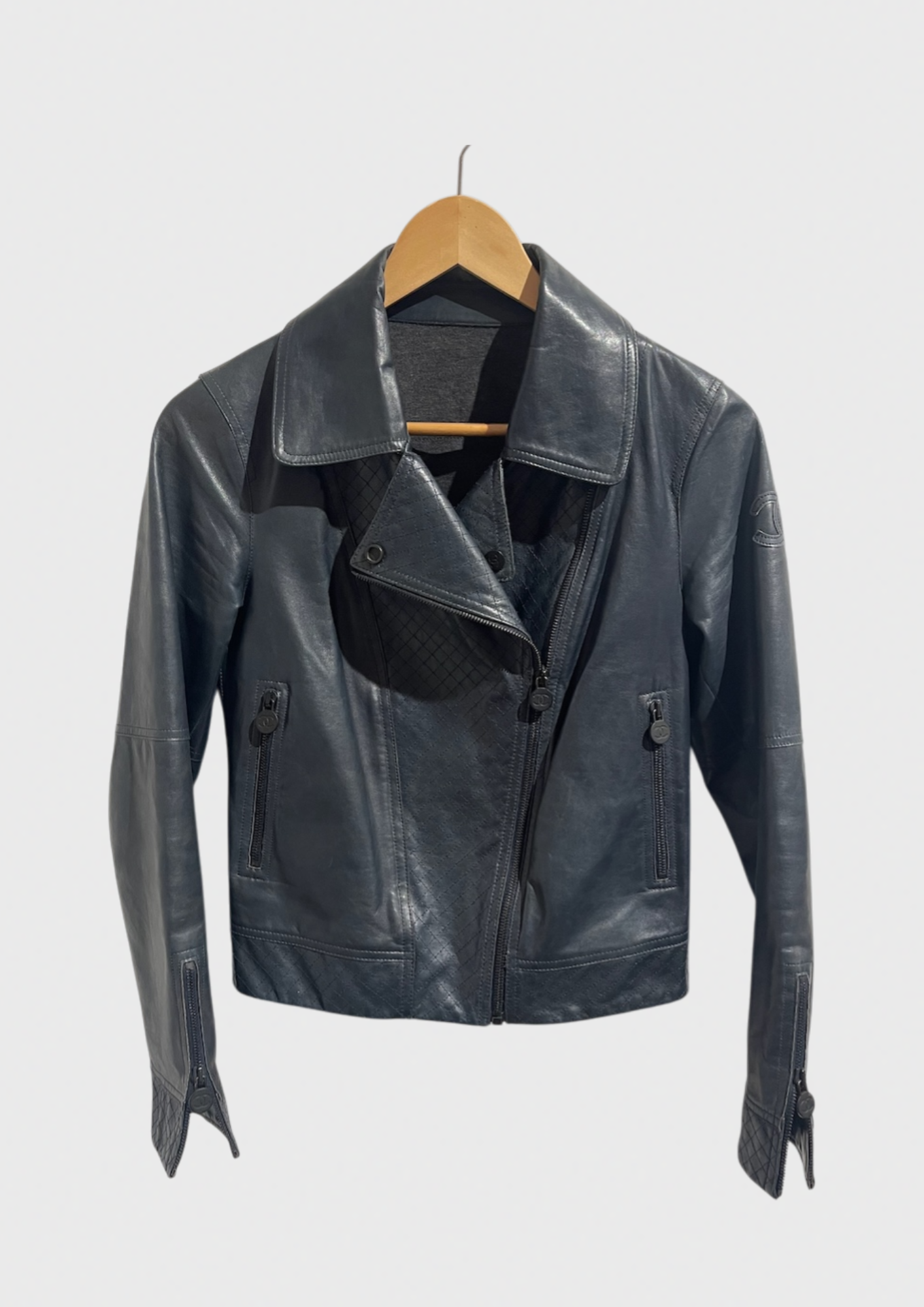 Veste perfecto en cuir bleu pétrole avec détails de surpiqûres matelassé et logo CC à l'épaule. Fermeture zippée et poches latérales zippées. Poignets zippées. Coupe ajustée. Intérieur doublure en coton.