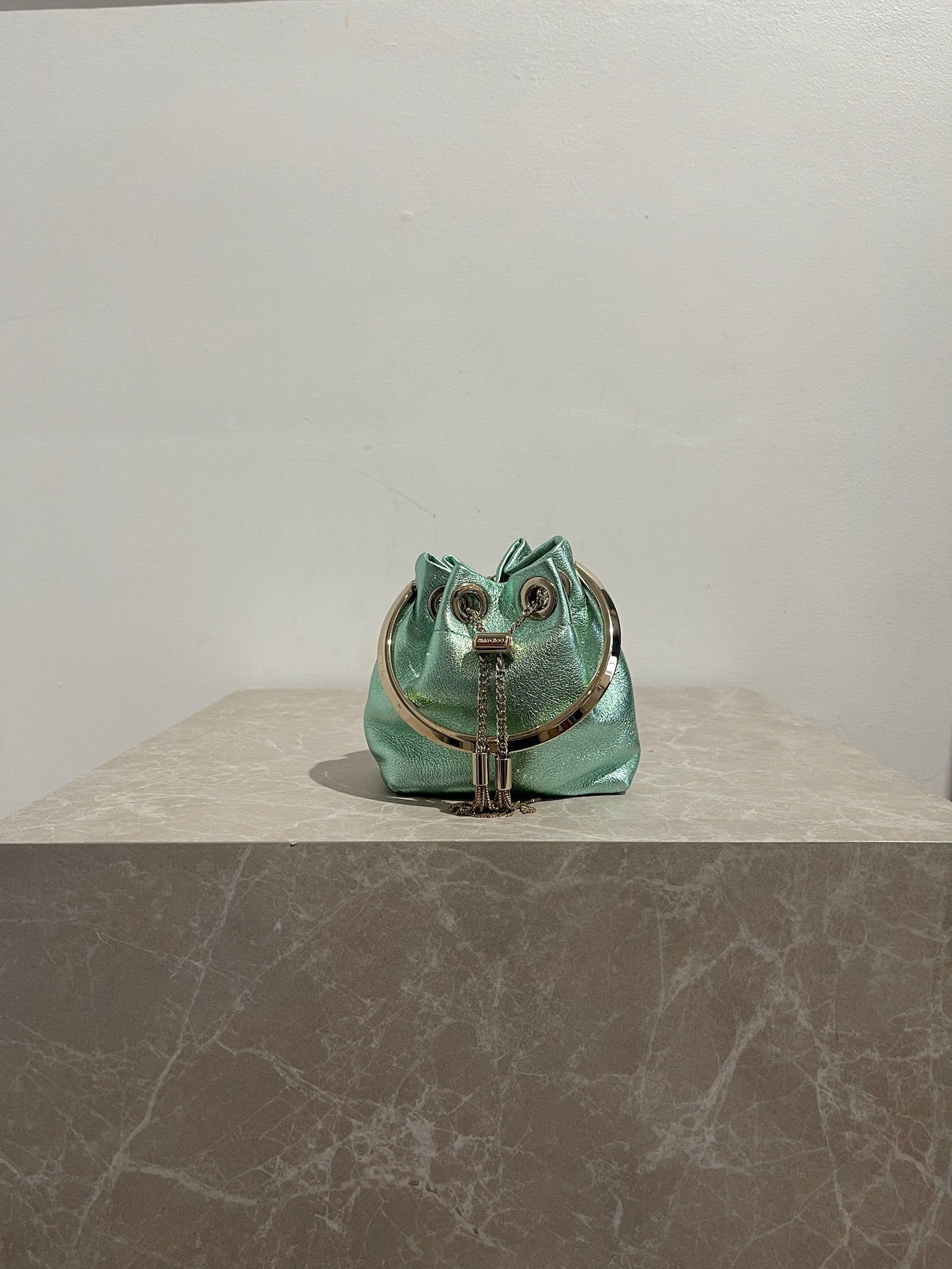 Sac en cuir métallisé vert, porté main ou en bandoulière. Possibilité de le fermer avec un lien de serrage en chaine doré.