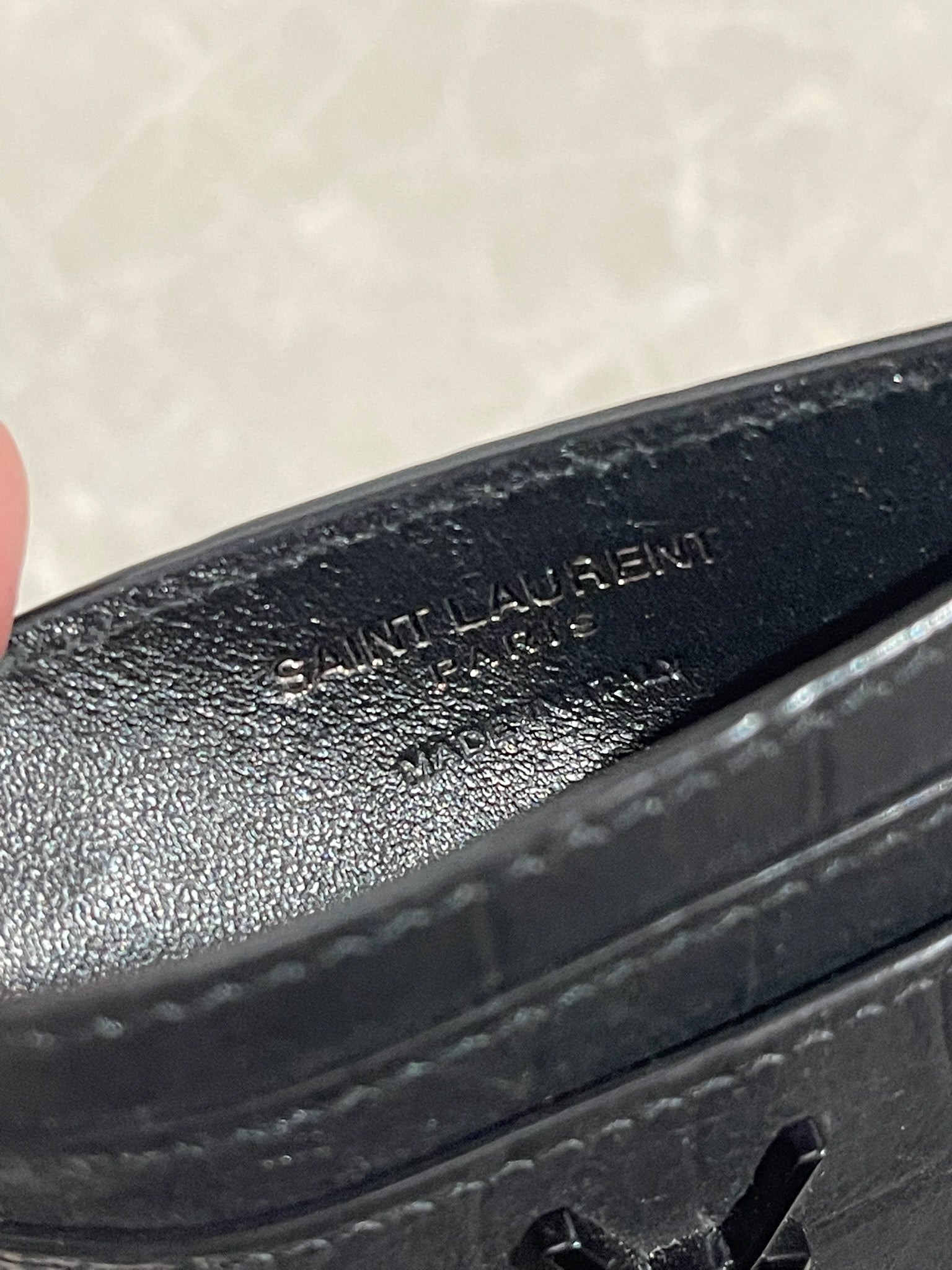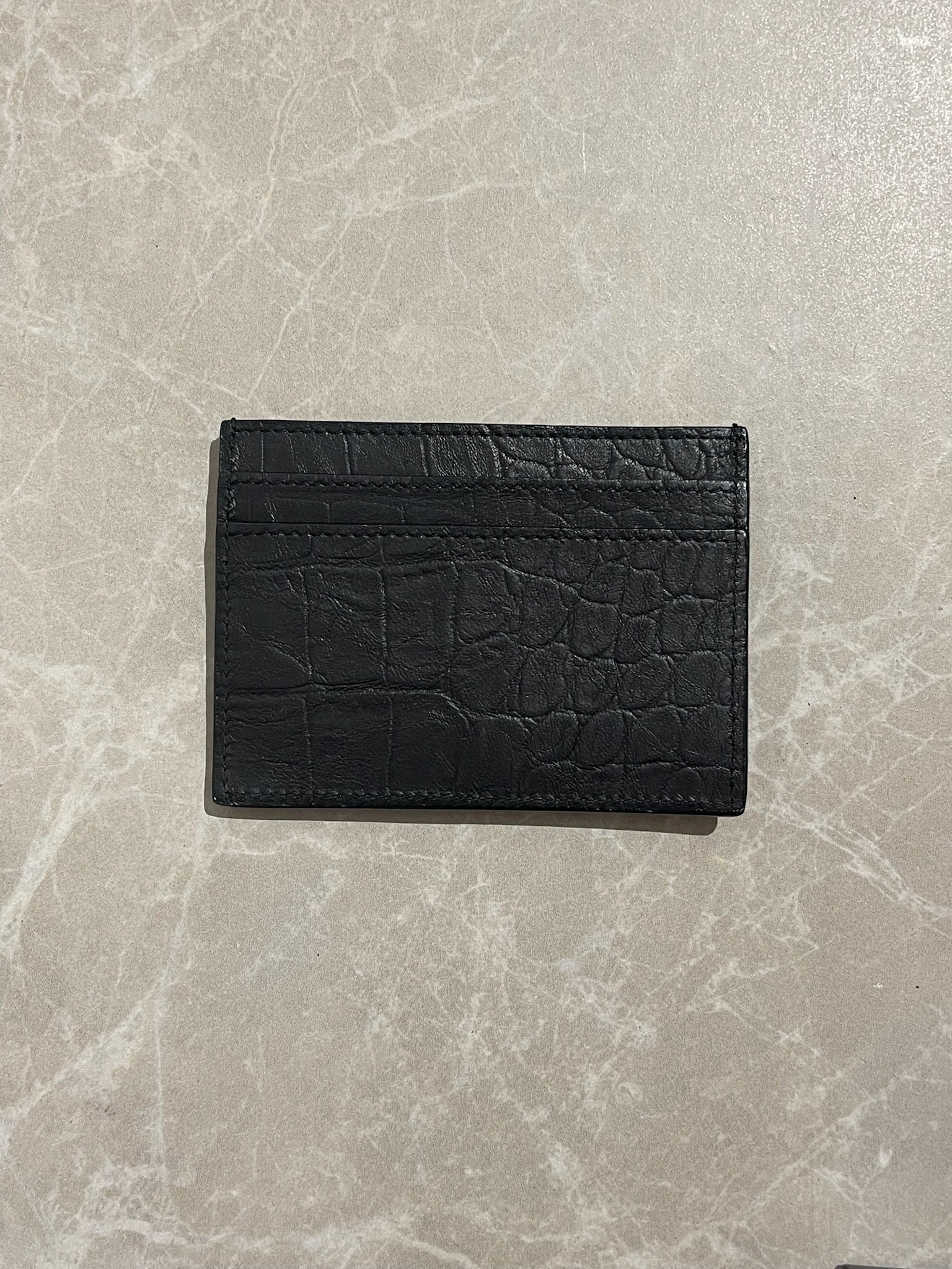 Porte-cartes en cuir embossé croco noir orné du logo YSL en metal noir. Emplacements pour les cartes.