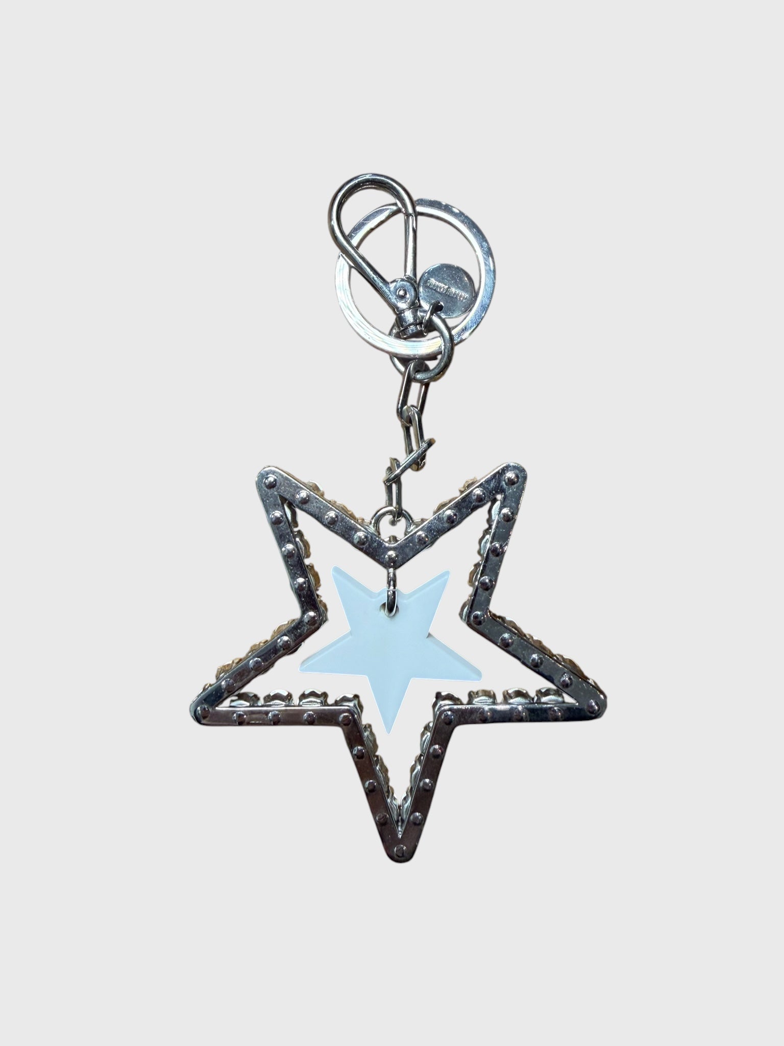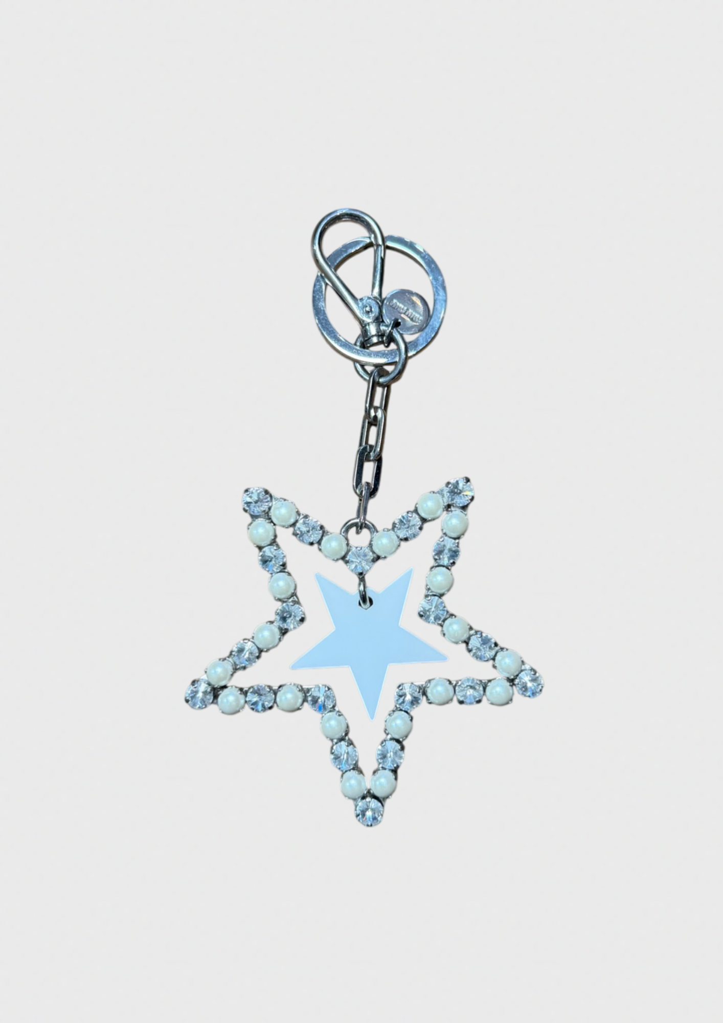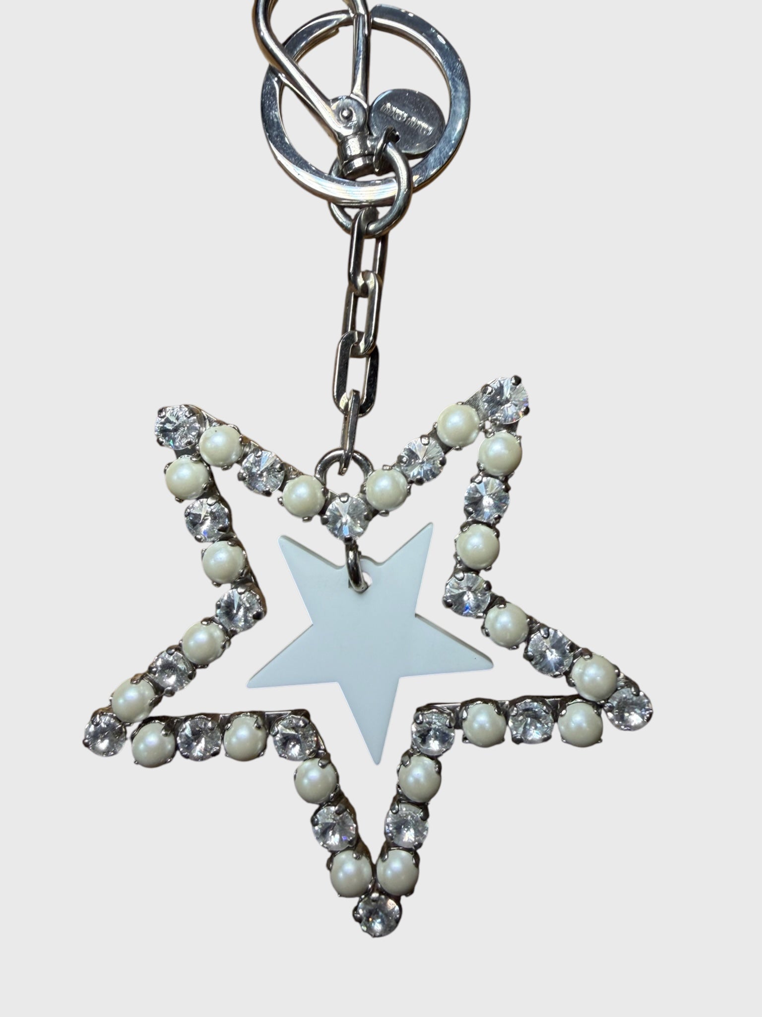 Porte-clefs en métal argenté, motif étoile avec perle nacrée et cristaux. Mousqueton signé Miu Miu.