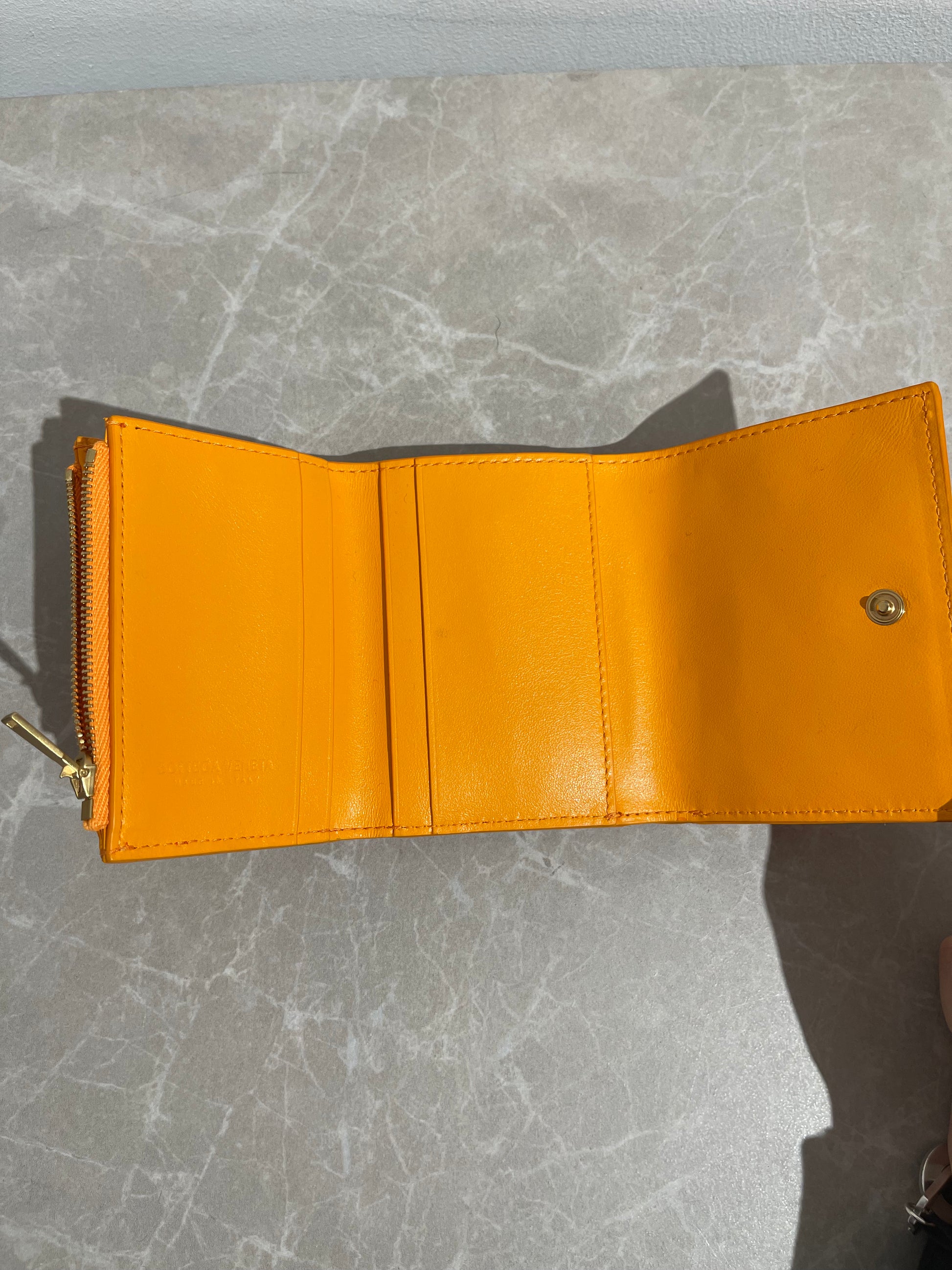 Porte-monnaie en cuir intrecciato orange. Rangements pour cartes et poche zippée pour les pièces de monnaie. Fermeture par bouton pression.