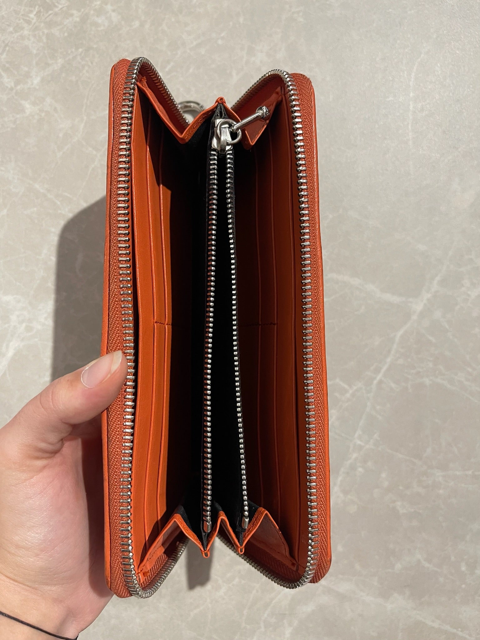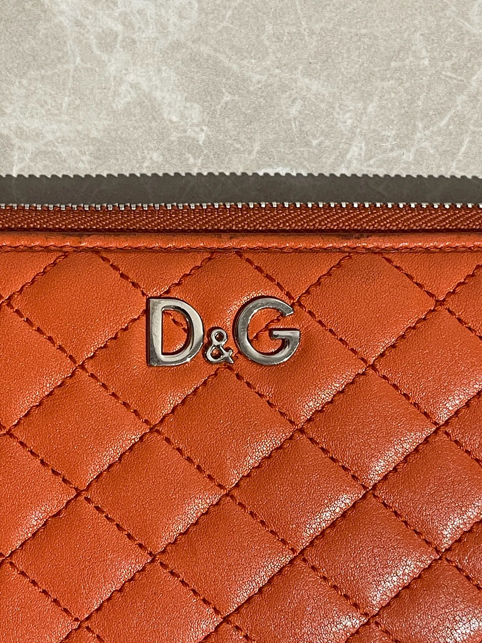 Portefeuille en cuir matelassé orange avec logo D&G en relief argenté. Fermeture zippée. Rangements pour cartes et poches zippée pour les pièces de monnaie.