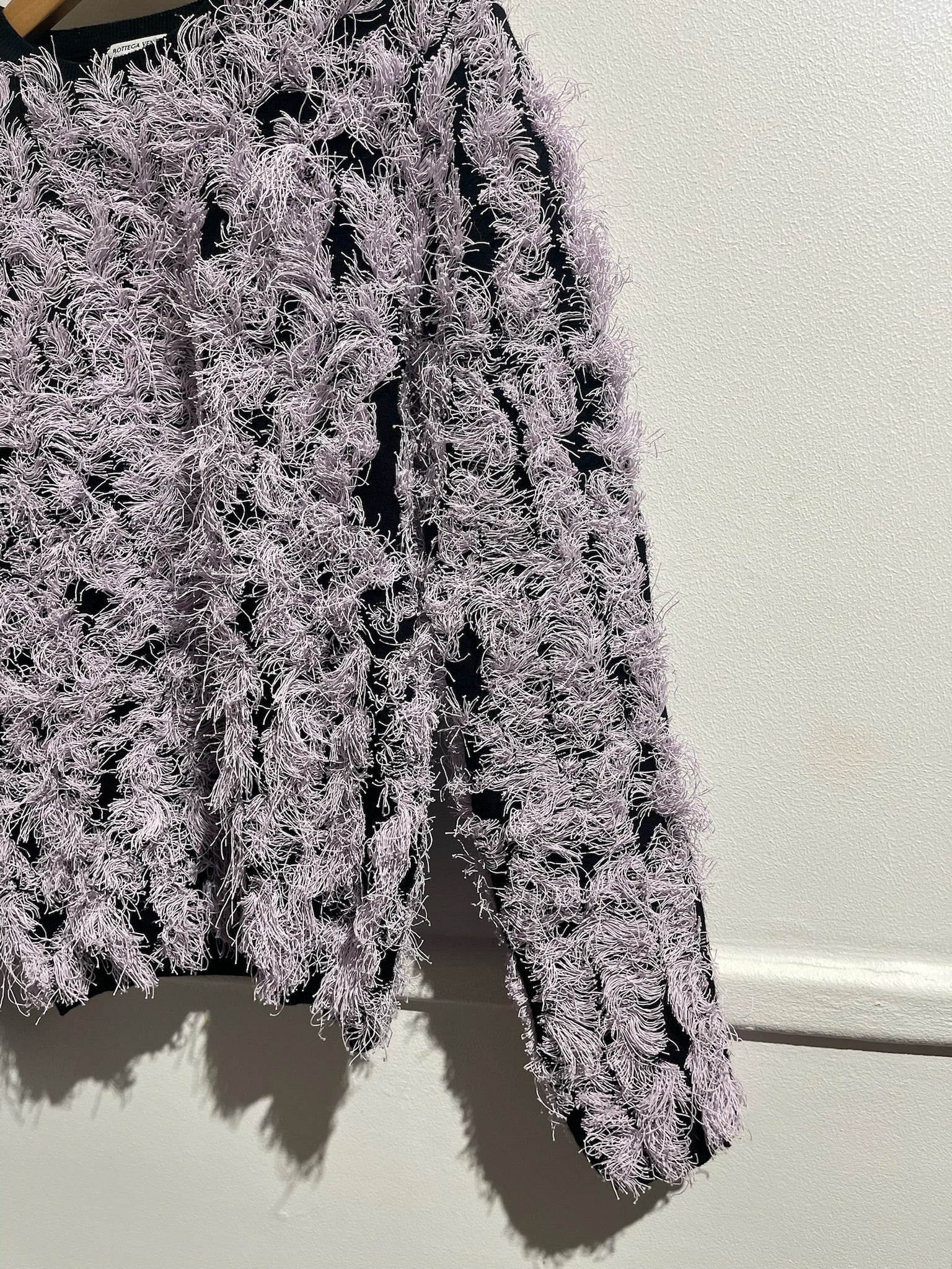 Pull en laine noire à franges élastiques violettes. Col rond en maille côtelée et manches longues.